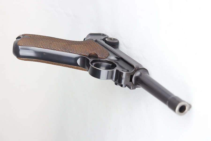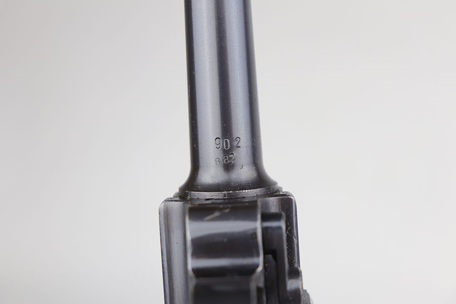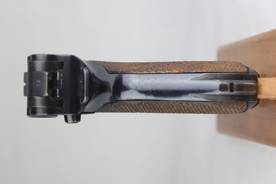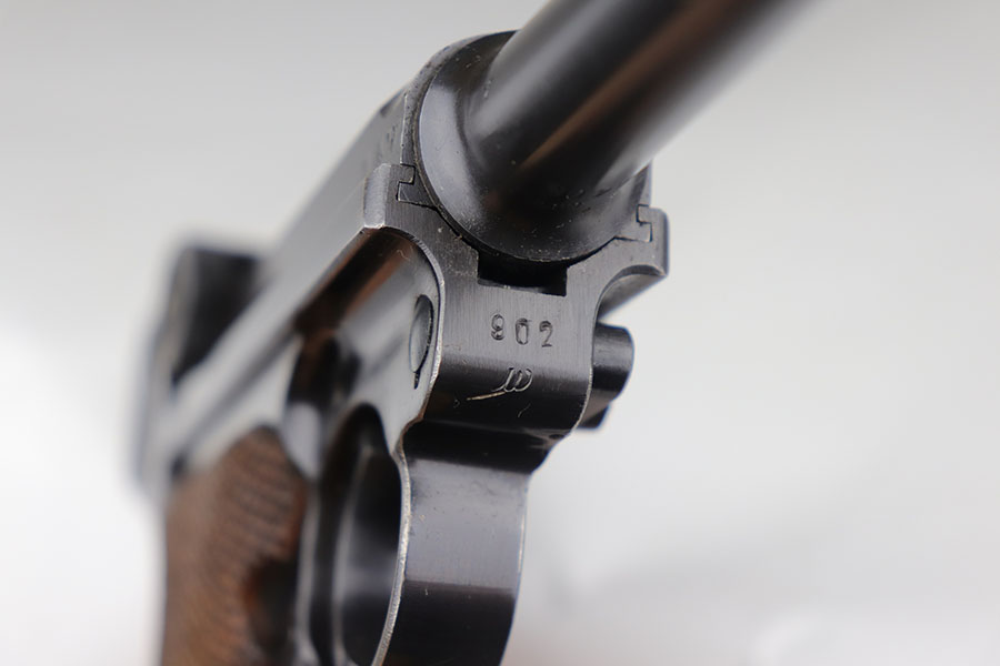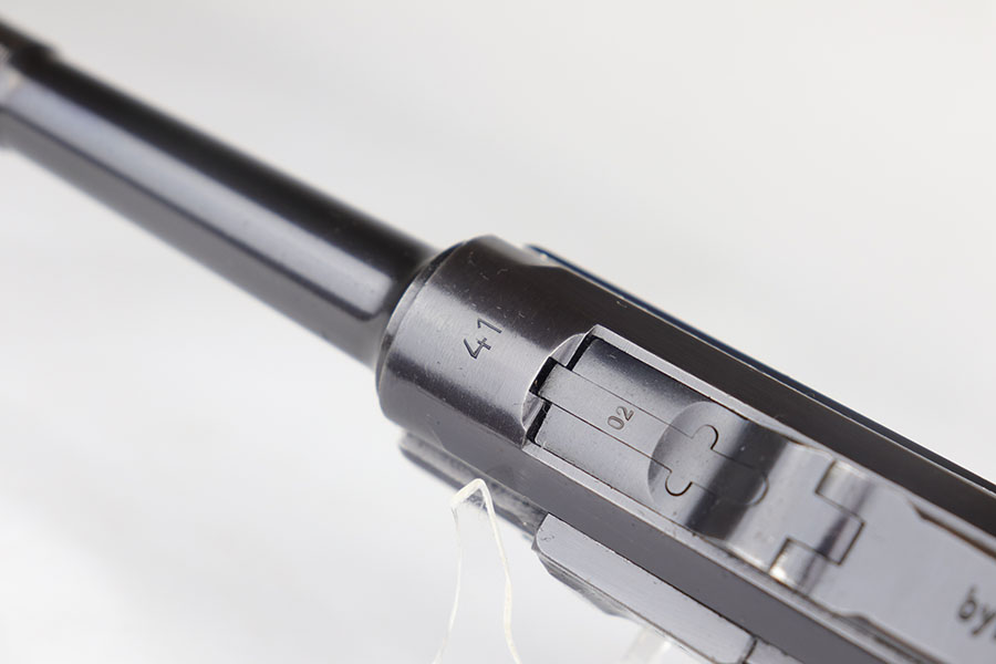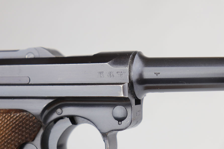 7/28/20 – This is a fantastic Mauser Luger from 1941 with tool and holster.  The pistol is all matching and original with 97-98% of the blue remaining.  There’s minor holster wear on the muzzle and sideplate, with just a few tiny dots of wear and oxidation on the back strap, as well.  The grips are numbered and matching to the pistol and in excellent condition aside from a couple of scratches on the left panel.  It has a rare, blank magazine with blank aluminum bottom.  Bore is shiny with strong rifling but does have a bit of frost.  The tool is E/655 proofed, same as the pistol.  The holster is ’41 dated with sharp waffenamt and is in great shape aside from a previous owner having scratched their name into the top flap.