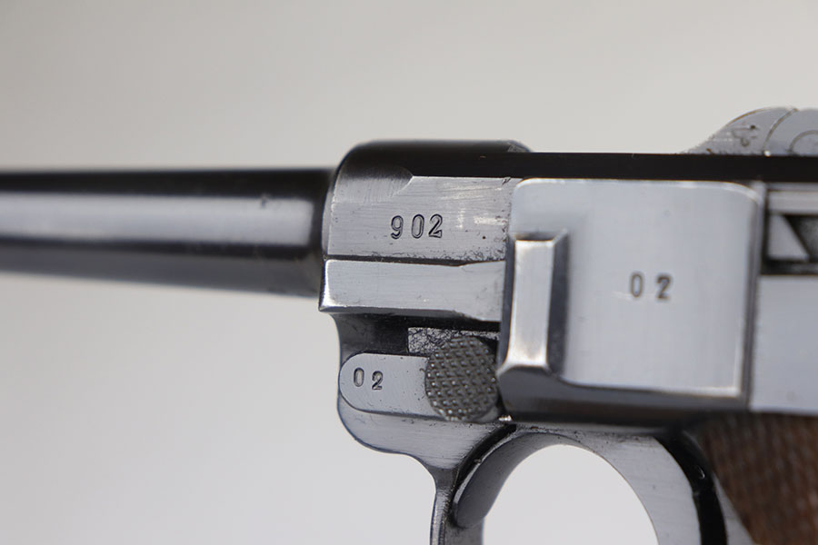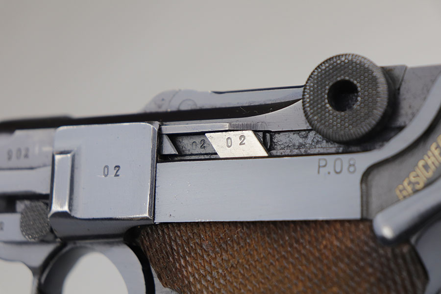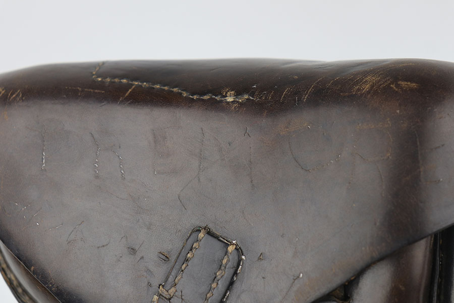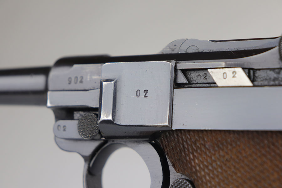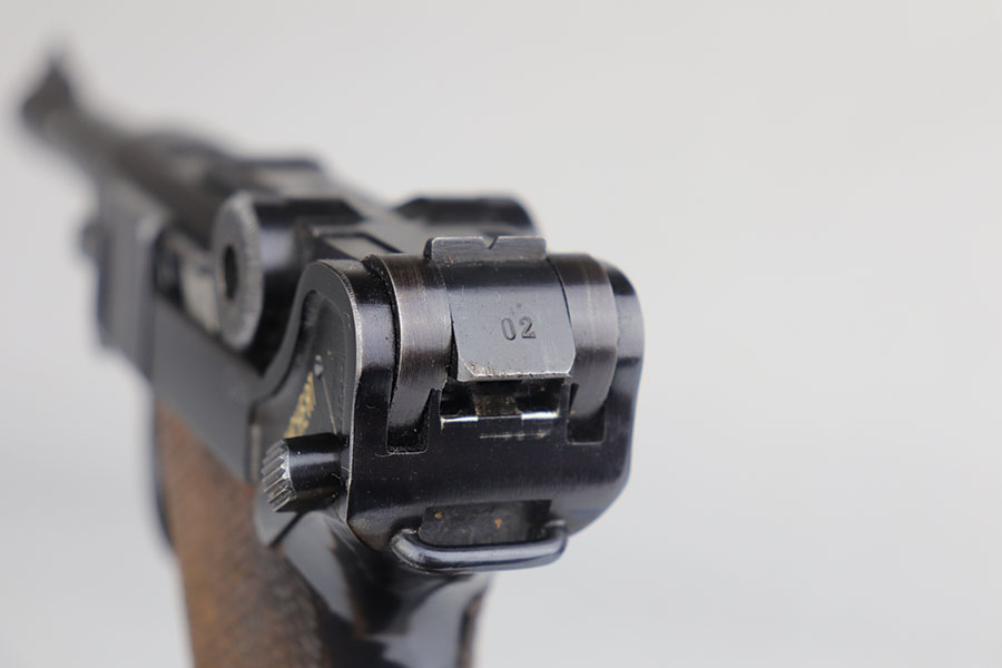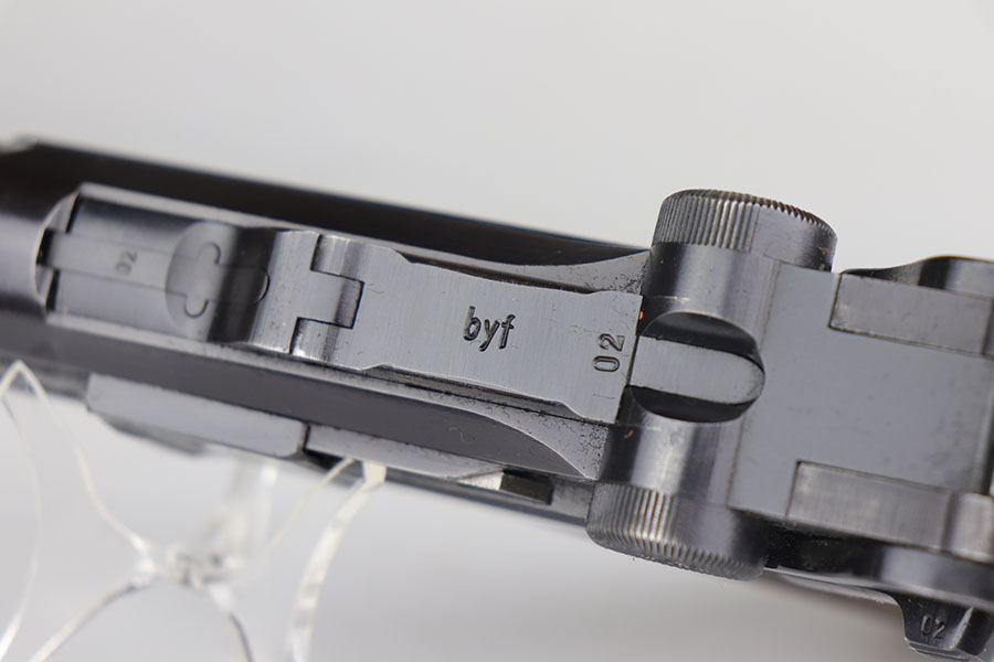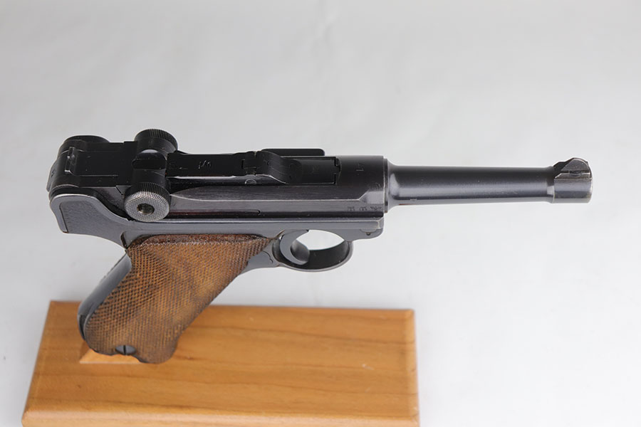 7/28/20 – This is a fantastic Mauser Luger from 1941 with tool and holster.  The pistol is all matching and original with 97-98% of the blue remaining.  There’s minor holster wear on the muzzle and sideplate, with just a few tiny dots of wear and oxidation on the back strap, as well.  The grips are numbered and matching to the pistol and in excellent condition aside from a couple of scratches on the left panel.  It has a rare, blank magazine with blank aluminum bottom.  Bore is shiny with strong rifling but does have a bit of frost.  The tool is E/655 proofed, same as the pistol.  The holster is ’41 dated with sharp waffenamt and is in great shape aside from a previous owner having scratched their name into the top flap.