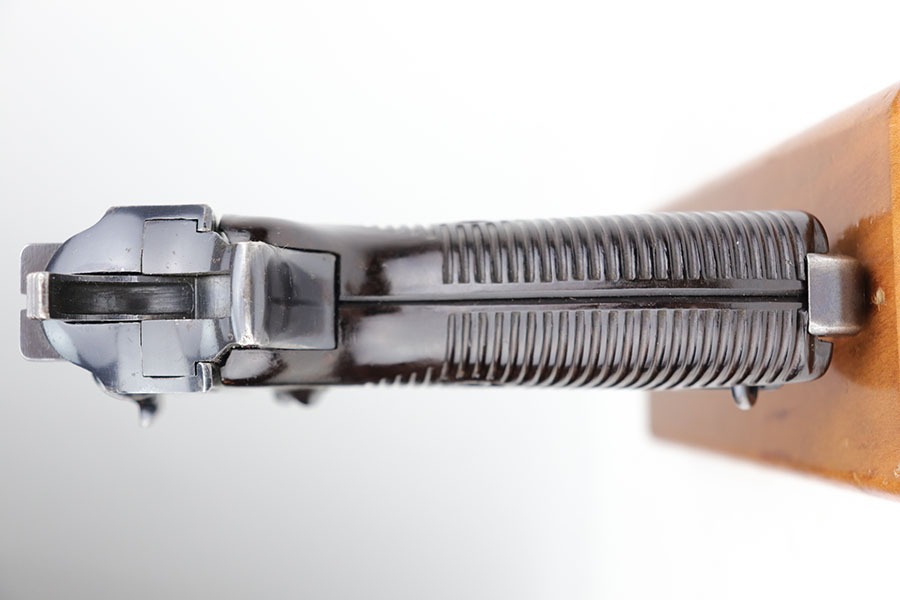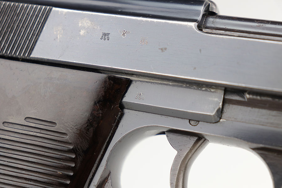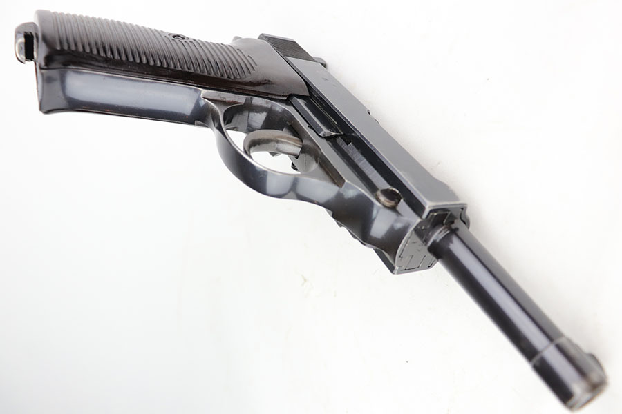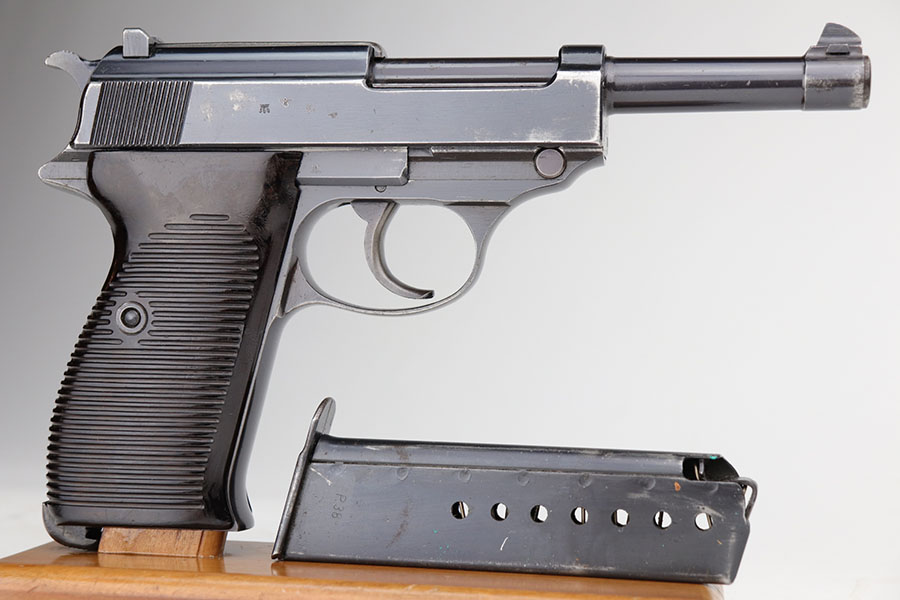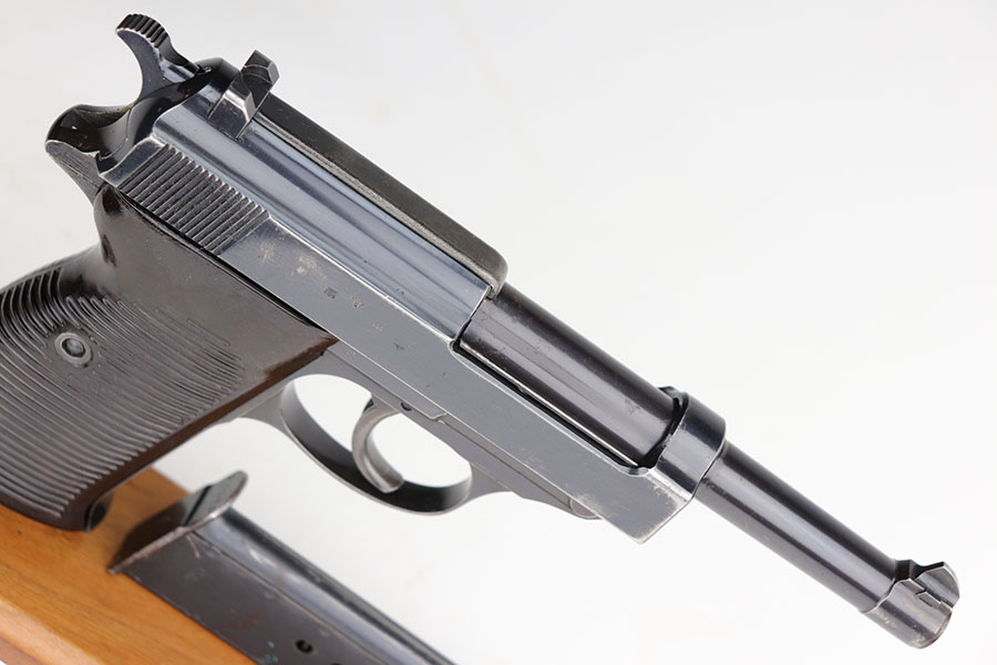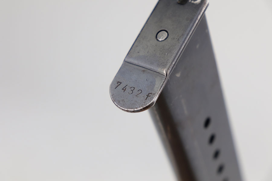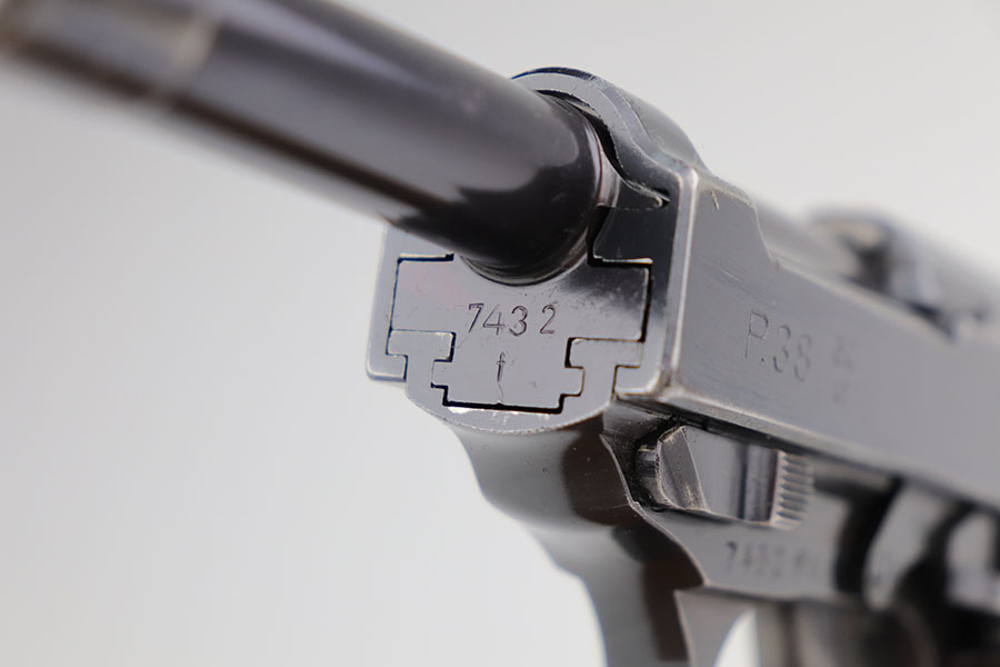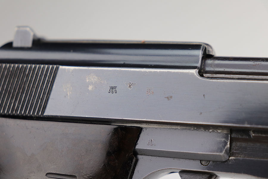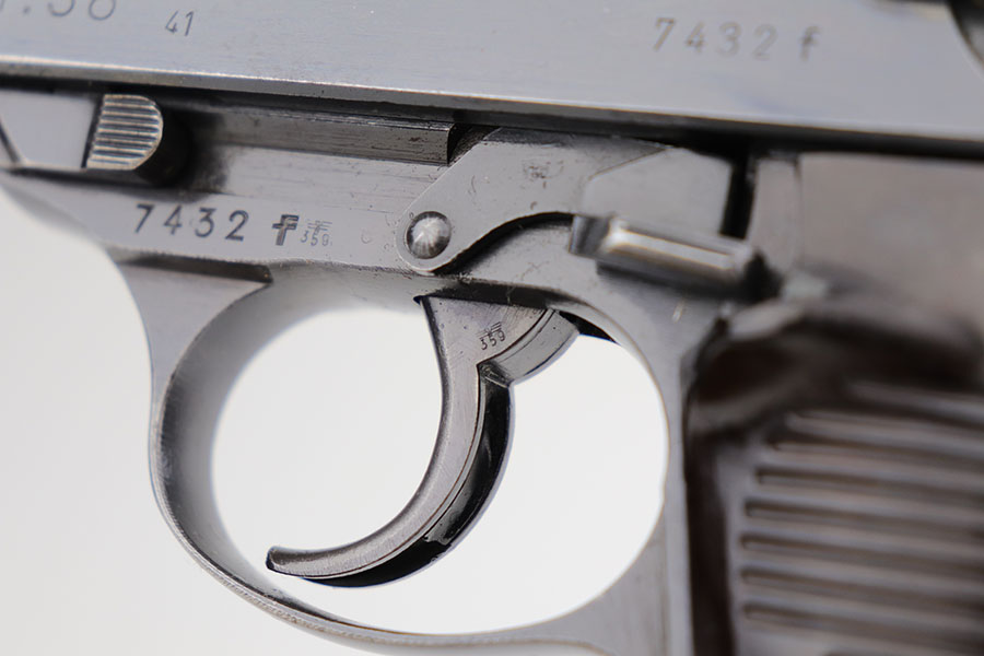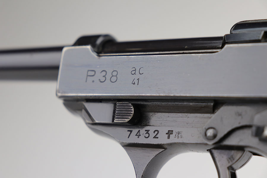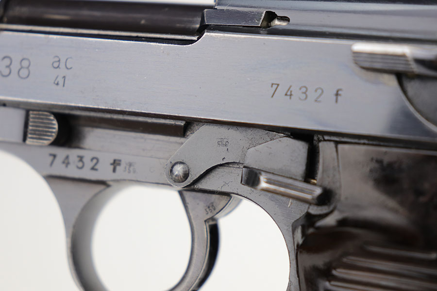 5/3/21 – This is a gorgeous example of an early Walther P.38, manufactured in 1941, with the original matching magazine. The high polish finish rates at about 96-97% with minor edge wear on the slide, but an excellent front strap. The grips and small parts are all waffen proofed. The grips are in excellent condition, as is the original matching magazine. The bore has strong rifling but some frosting throughout. The de-cocker does not work on this one but this is very common for early P.38’s. NOTE: This listing shows two magazines in the photos but only the matching example is included.