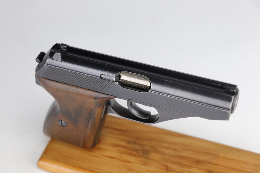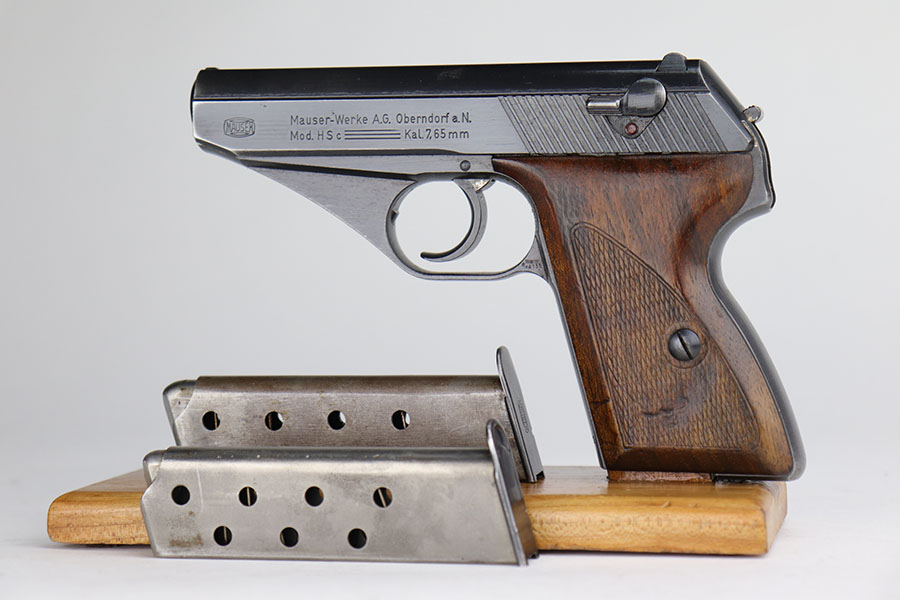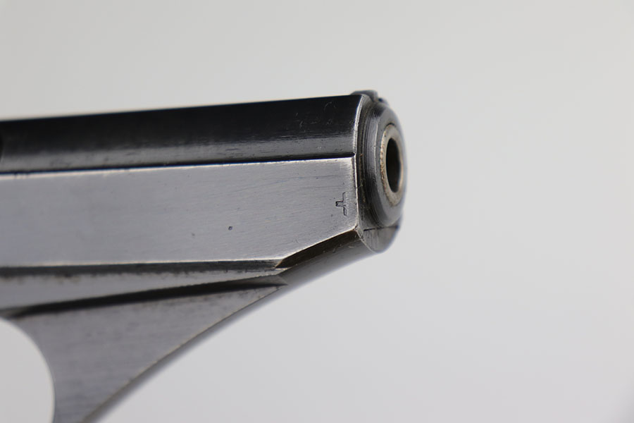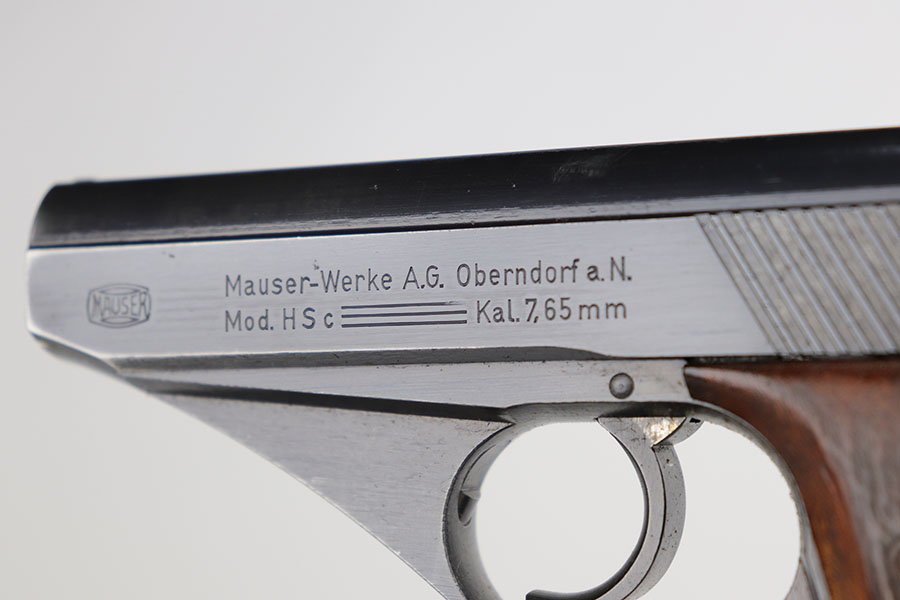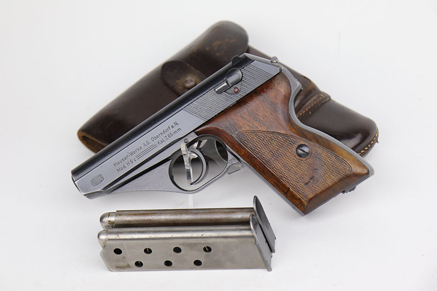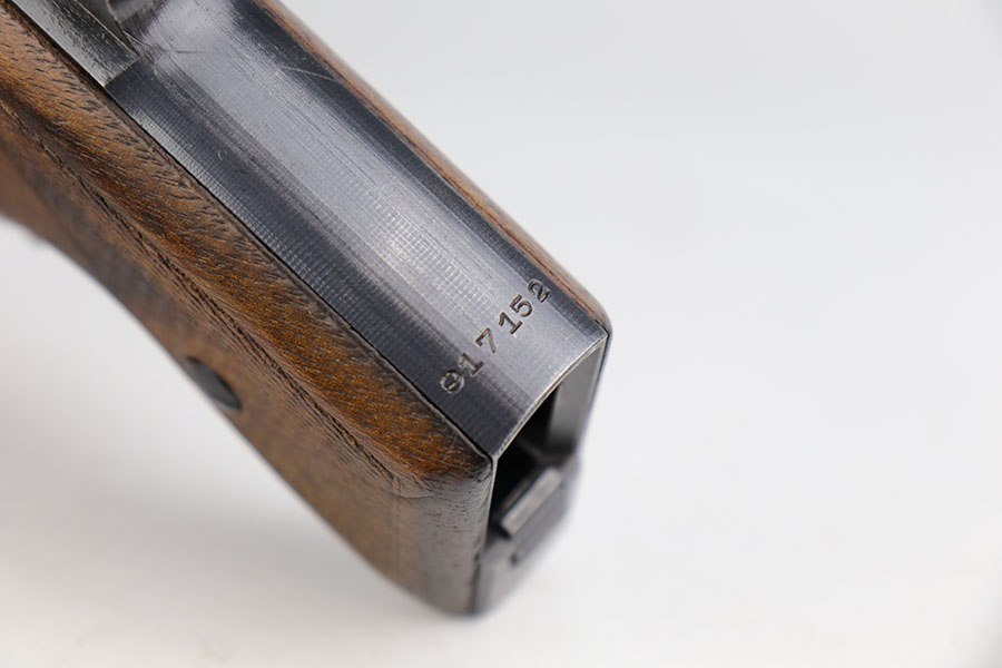 11/18/20 – This is an excellent and complete Army Mauser HSc rig from 1944. The pistol has 97-98% of the military blue remaining. Just a bit of muzzle wear from the holster, and minor thinning on the straps. Mint bore. The grips have some handling wear but no cracks or chips. One magazine is banner marked, the other is half-moon. The holster is in great condition with sharp waffenamt on closure strap, ’42 manufacture date and ‘jhg’ maker mark. It does have a name very lightly scratched in the back of it.