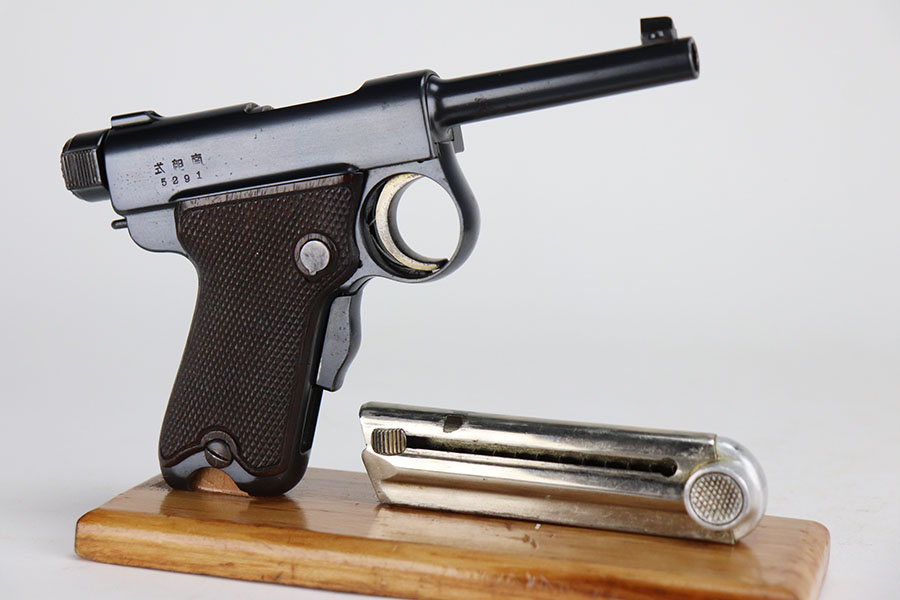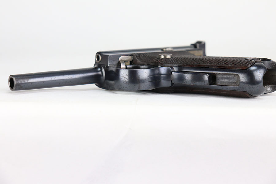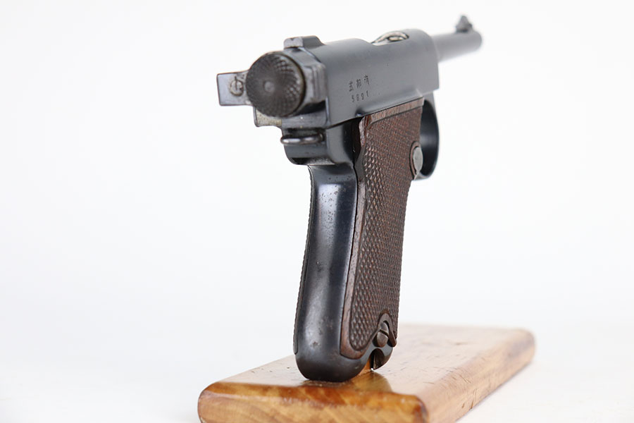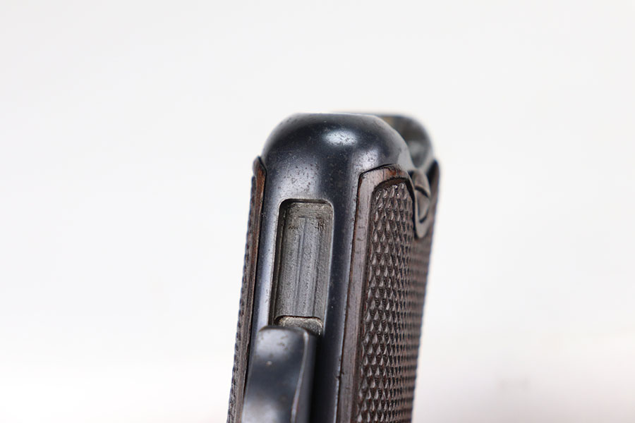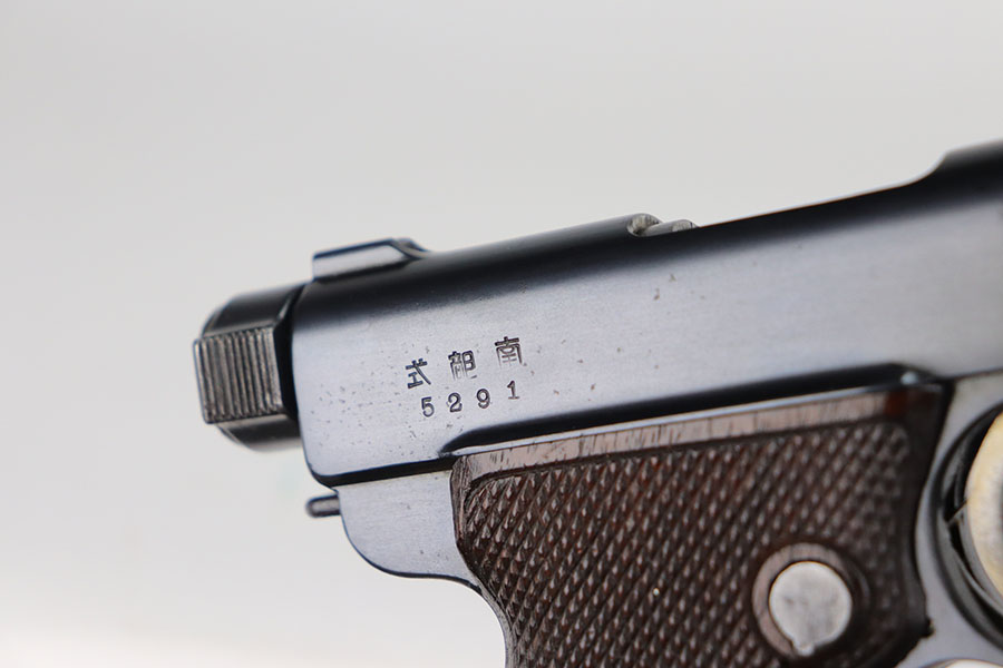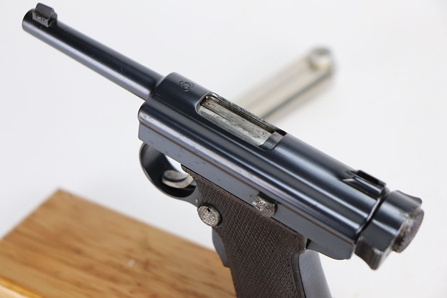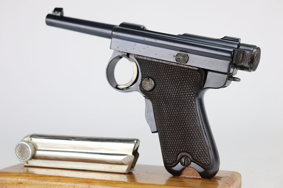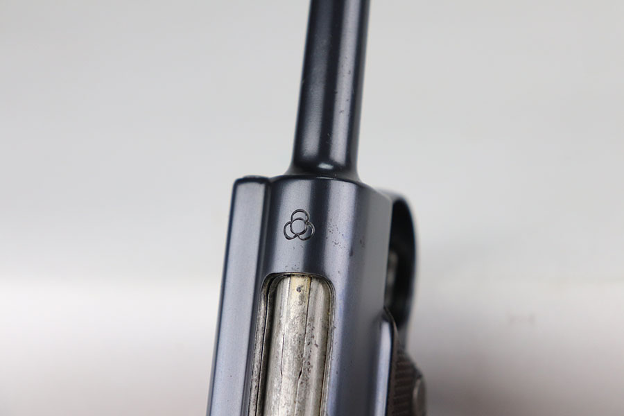 4/22/21 – This is a gorgeous Baby Nambu pistol that was manufactured at the Tokyo Arsenal in the 1910s, and still has the original, matching grips and magazine. The pistol has about 99% of the original blue, with hardly any bluing loss to mention but there is oxidation in a few areas, and a patch of pitting on the barrel and another on the bottom of the back strap. Minty bore and grips. The Baby Nambu was developed as a personal weapon for high ranking Japanese officers and only about 6,500 were made in total. Considered by collectors to be one of the most beautiful handguns made in pre-war Japan, it featured ornamental knurling on the cocking knob and high quality “rust” blue, that rivaled European handguns of the era.
