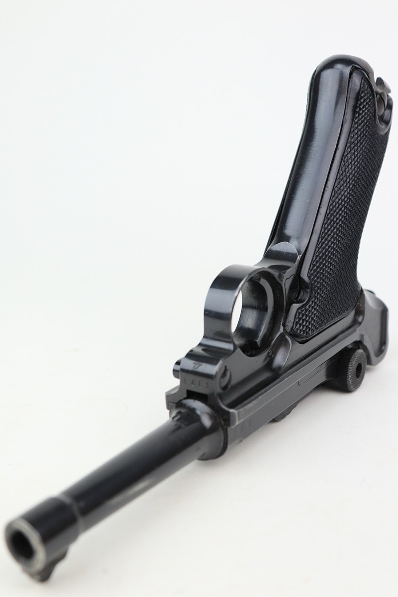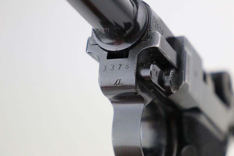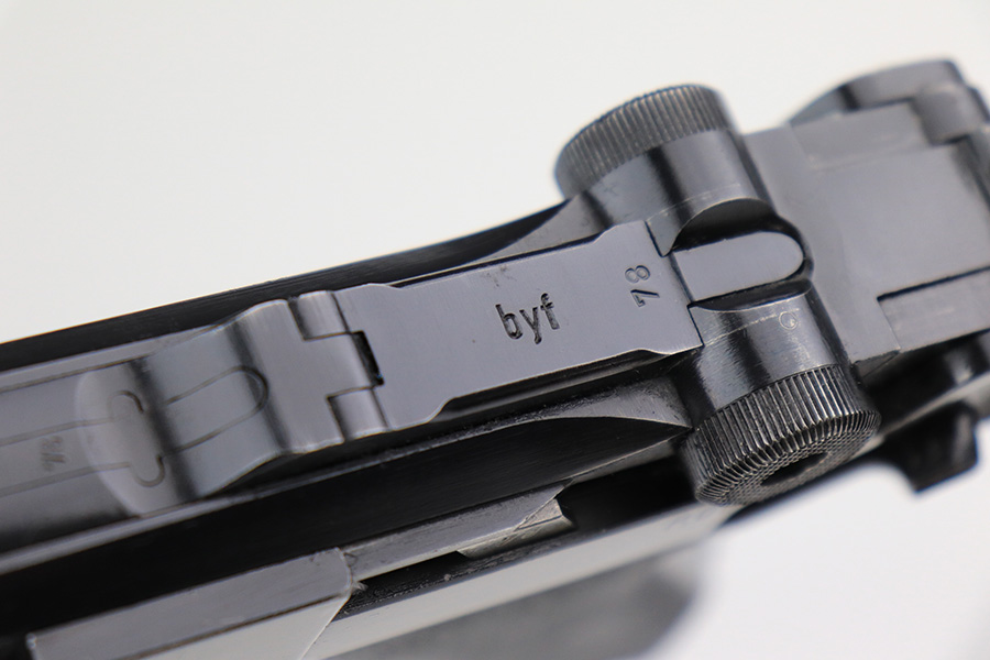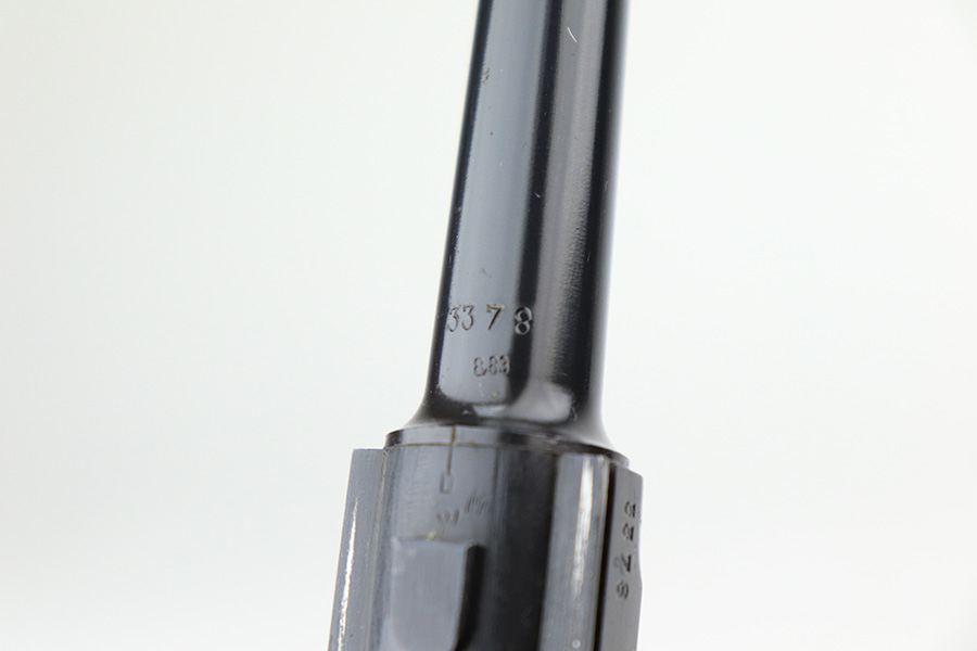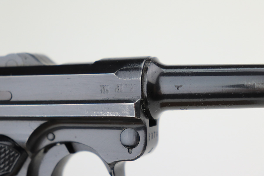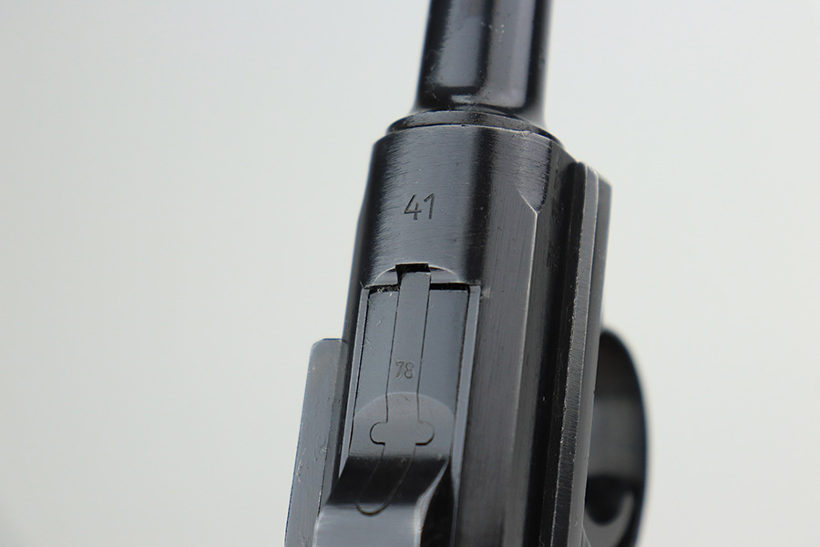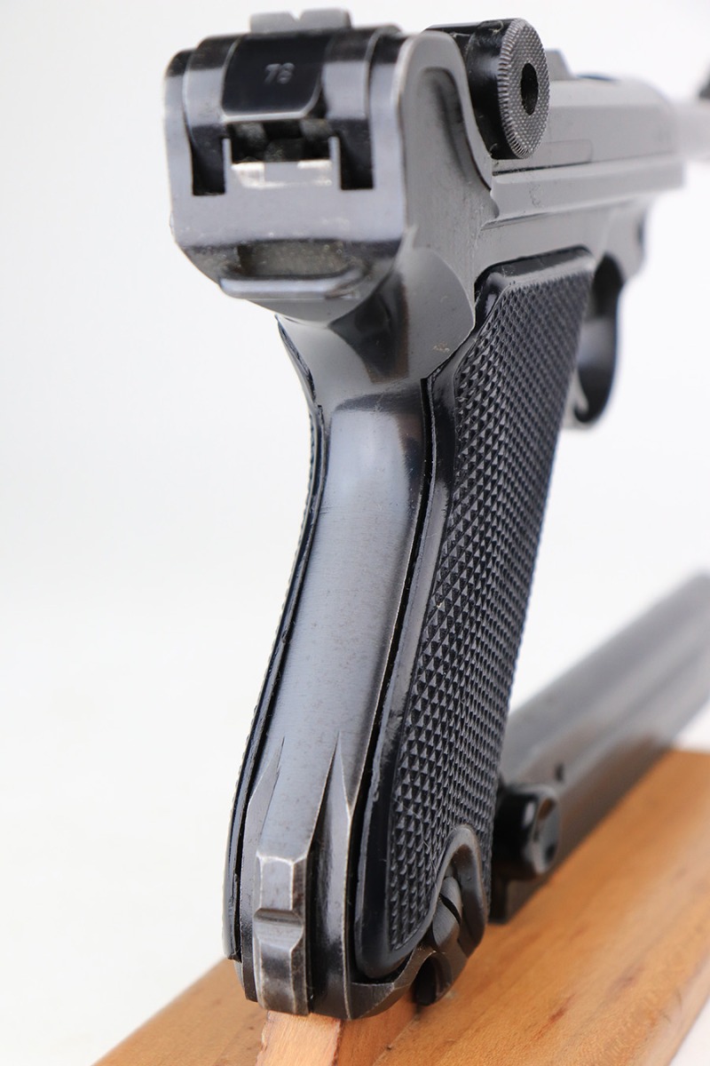 5/11/22 – This is a terrific example of an all matching and original Black Widow Mauser Luger from 1941. It has 96-97% of the original blue with minor finish loss on the sideplate and muzzle, and a little more on the right side rail and the right side of the barrel. There is otherwise some very minor pinpricking in a couple of areas but the condition is excellent overall. Excellent, shiny bore. Original Black Widow grips and magazine with minor handling wear on the grips but no chips or defects. The magazine is in excellent condition with no cracks or chips on the base. All matching serial numbers throughout.