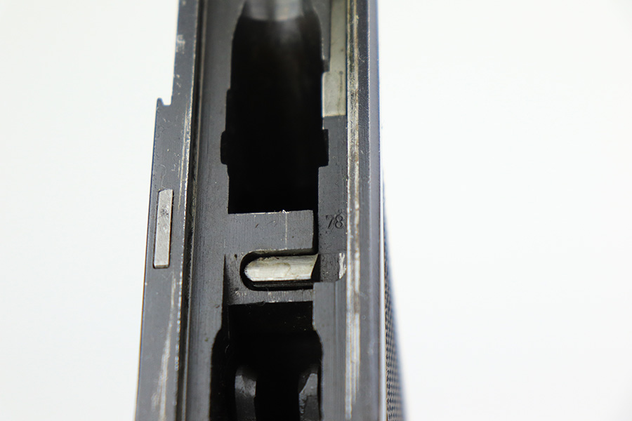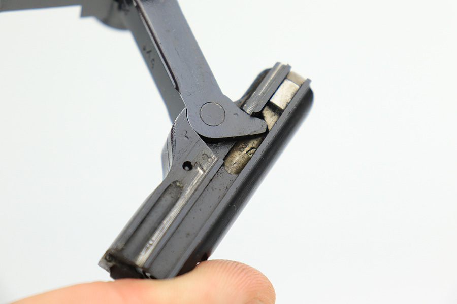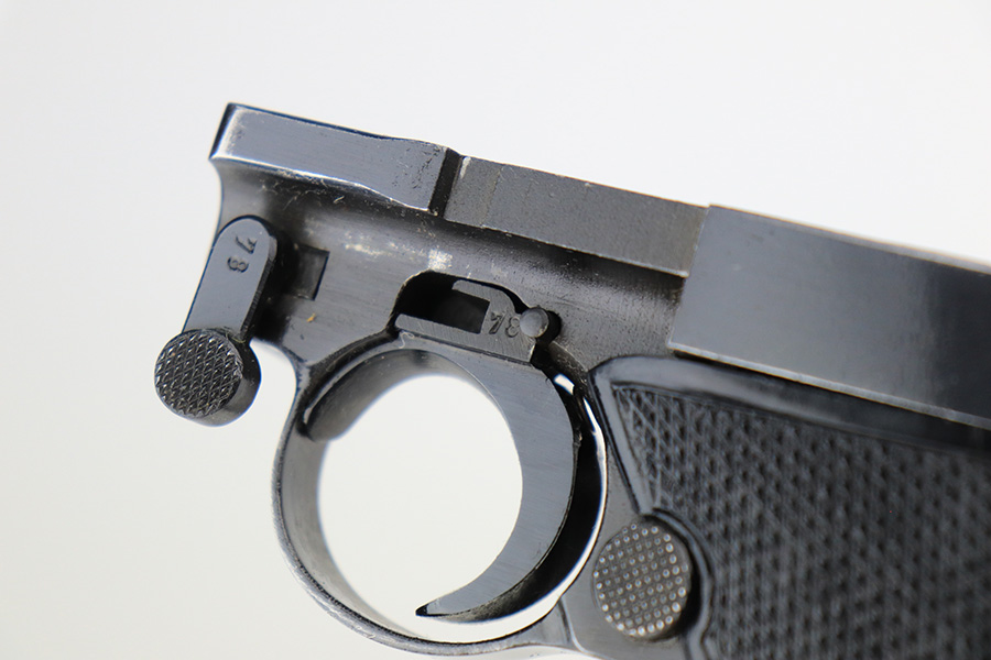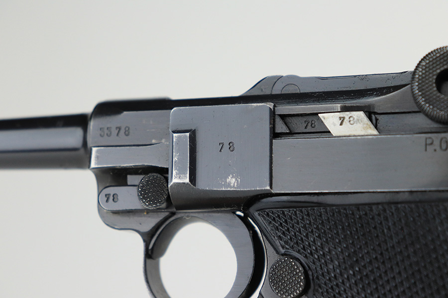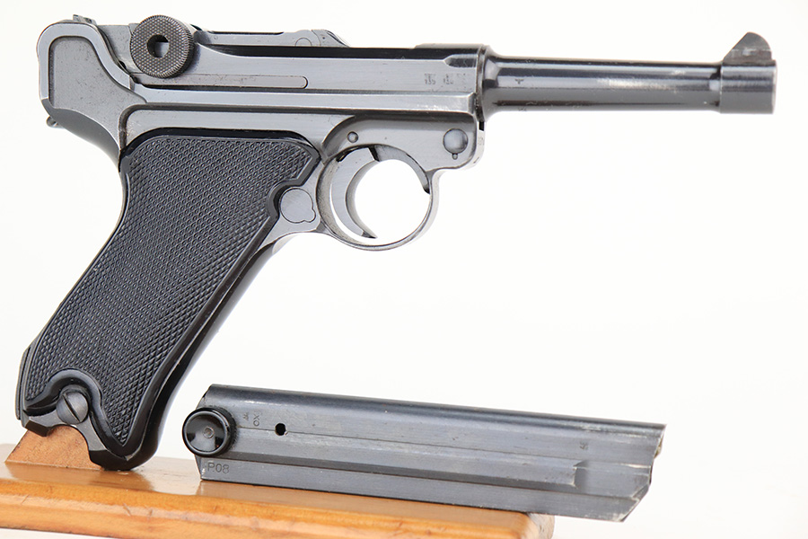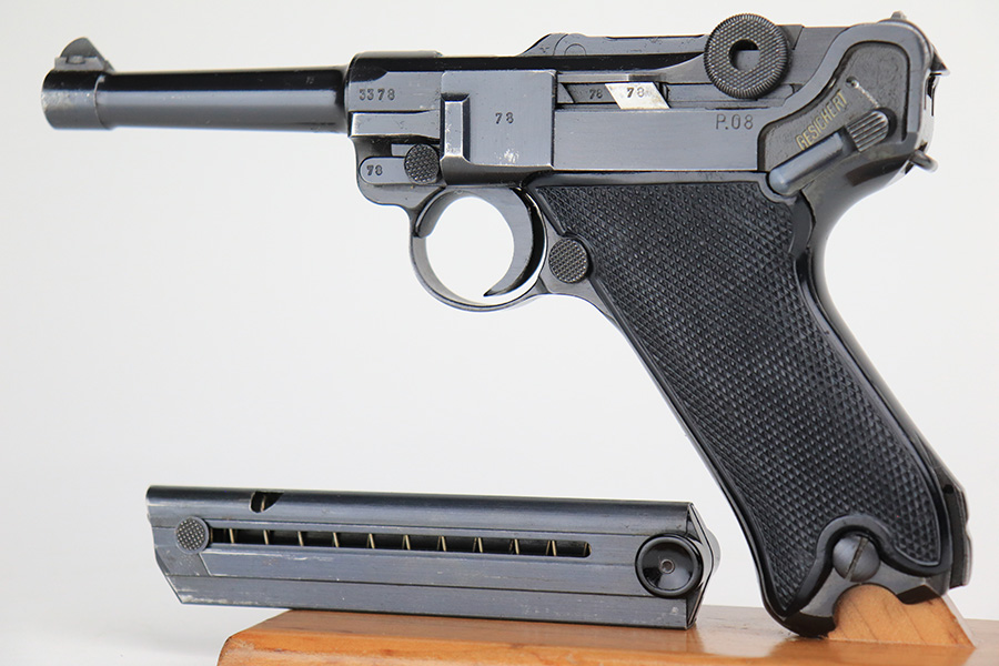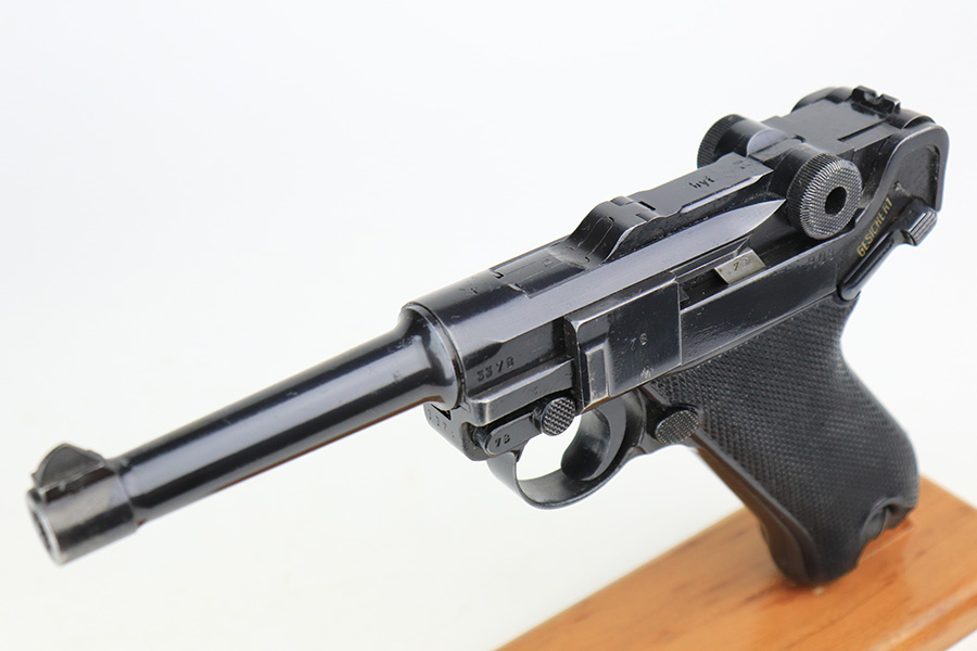 5/11/22 – This is a terrific example of an all matching and original Black Widow Mauser Luger from 1941. It has 96-97% of the original blue with minor finish loss on the sideplate and muzzle, and a little more on the right side rail and the right side of the barrel. There is otherwise some very minor pinpricking in a couple of areas but the condition is excellent overall. Excellent, shiny bore. Original Black Widow grips and magazine with minor handling wear on the grips but no chips or defects. The magazine is in excellent condition with no cracks or chips on the base. All matching serial numbers throughout.