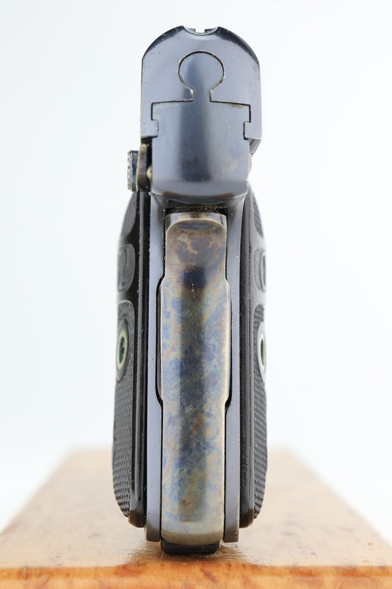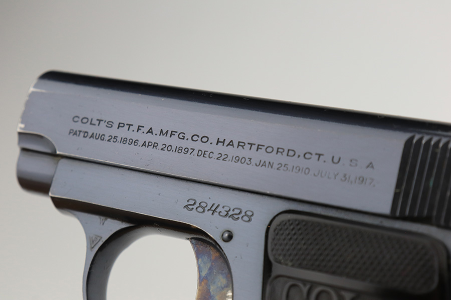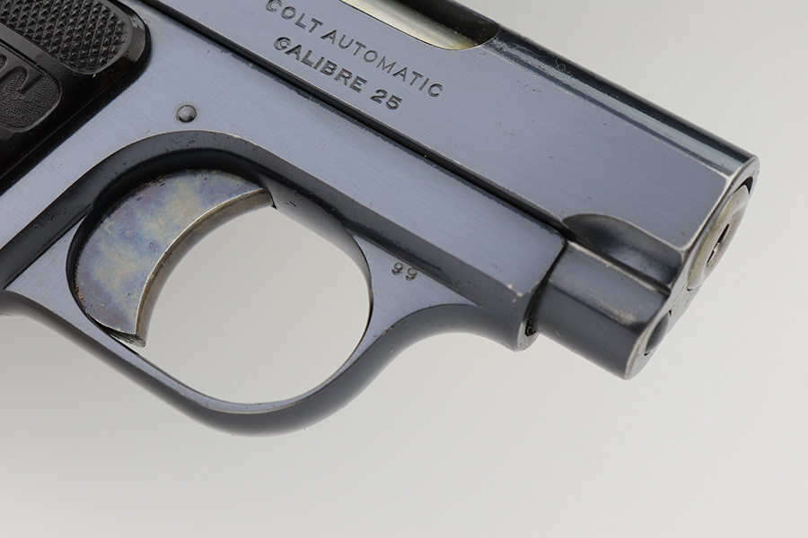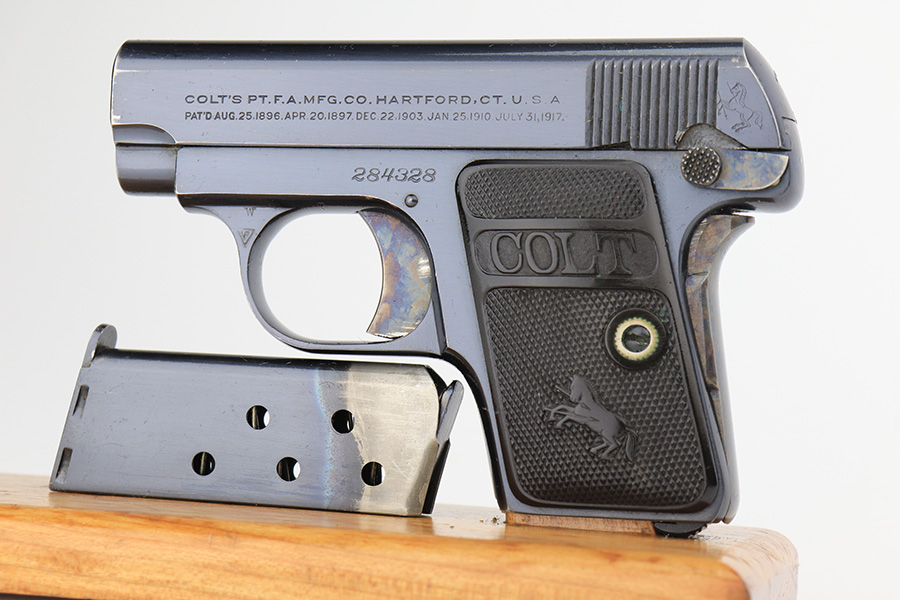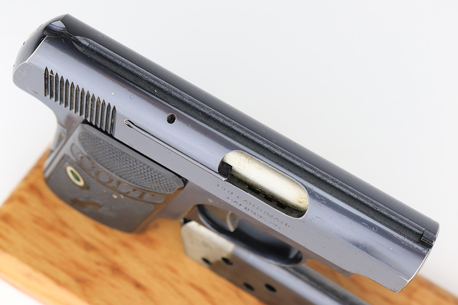 2/19/23 – This is a gorgeous example of a Colt Model 1908 Vest Pocket pistol manufactured in 1921. It is all matching and has retained more than 98% of its original high polish bluing with just hints of wear on the high edges and some tiny dots of wear on the top left side of the slide. Excellent case-hardening on the small parts. Comes with minty Colt hard rubber grips and a two-tone magazine. The bore is excellent with minimal signs of use.