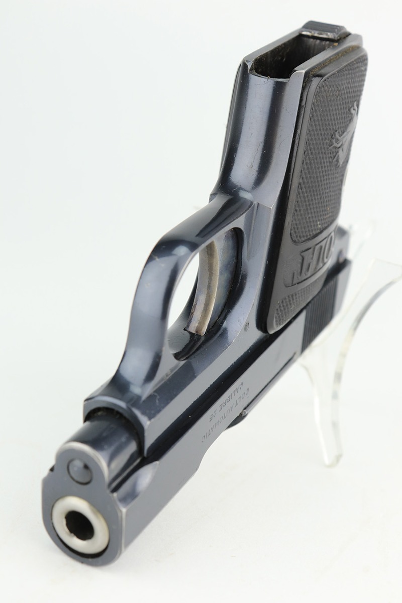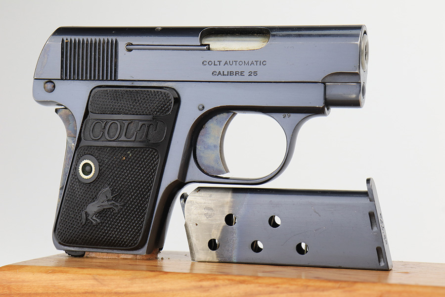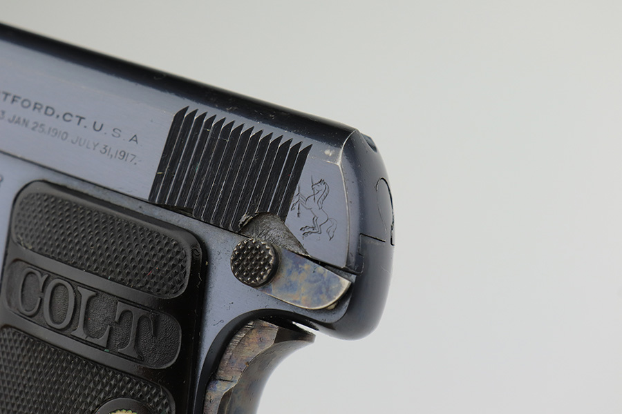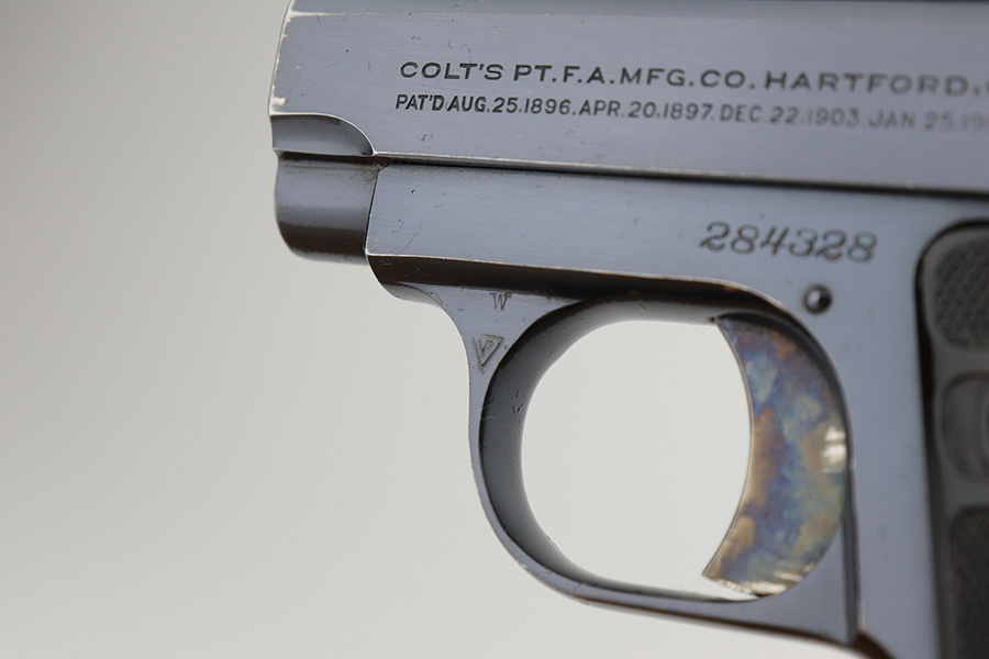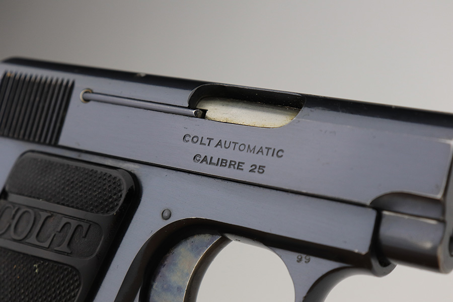 2/19/23 – This is a gorgeous example of a Colt Model 1908 Vest Pocket pistol manufactured in 1921. It is all matching and has retained more than 98% of its original high polish bluing with just hints of wear on the high edges and some tiny dots of wear on the top left side of the slide. Excellent case-hardening on the small parts. Comes with minty Colt hard rubber grips and a two-tone magazine. The bore is excellent with minimal signs of use.