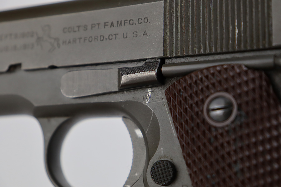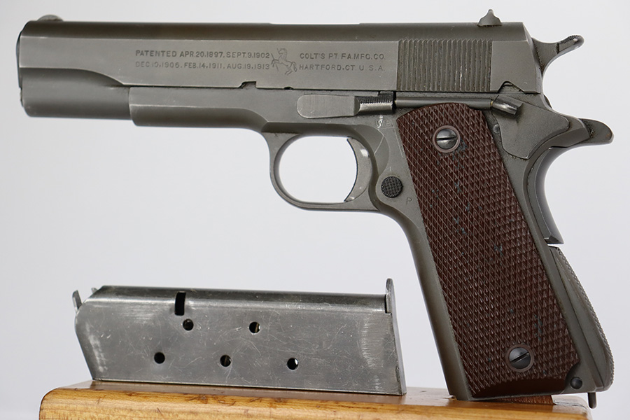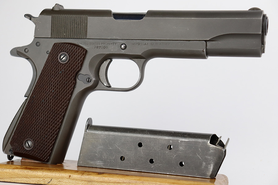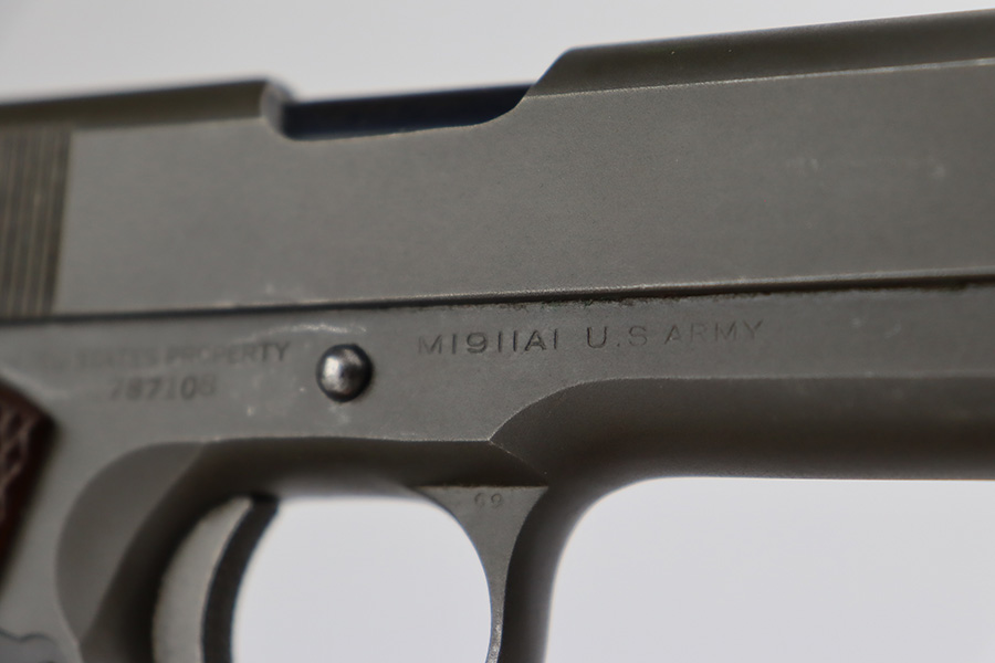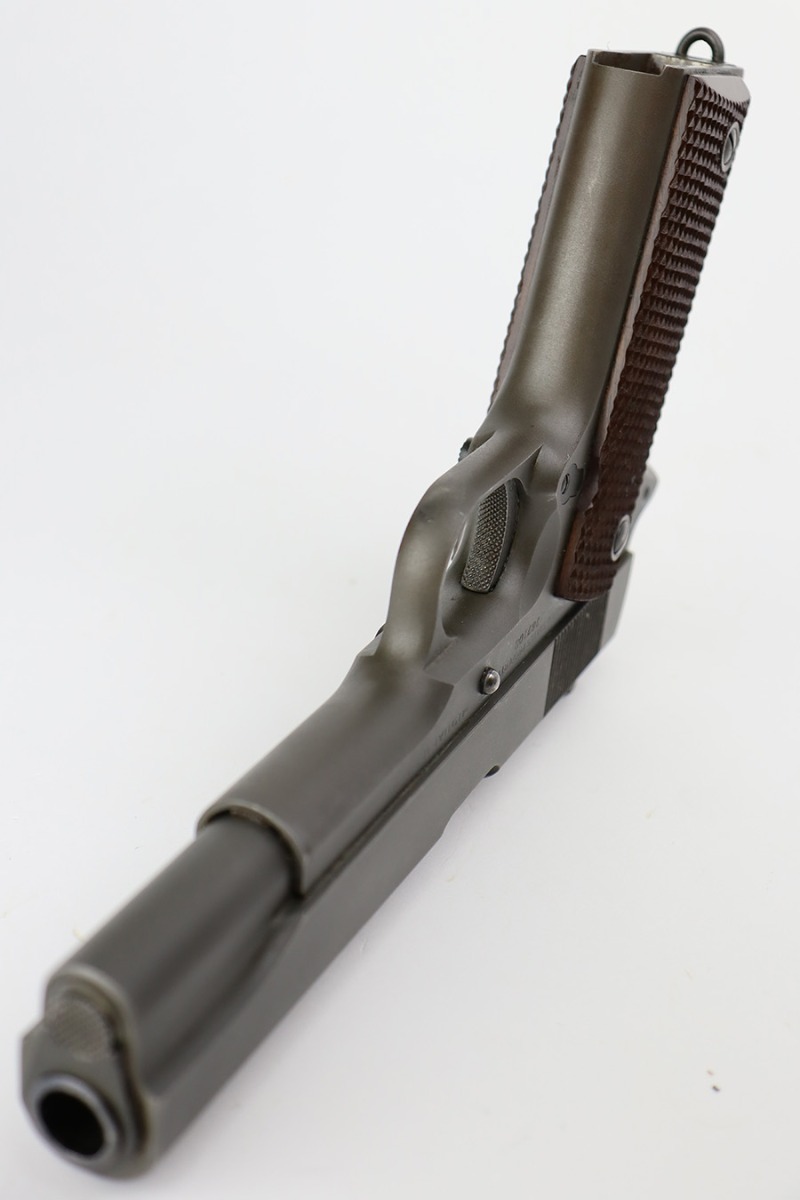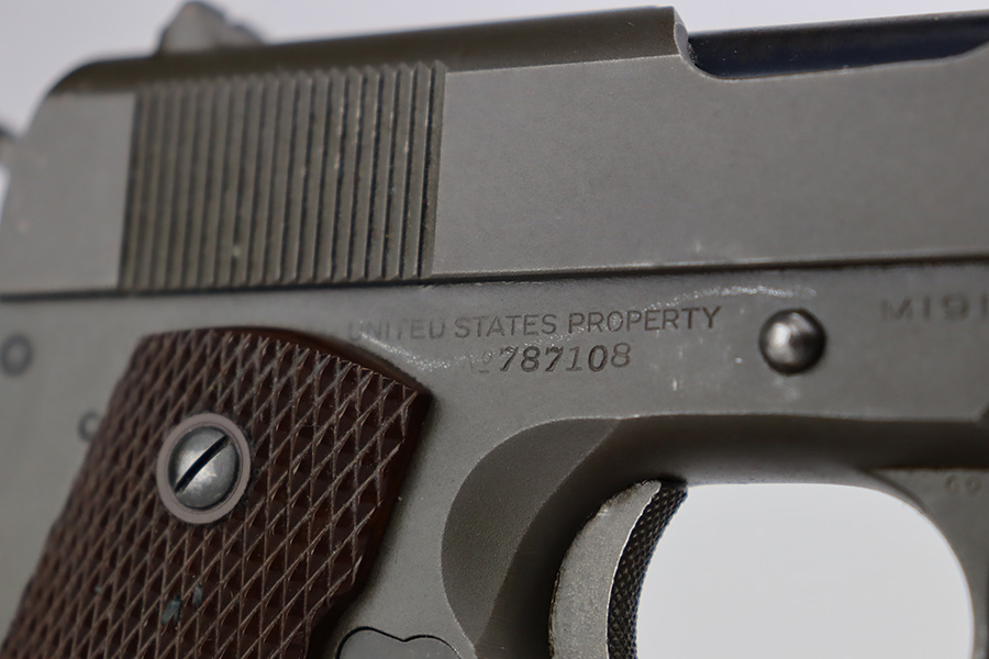 8/2/23 – This is a terrific example of an original Colt 1911A1 that was issued to the U.S. military in 1942. Proper WB inspectors mark on frame, and right side is marked ‘UNITED STATES PROPERTY’. Slide is matching numbered to frame. Correct, scarce Colt barrel with large ‘G’ under lug, and it has a mint bore. Terrific grips with sharp checkering. Unmarked mag.