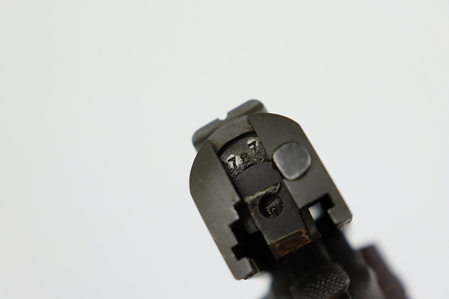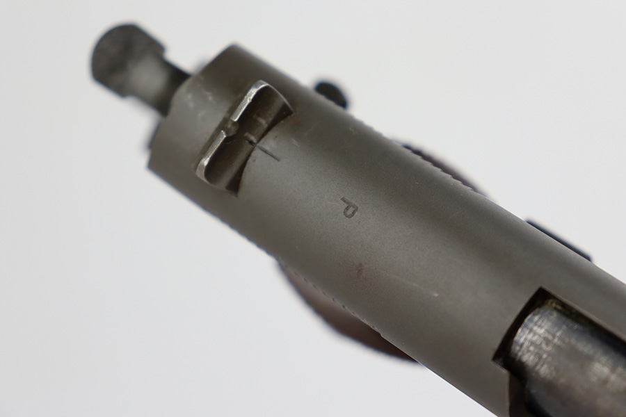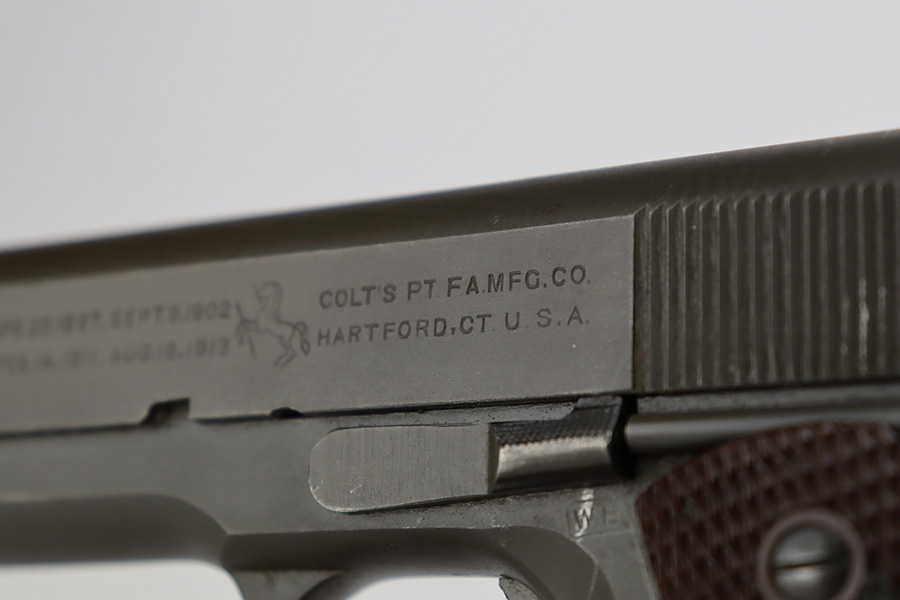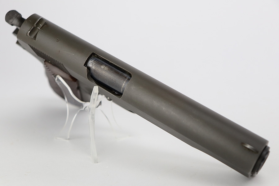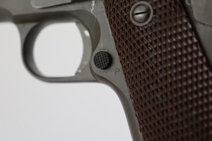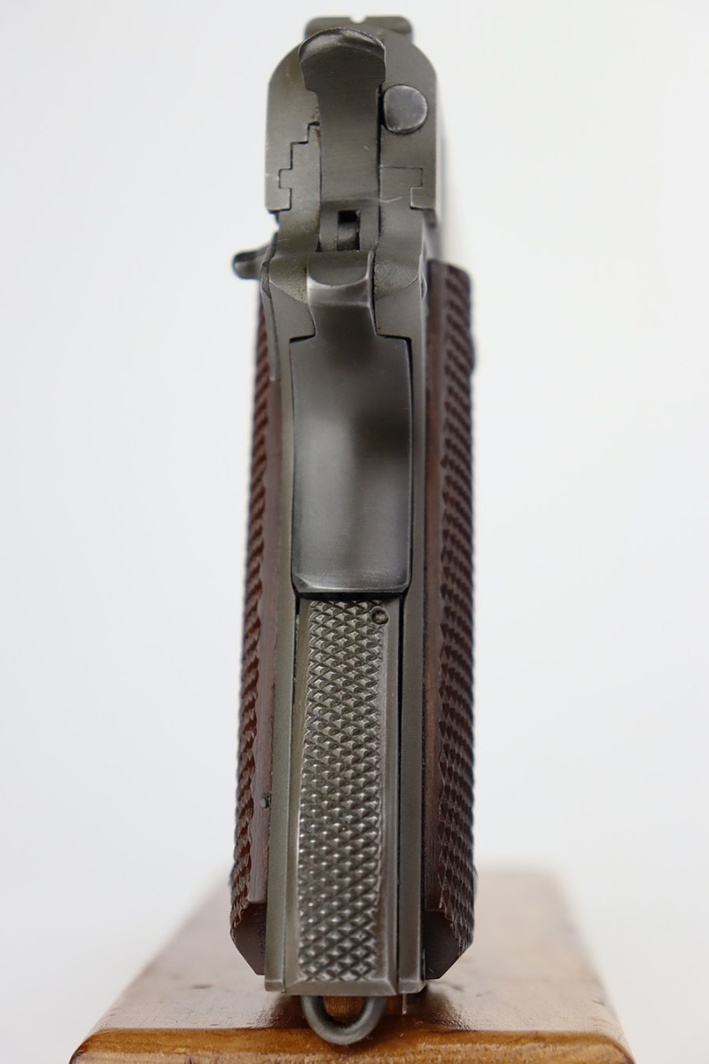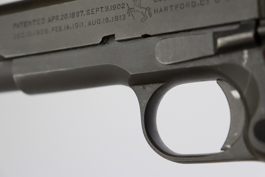 8/2/23 – This is a terrific example of an original Colt 1911A1 that was issued to the U.S. military in 1942. Proper WB inspectors mark on frame, and right side is marked ‘UNITED STATES PROPERTY’. Slide is matching numbered to frame. Correct, scarce Colt barrel with large ‘G’ under lug, and it has a mint bore. Terrific grips with sharp checkering. Unmarked mag.