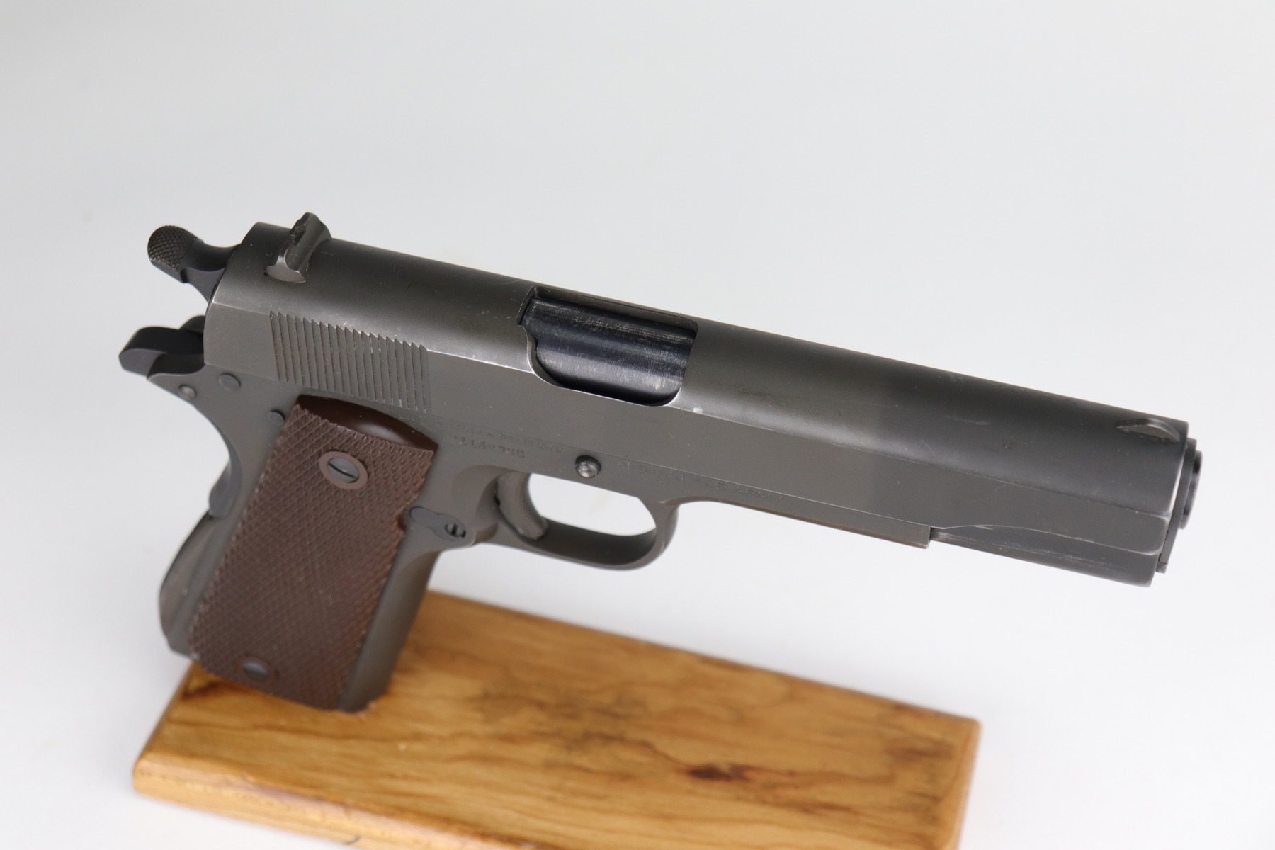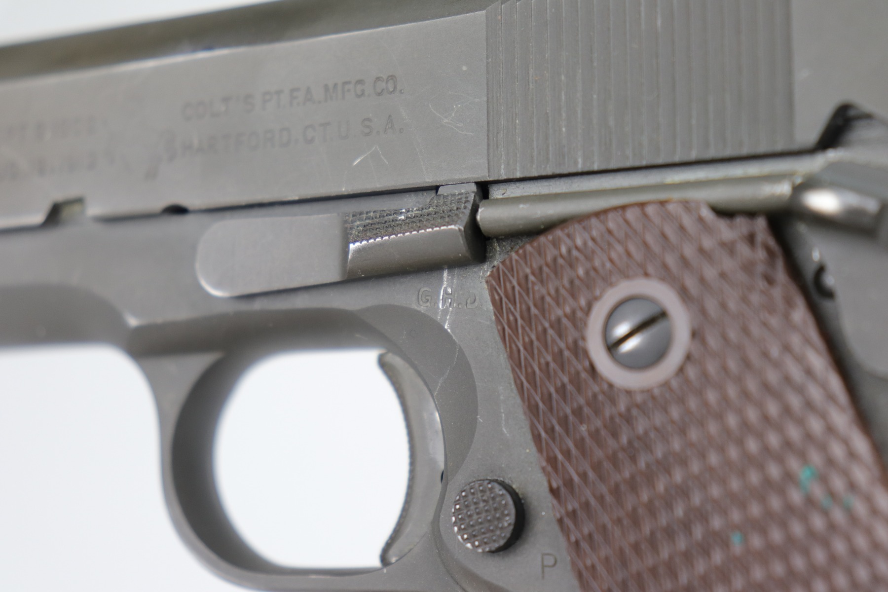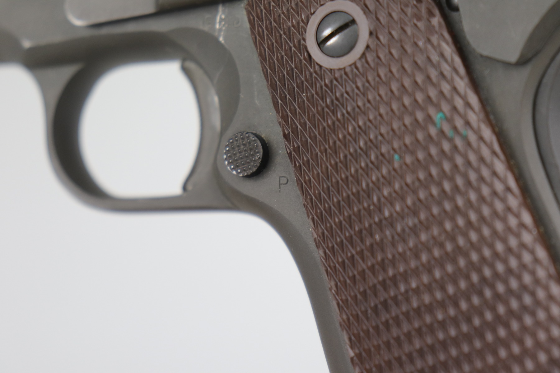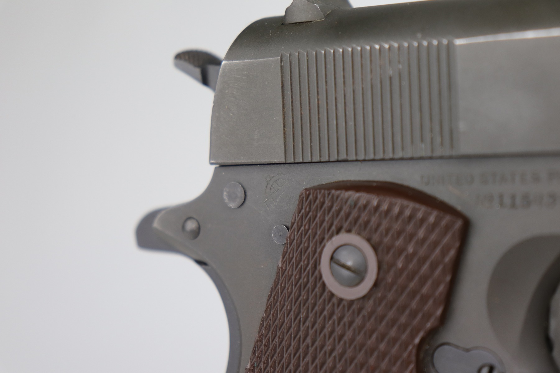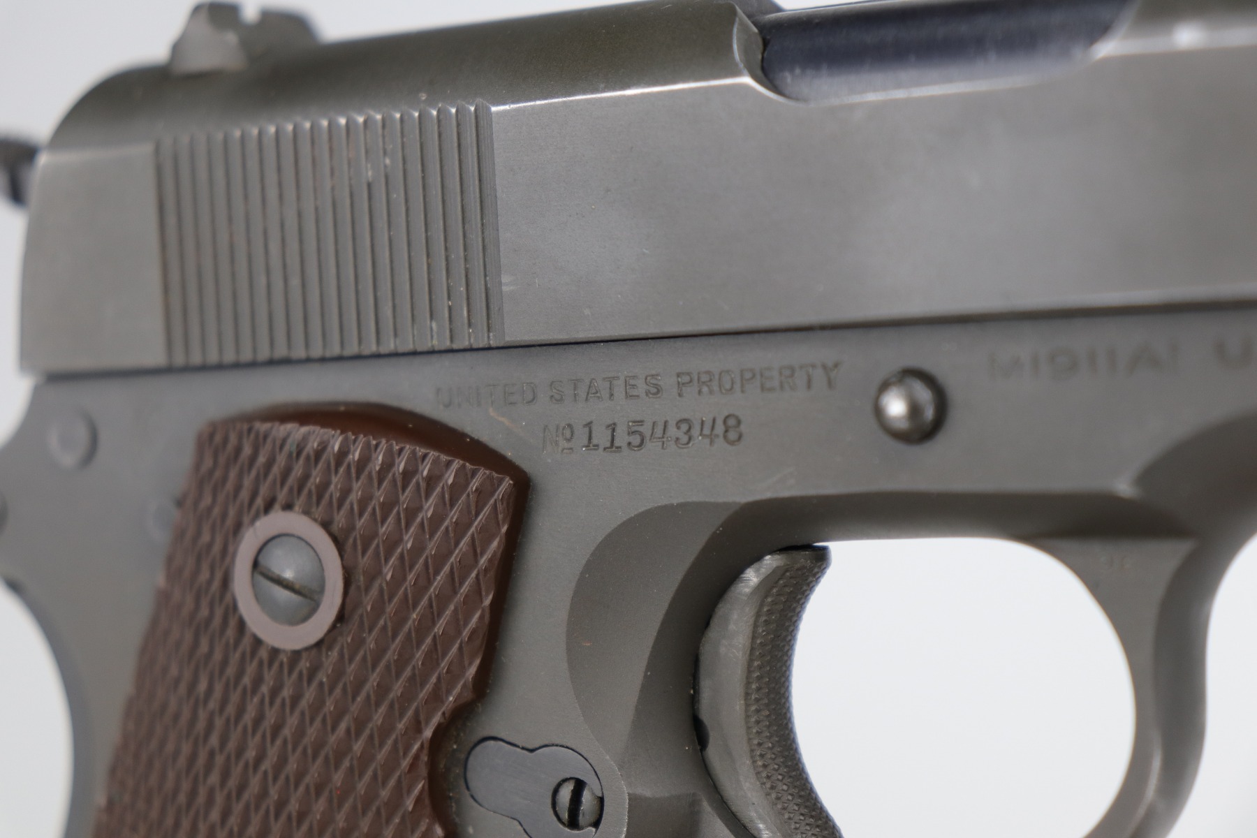4/11/22 – This is a terrific example of a Colt 1911A1 that was issued to the US military in 1943. It is “US Property” marked and has the proper US military cross-canon cartouche. The slide is correctly un-numbered. It has retained about 97% of its original finish. There is minor wear around the muzzle and some high edges on the slide. One spot of wear toward the middle of the left side of the slide. There are a few very minor handling marks/surface scratches. The most noticeable scratch is from the takedown lever. It comes with minty period-correct grips and a period-correct magazine. The bore is excellent – shiny with strong rifling and very minor frosting in the grooves.