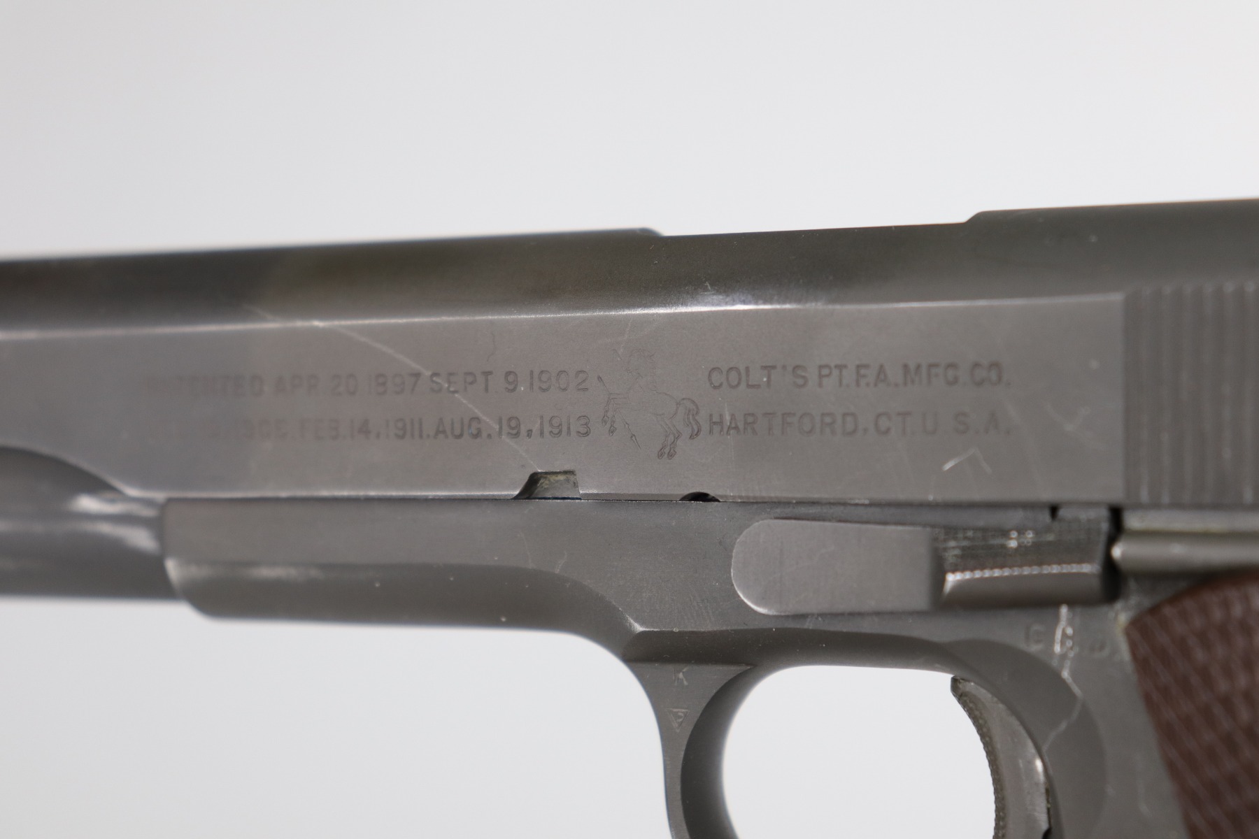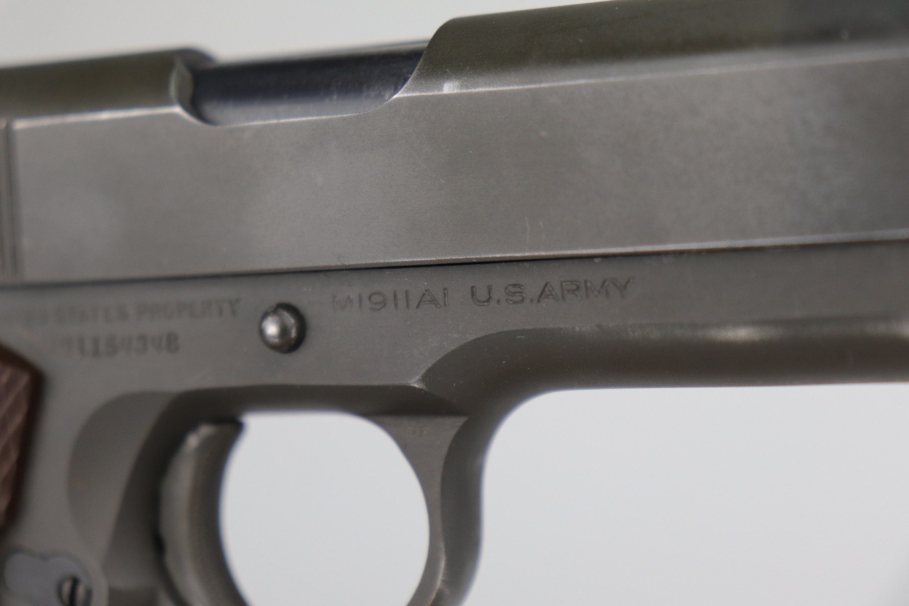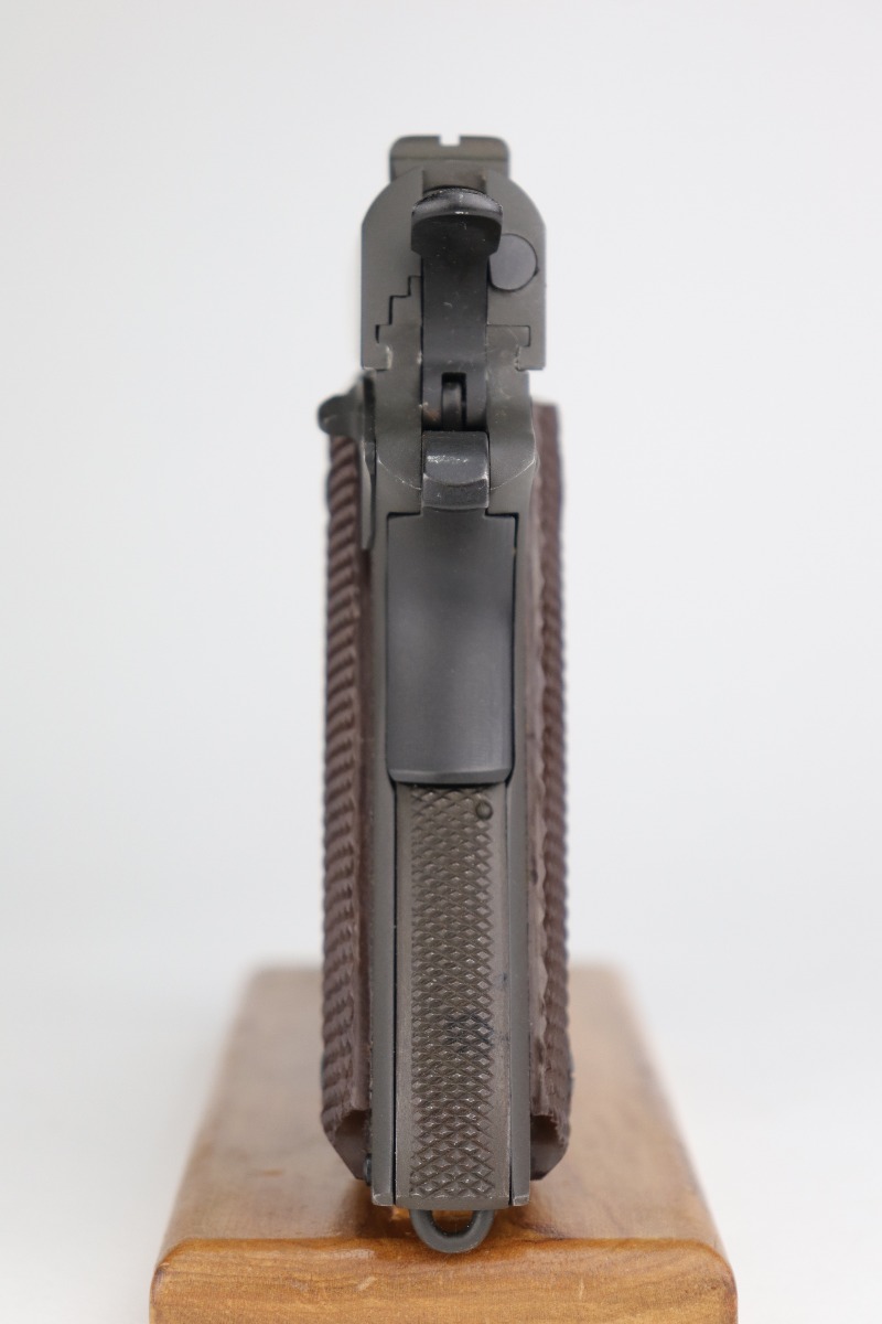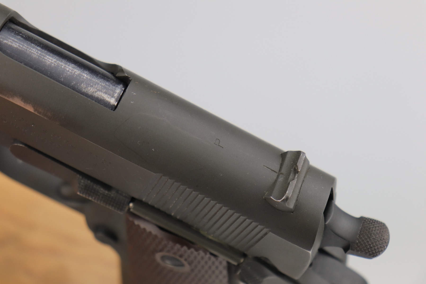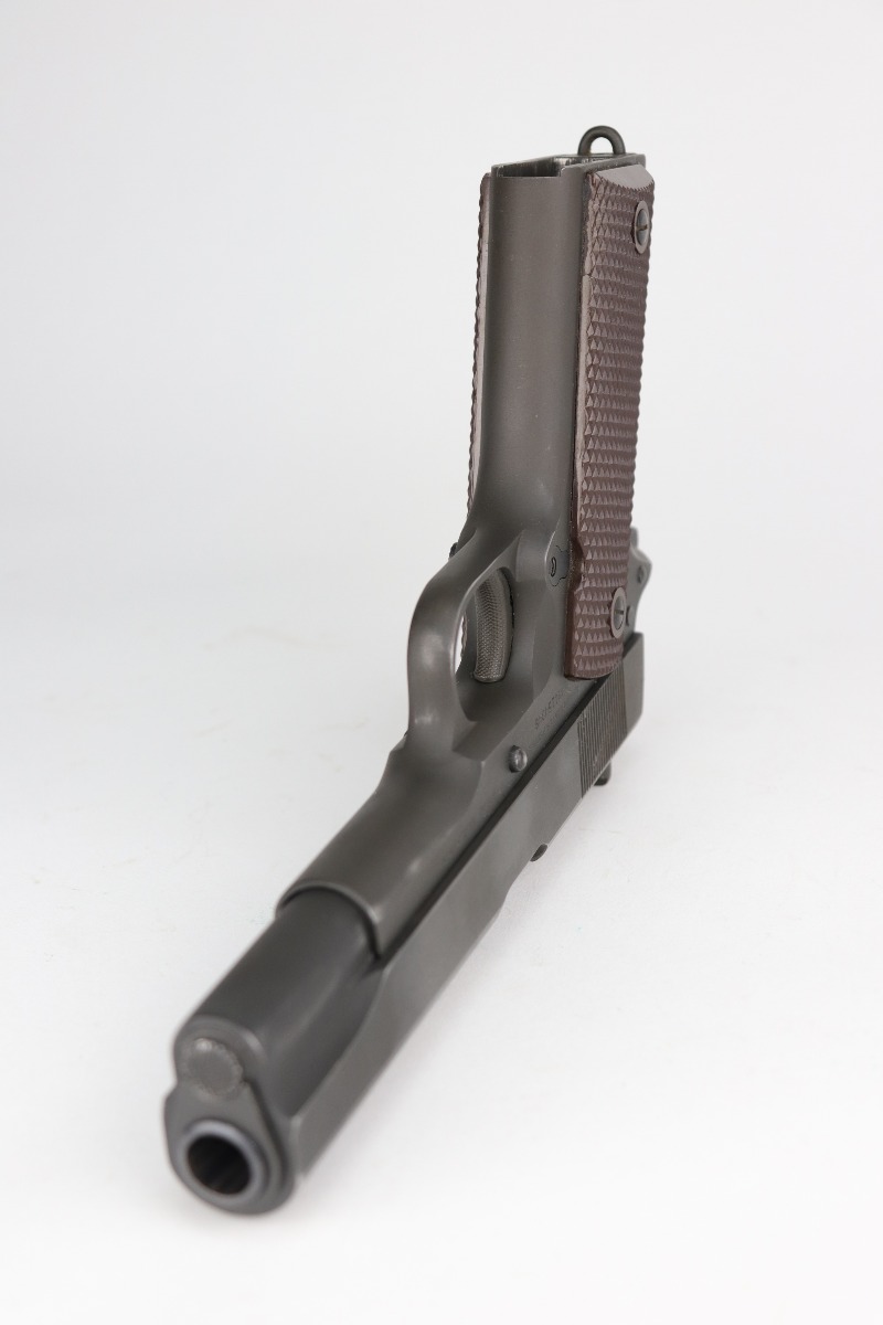 4/11/22 – This is a terrific example of a Colt 1911A1 that was issued to the US military in 1943. It is “US Property” marked and has the proper US military cross-canon cartouche. The slide is correctly un-numbered. It has retained about 97% of its original finish. There is minor wear around the muzzle and some high edges on the slide. One spot of wear toward the middle of the left side of the slide. There are a few very minor handling marks/surface scratches. The most noticeable scratch is from the takedown lever. It comes with minty period-correct grips and a period-correct magazine. The bore is excellent – shiny with strong rifling and very minor frosting in the grooves.