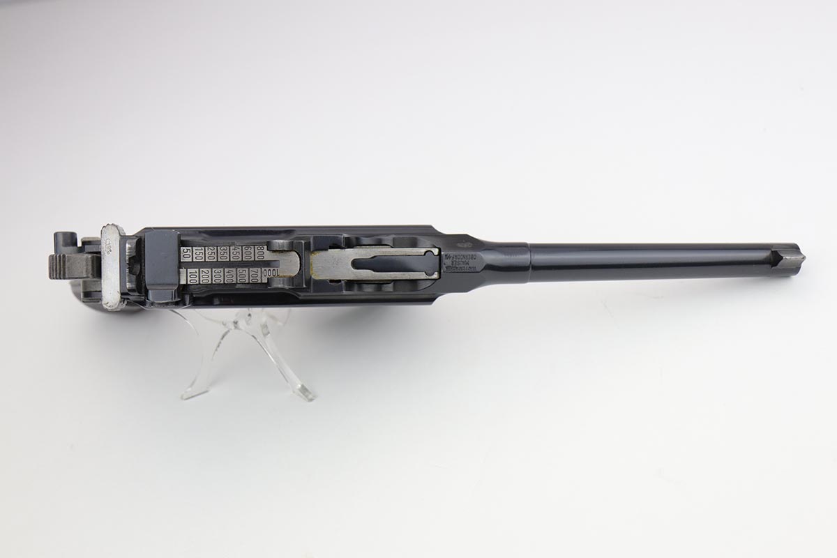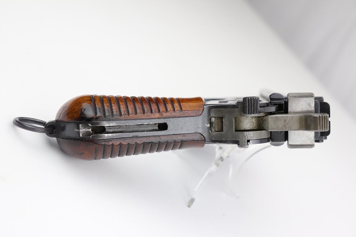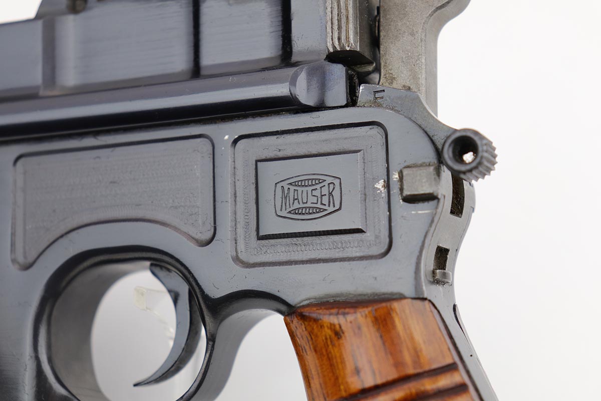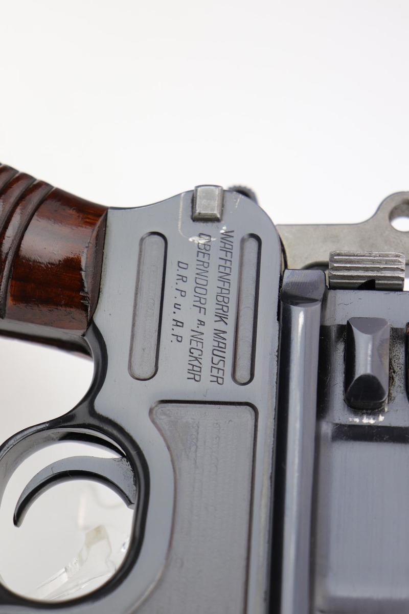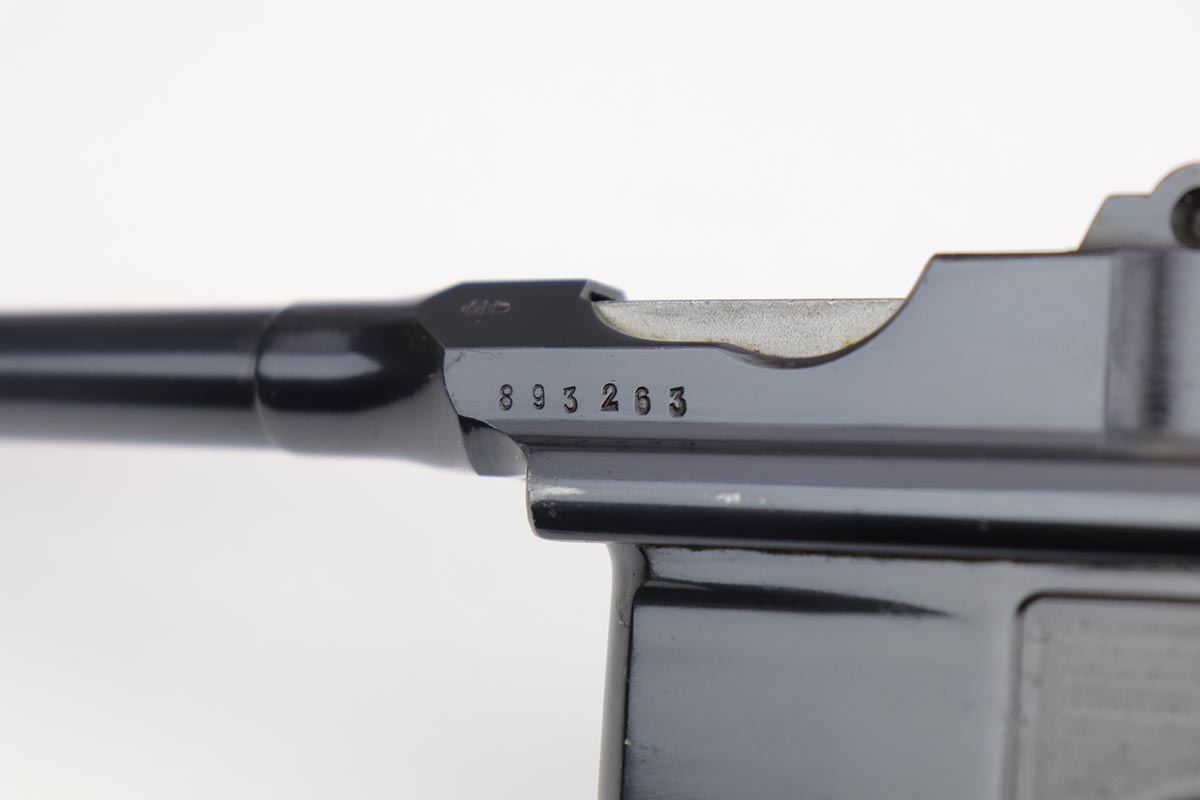 6/23/20 – This is a beautiful example of a commercial Mauser C96 that was manufactured some time from 1932-34. The high-polish blue is bright and lustrous, and shows the vast majority of the finish loss on the underside of the barrel and from of the magazine well, indicating it likely spent time in a stock. Minty bore and beautiful wood grips. All matching numbers.