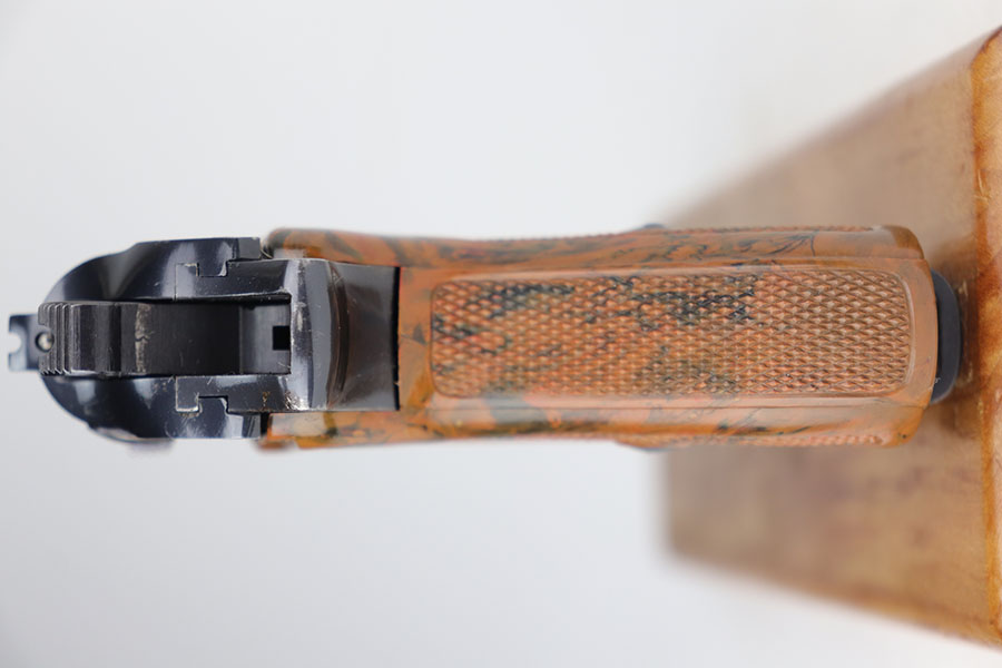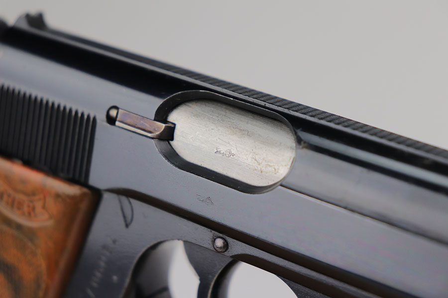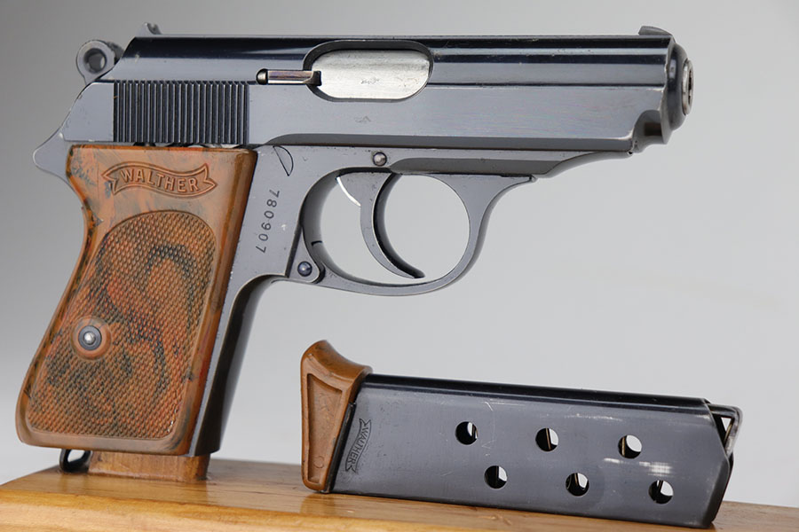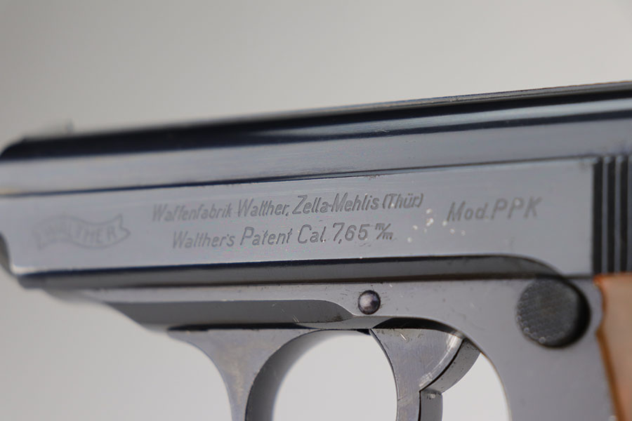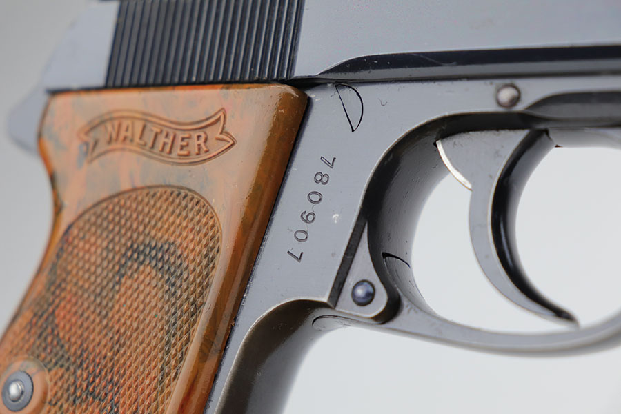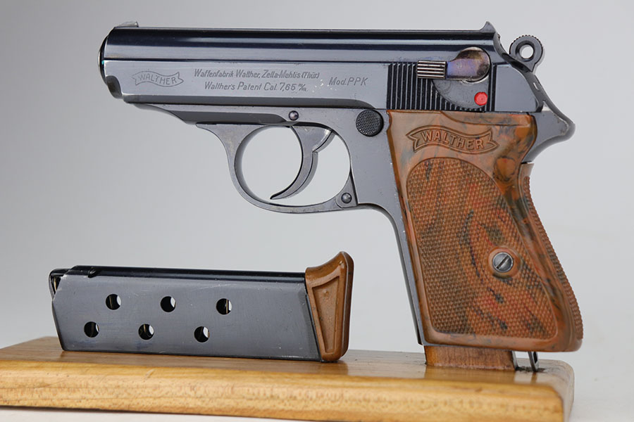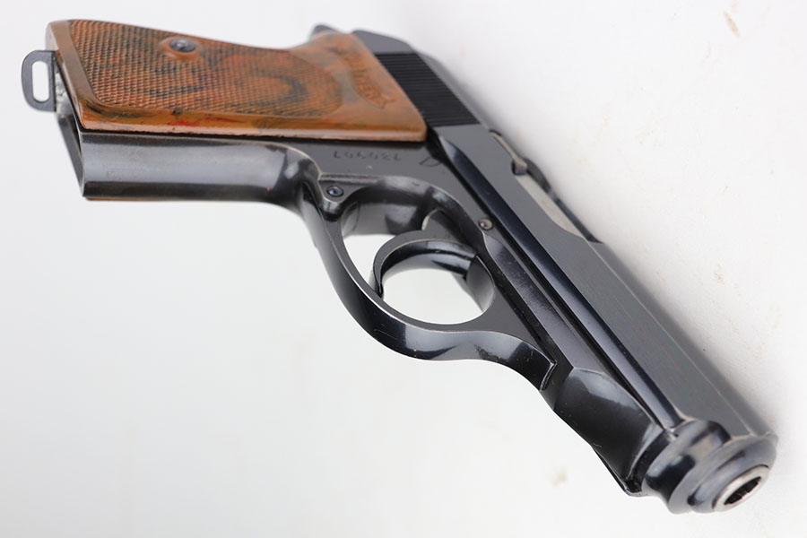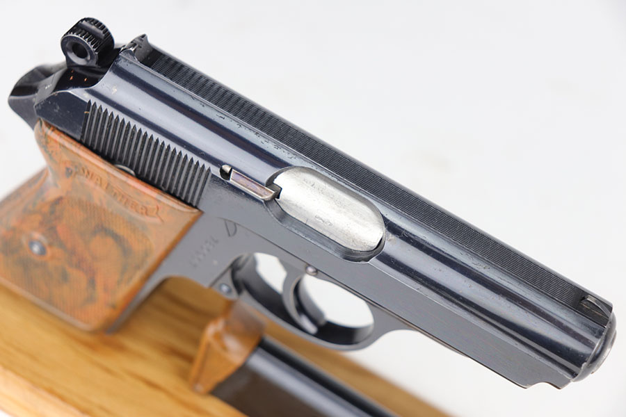 1/19/20 – This is a fantastic example of a fairly early commercial Walther PPK. Serial dates it to 1932-33 range. The high-polish blue is original and rates at about 98-99% with just a couple minuscule spots of finish loss on the left side of the slide, and very minor muzzle wear. Early 90 degree safety with nice fire blue on the safety. Excellent grip aside from a small surface crack on the right side. Terrific finger extension magazine. Minty bore.