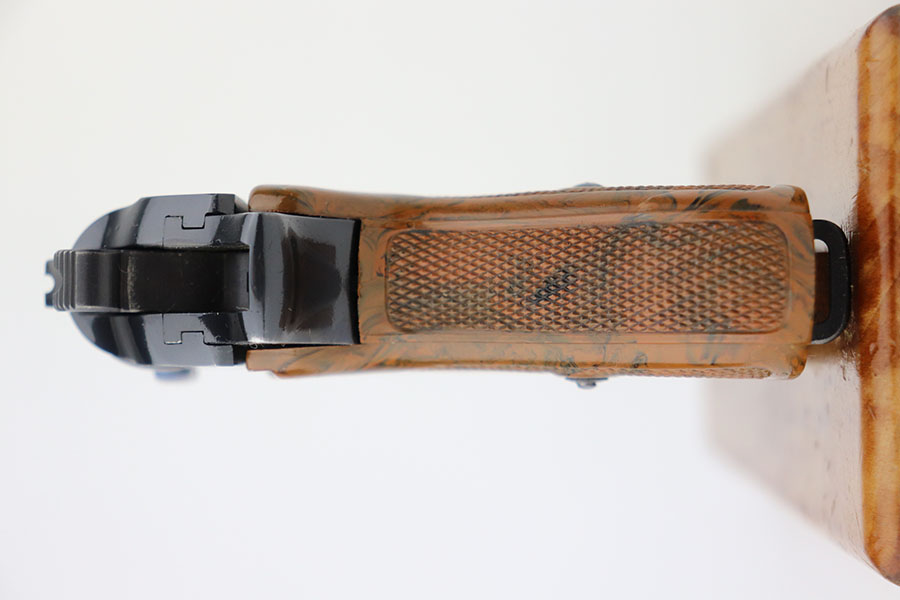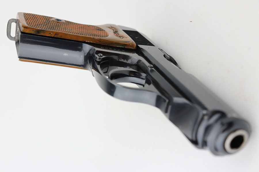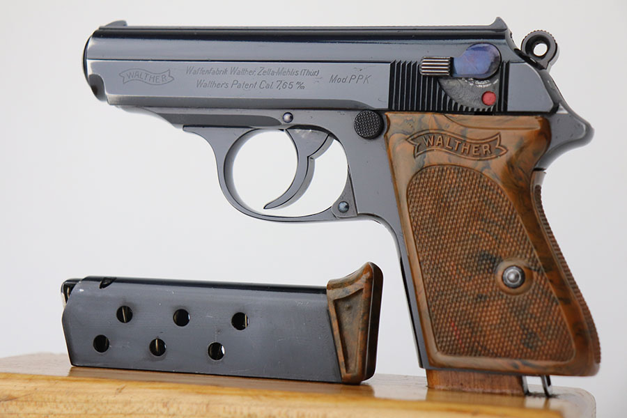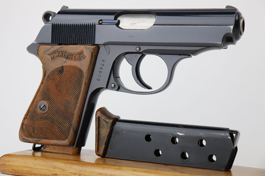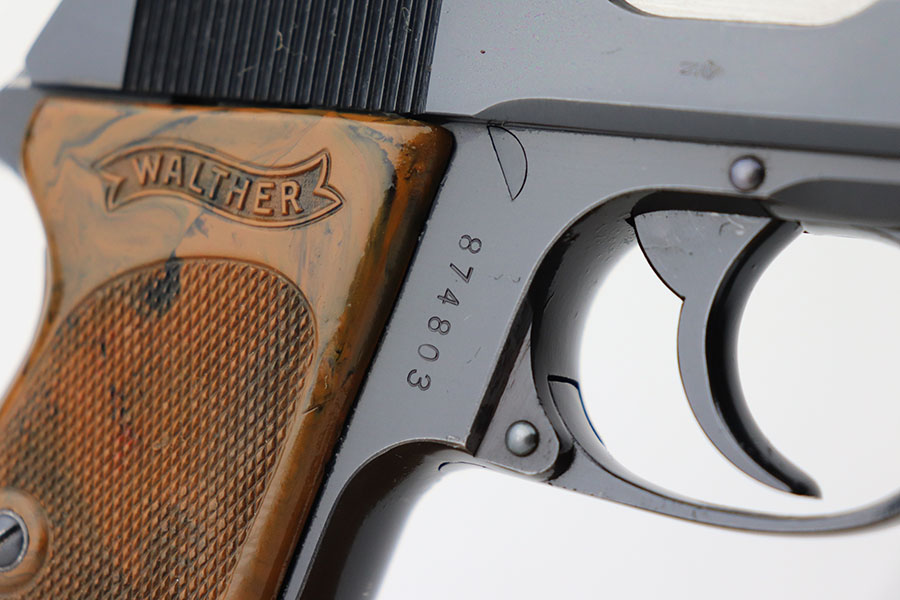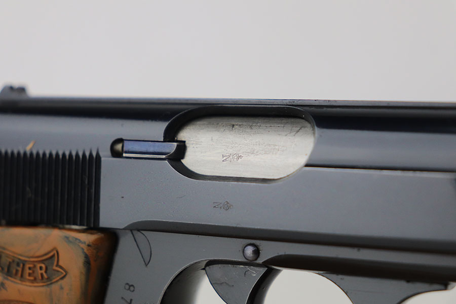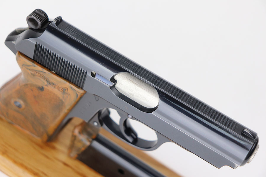 4/21/21 – This is a near-mint Walther PPK from 1935. Made for the German commercial market, it has minor wear on the left side of the muzzle, and a small spot of bluing loss on the front strap. Excellent fire blue remains on the safety. Mint bore. Excellent grip with no cracks. Minty finger extension magazine. Hischier collection.
