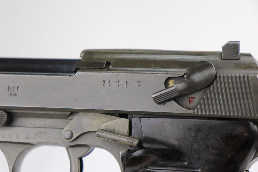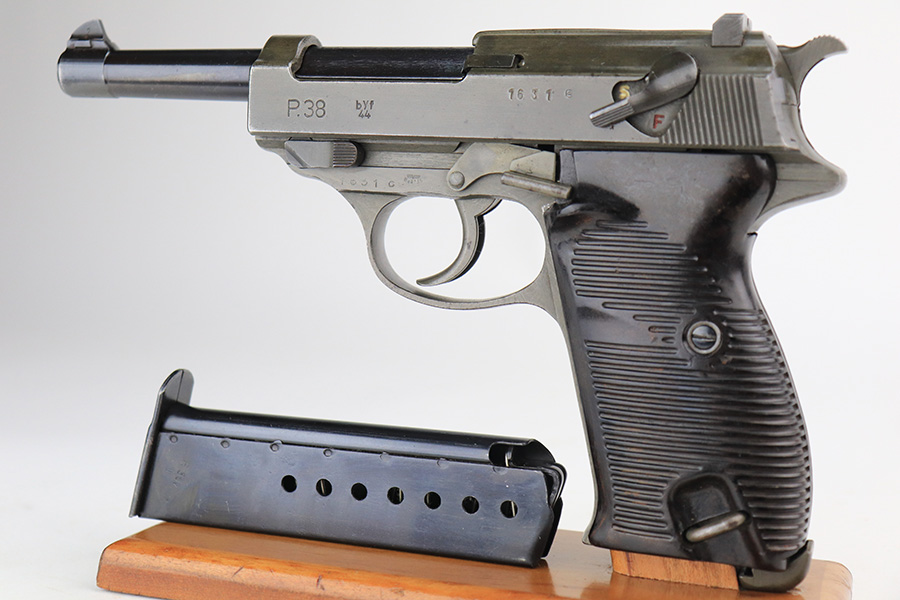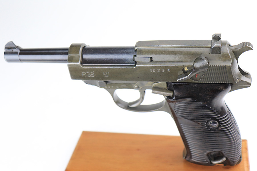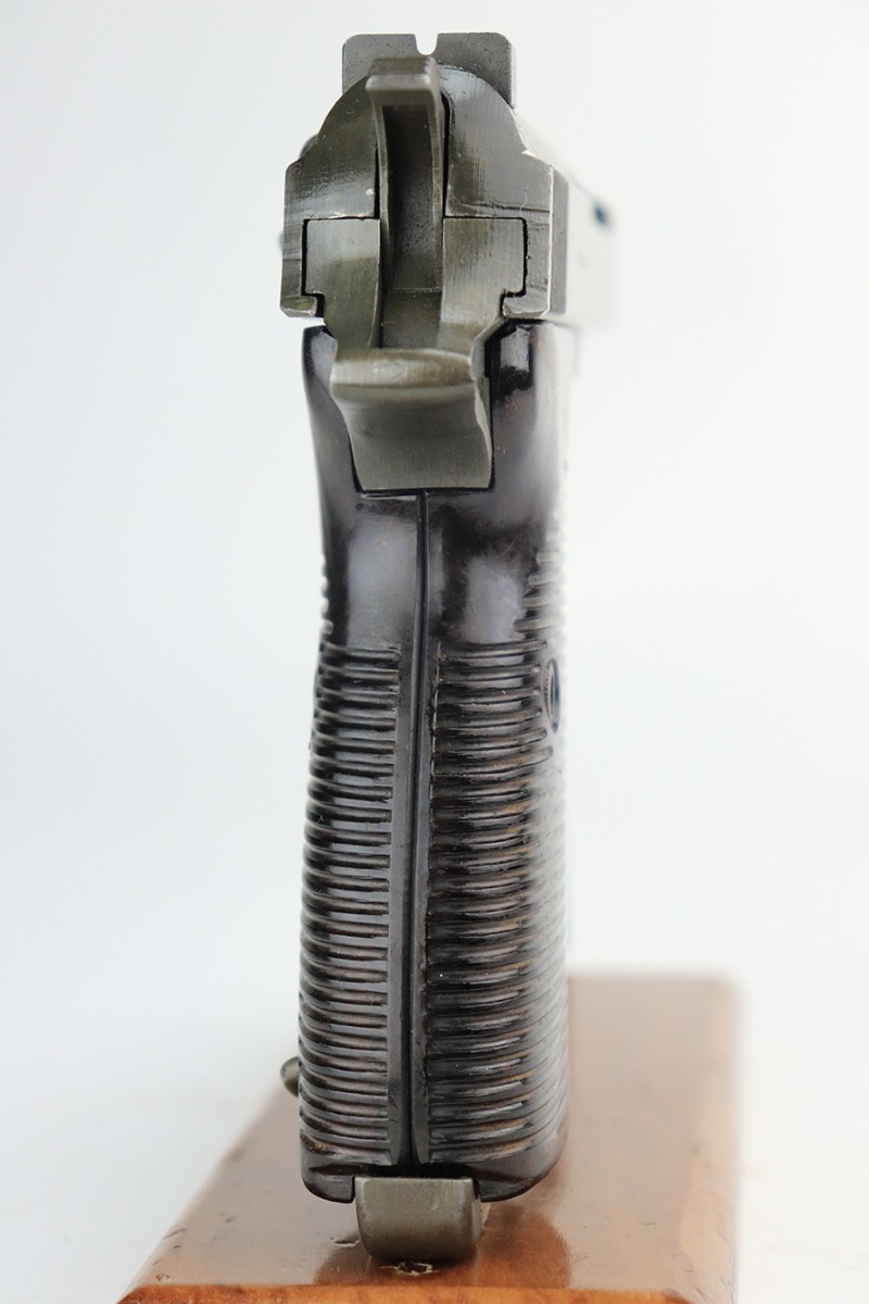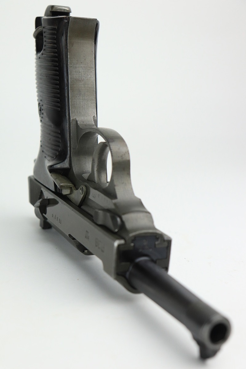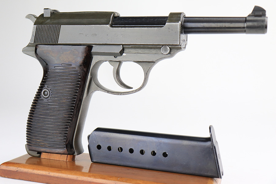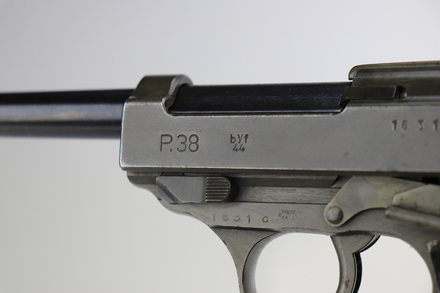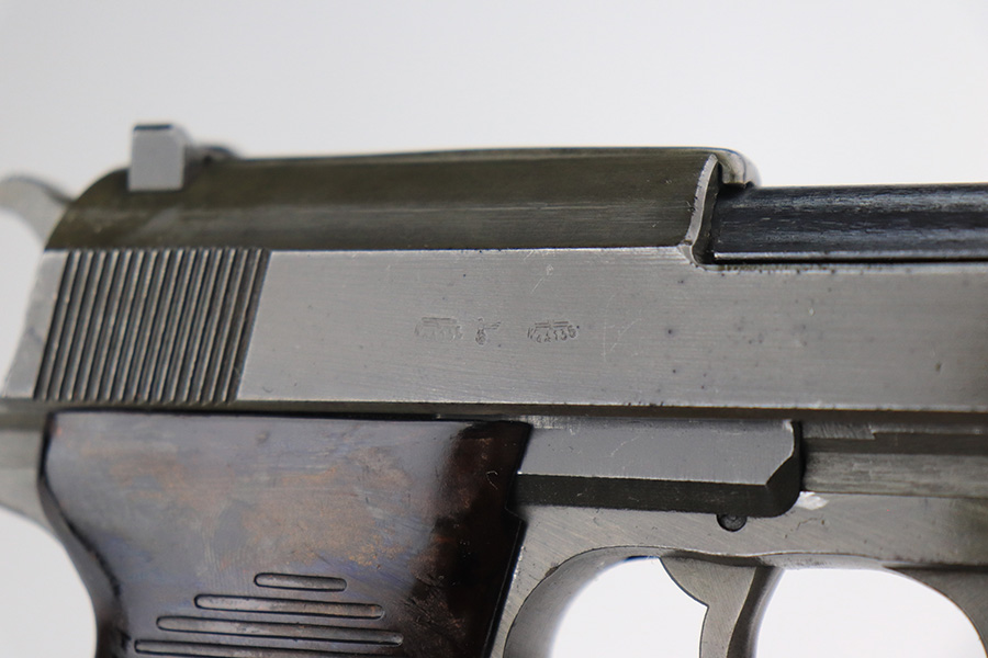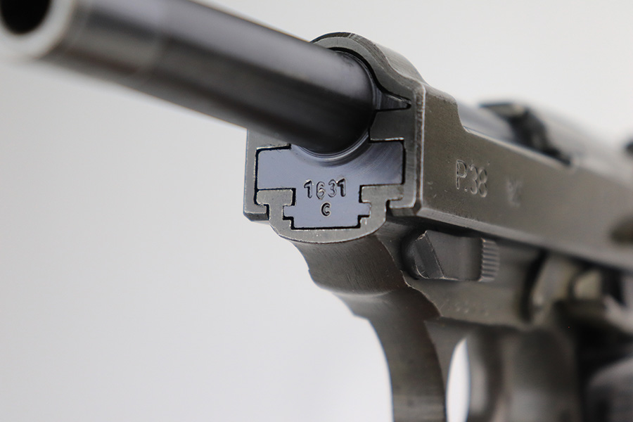 12/2/21 – This is a beautiful Nazi Mauser P.38 with dual-tone finish, one of only ~18,000 produced. It’s all matching and original, with blued barrel but phosphate slide, frame and small parts. The finish shows just a tiny hint of edge wear, and the standard “splotchy” finish found on these dual-tones. Strong, shiny bore with just a tiny bit of frost. Good mechanically, including the de-cocker. Very nice grips, dark brown in color, with no cracks or chips.