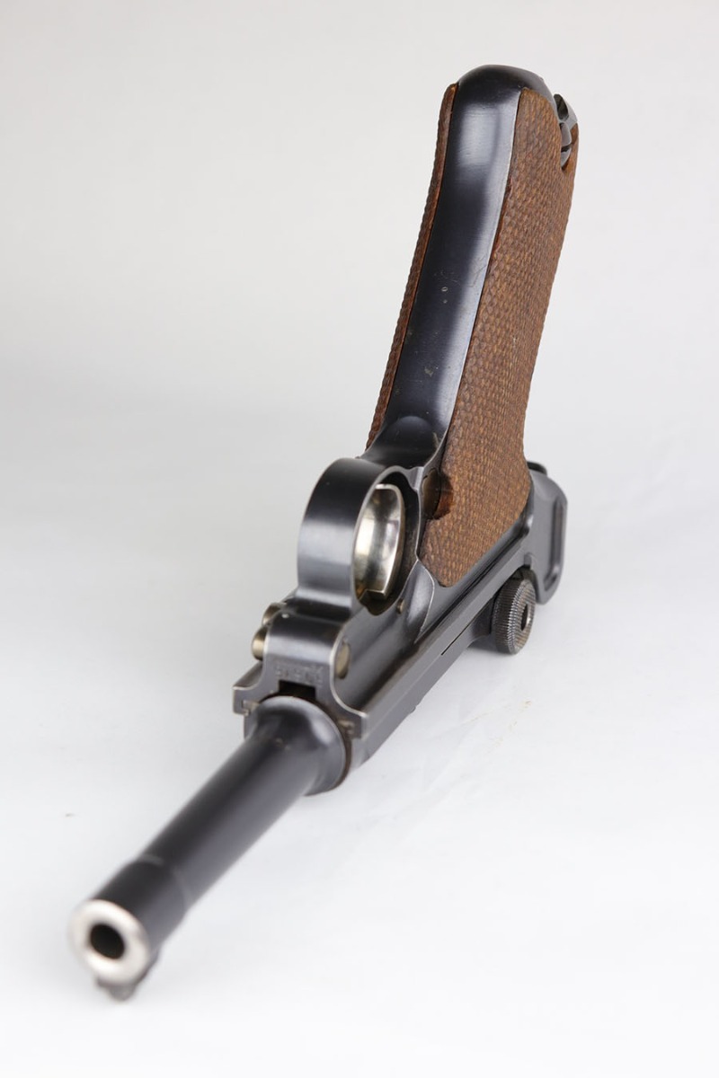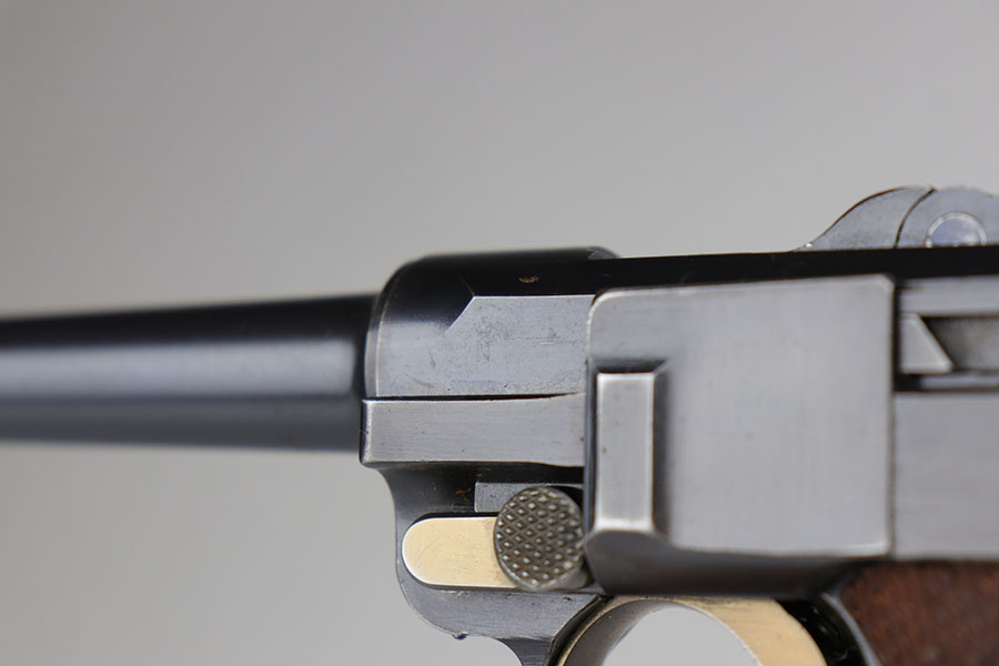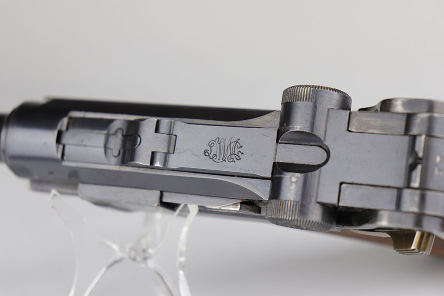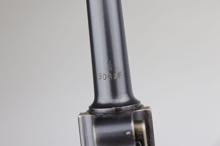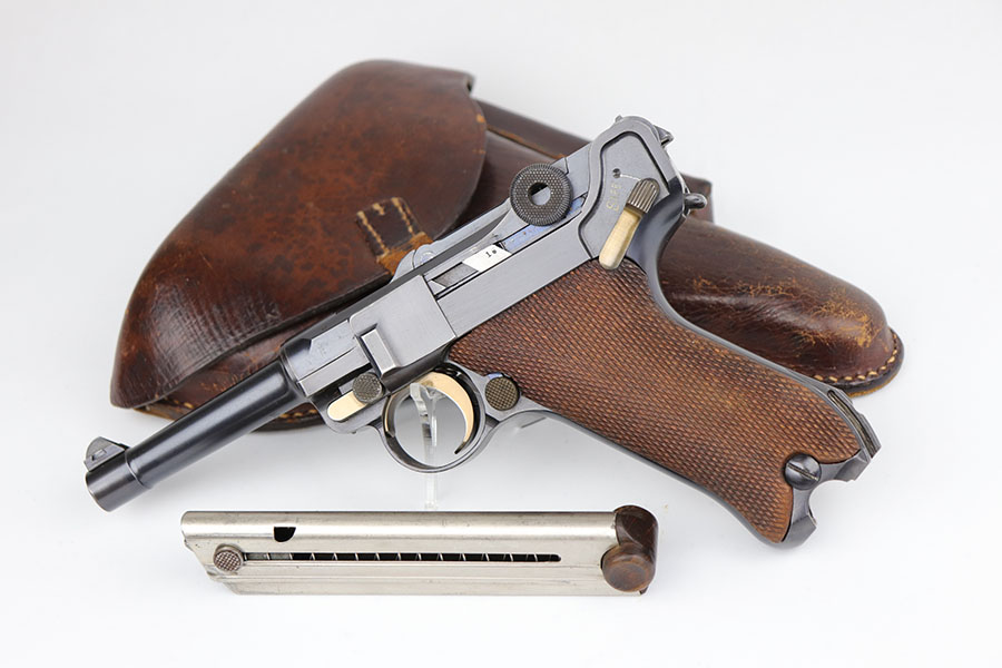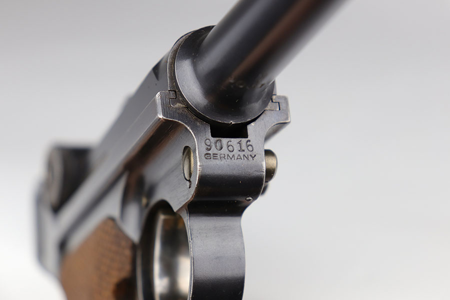 6/24/20 – This is a near-mint 1920 DWM commercial Luger with a commercial holster that is marked Nurnberg. The gun has 98% of the original blue with a bit of high edge wear from the holster, and minor finish loss on the rear of the frame/receiver. Beautiful strawed small parts. Mint bore. Chambered for .30 Luger. Original commercial magazine. Excellent unmarked grips. Germany export mark on front of frame.