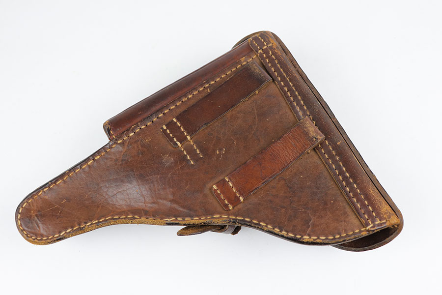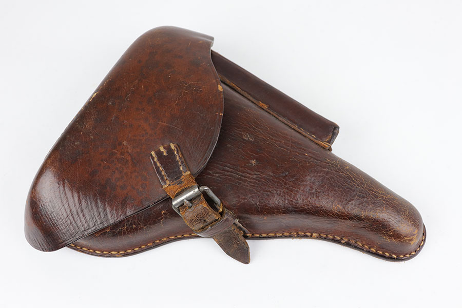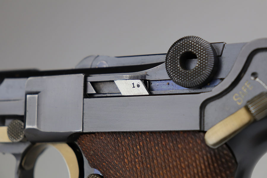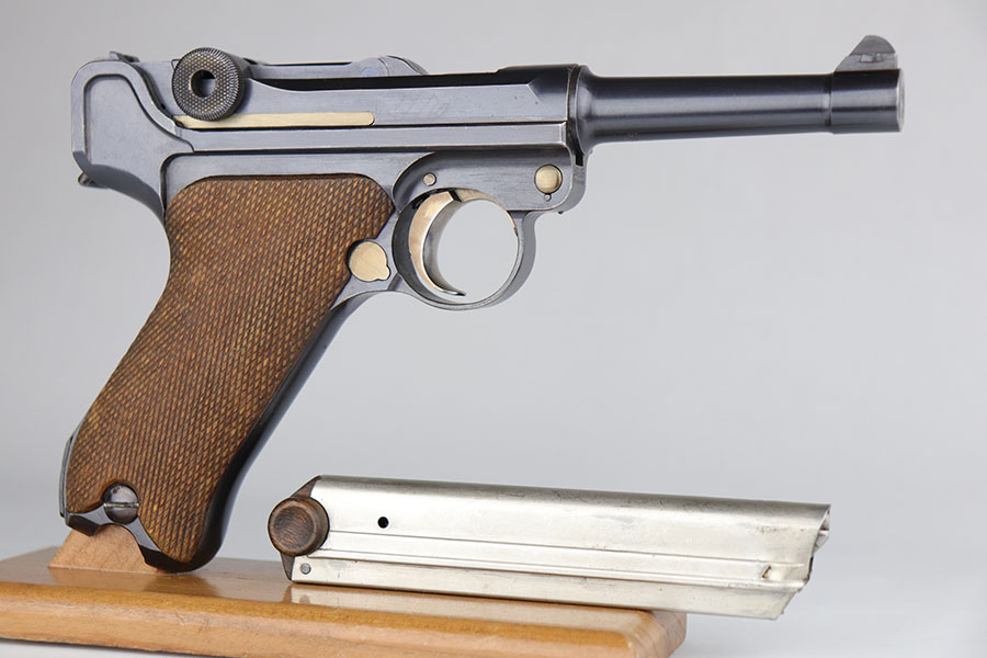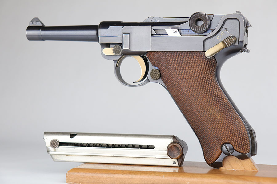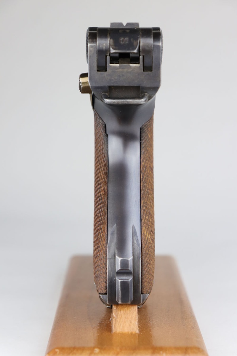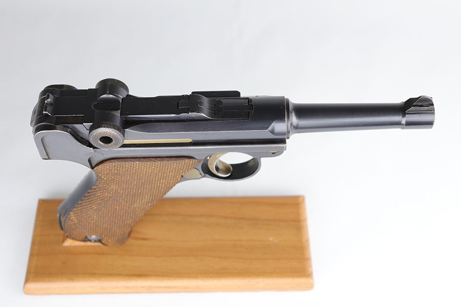 6/24/20 – This is a near-mint 1920 DWM commercial Luger with a commercial holster that is marked Nurnberg. The gun has 98% of the original blue with a bit of high edge wear from the holster, and minor finish loss on the rear of the frame/receiver. Beautiful strawed small parts. Mint bore. Chambered for .30 Luger. Original commercial magazine. Excellent unmarked grips. Germany export mark on front of frame.