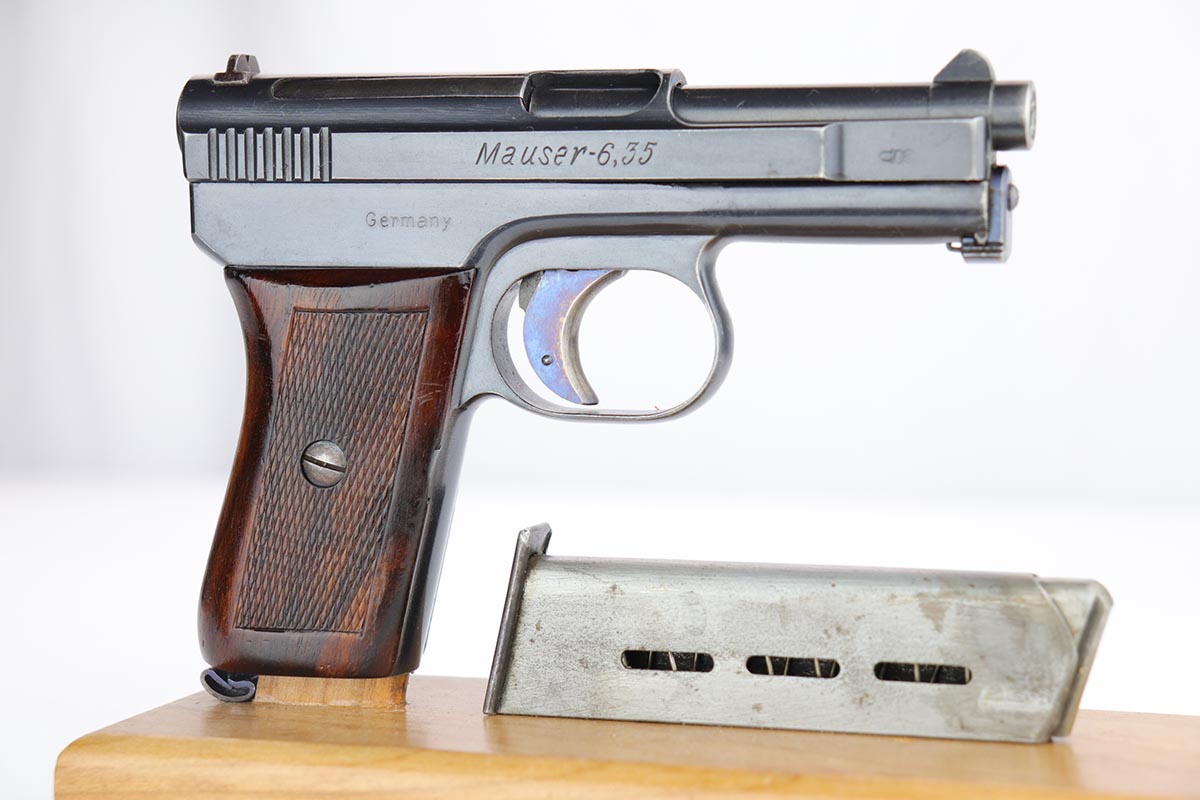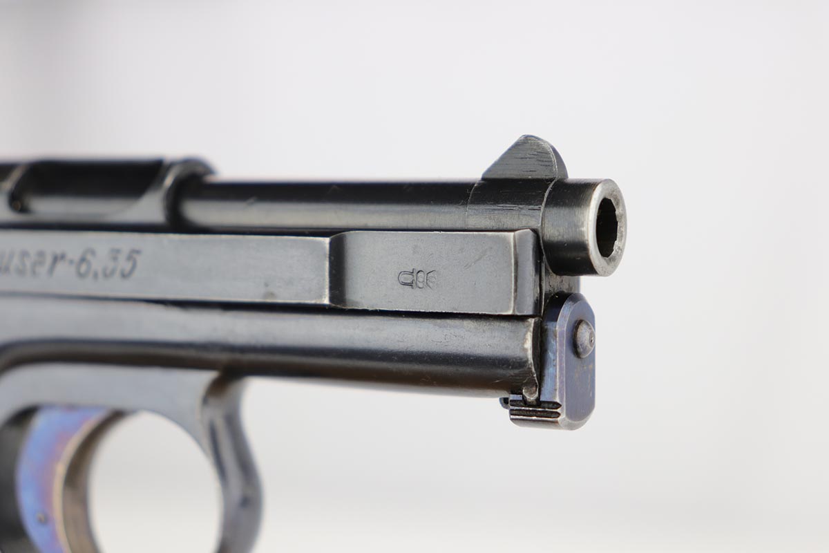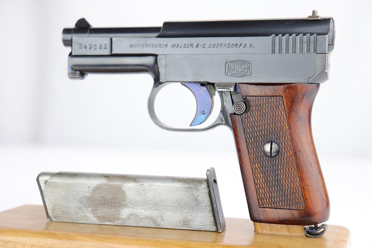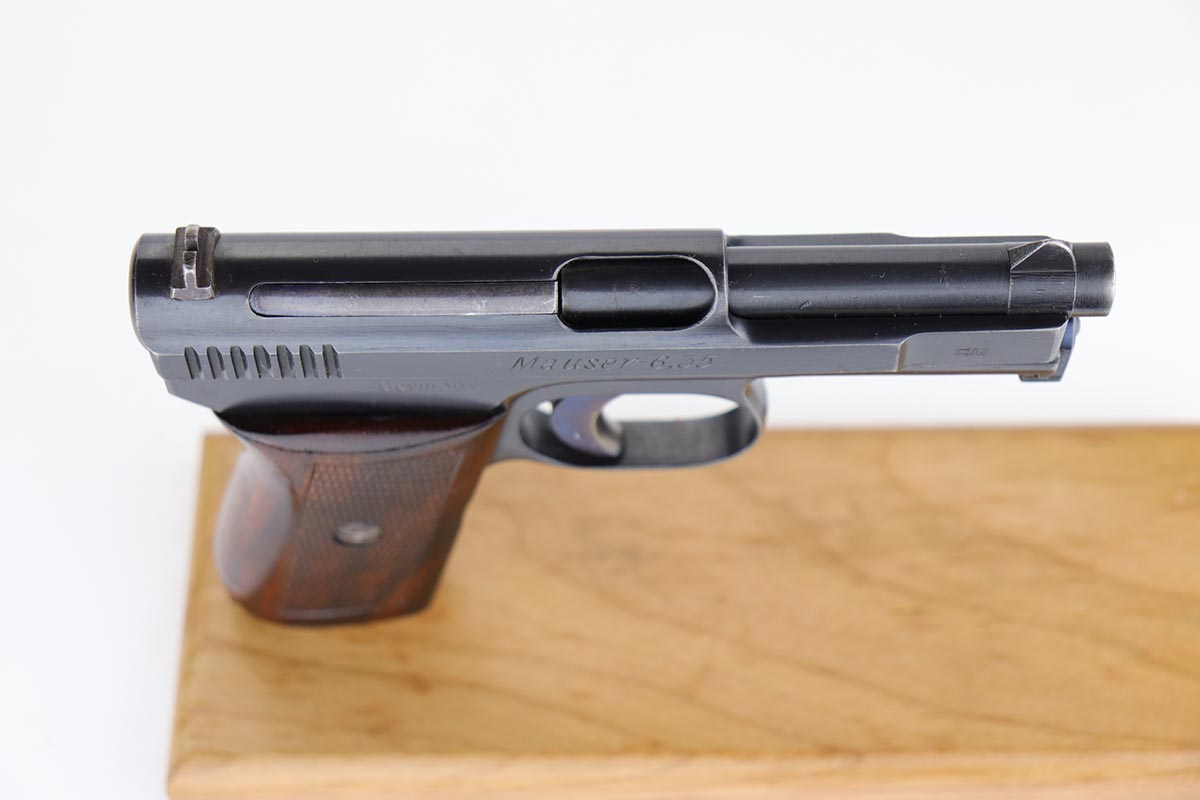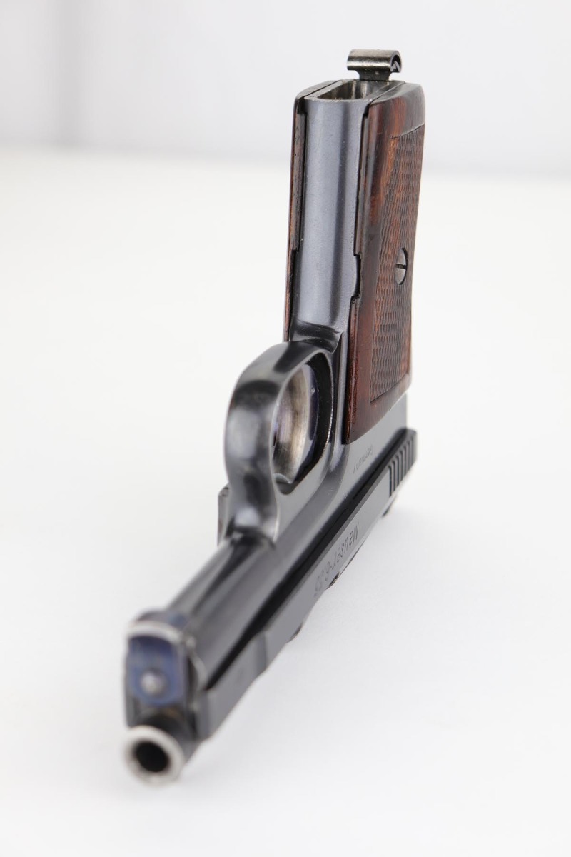 2/3/20 – This is an excellent Mauser M1910 that is all matching and original with 97-98% blue remaining. There is minor high edge wear, and a little bit of finish loss on the trigger guard. Minty bore and excellent grip. Some small parts still show excellent fire blue. Germany export mark on right side of frame.