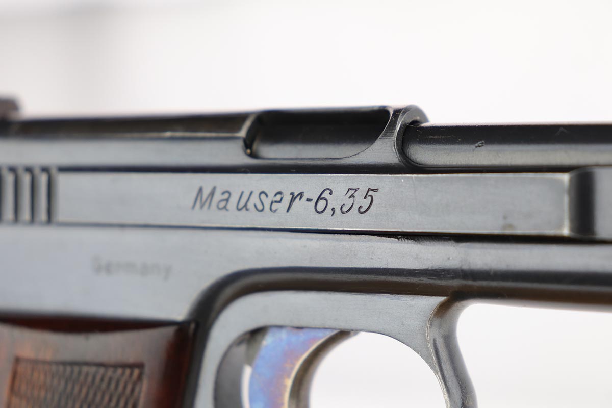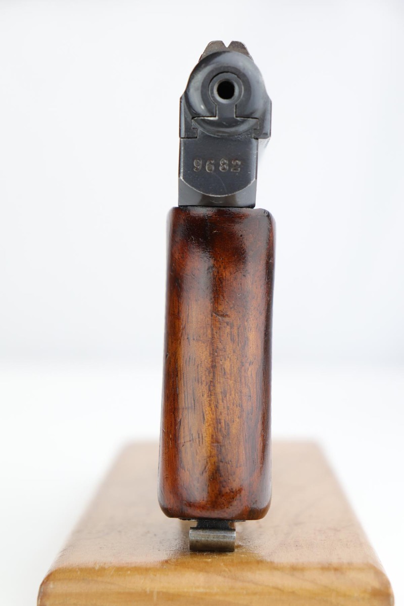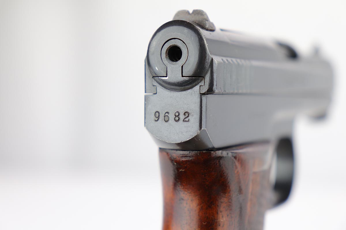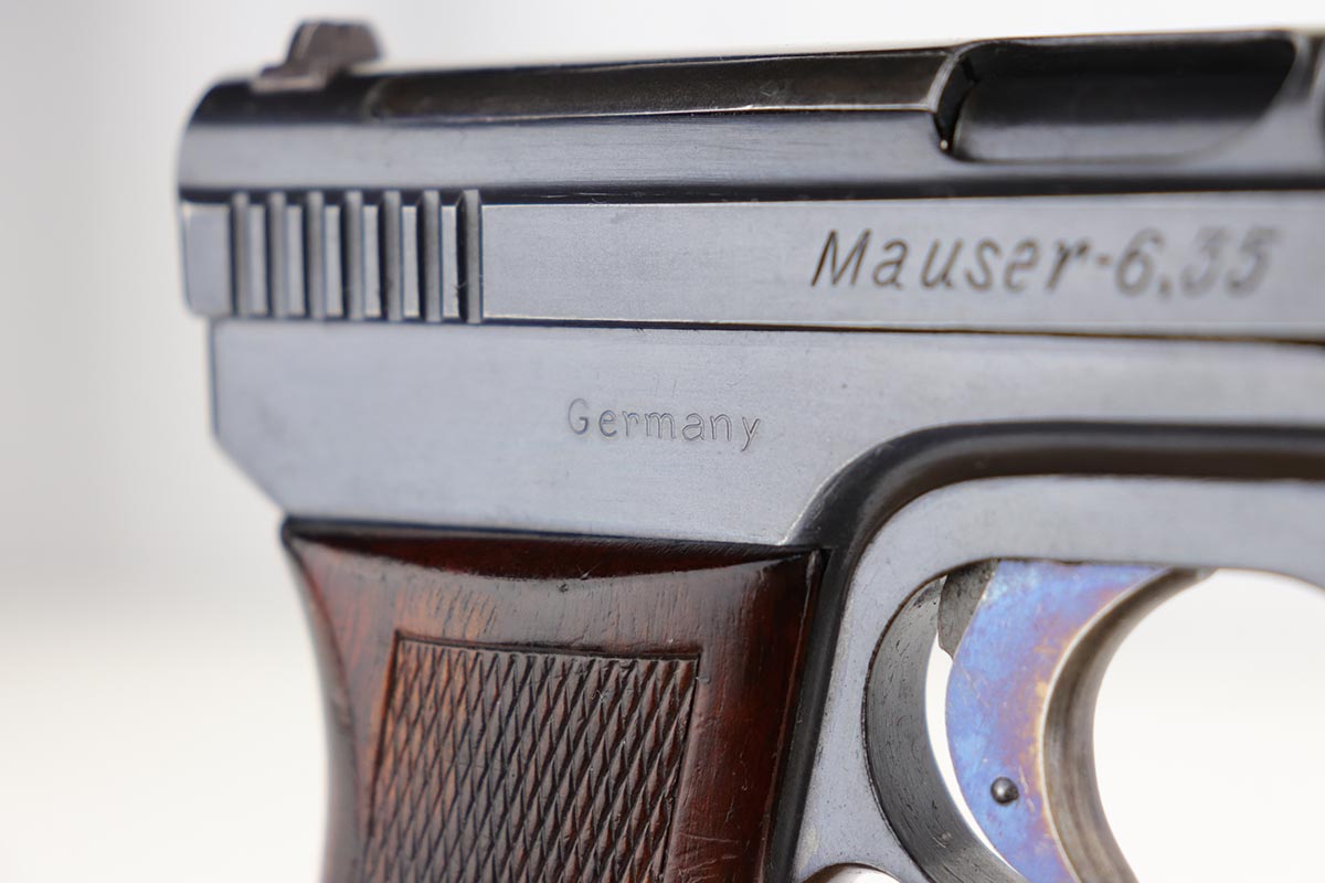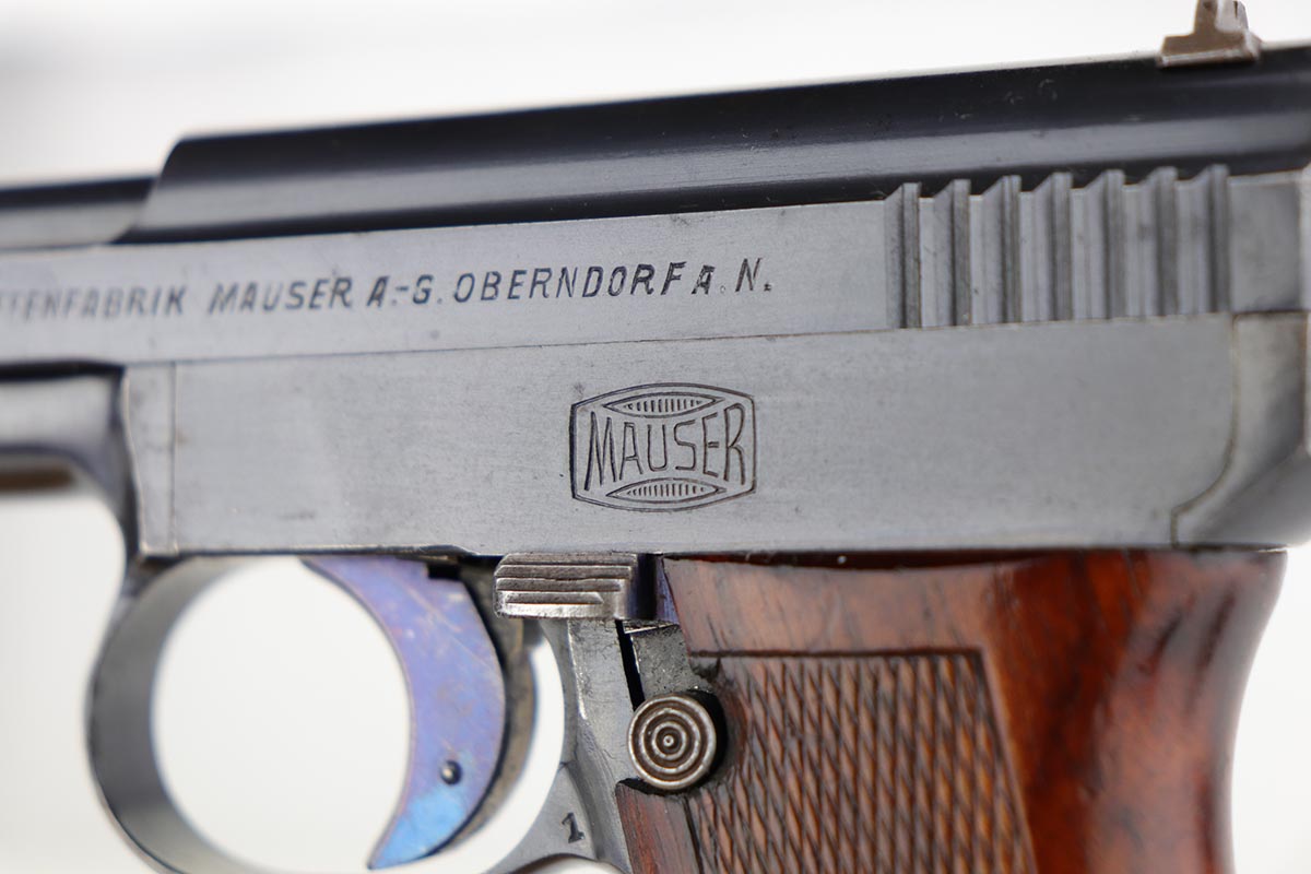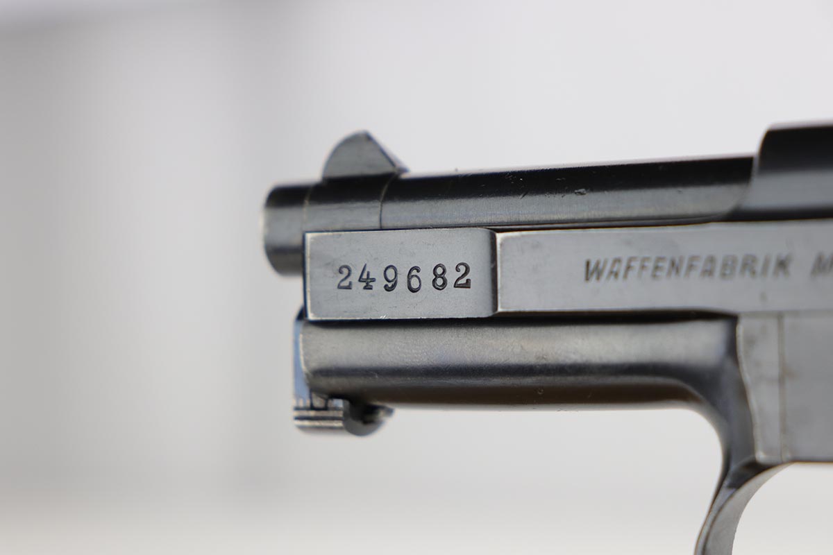 2/3/20 – This is an excellent Mauser M1910 that is all matching and original with 97-98% blue remaining. There is minor high edge wear, and a little bit of finish loss on the trigger guard. Minty bore and excellent grip. Some small parts still show excellent fire blue. Germany export mark on right side of frame.