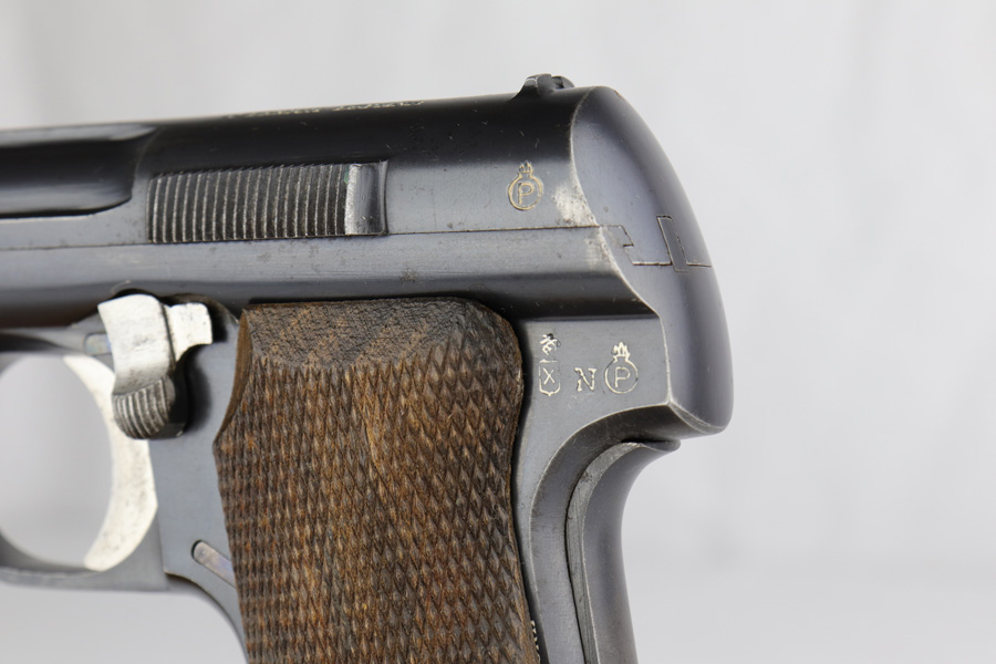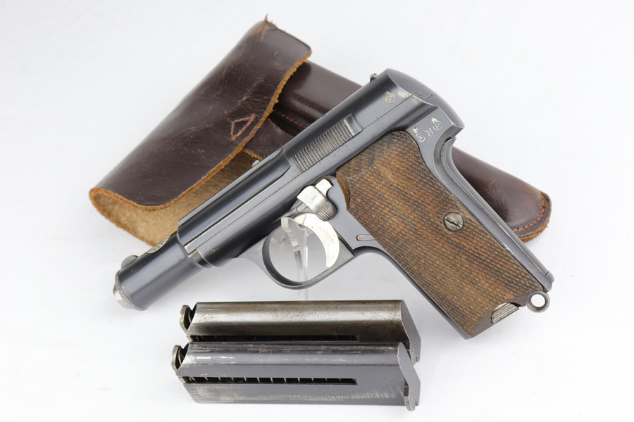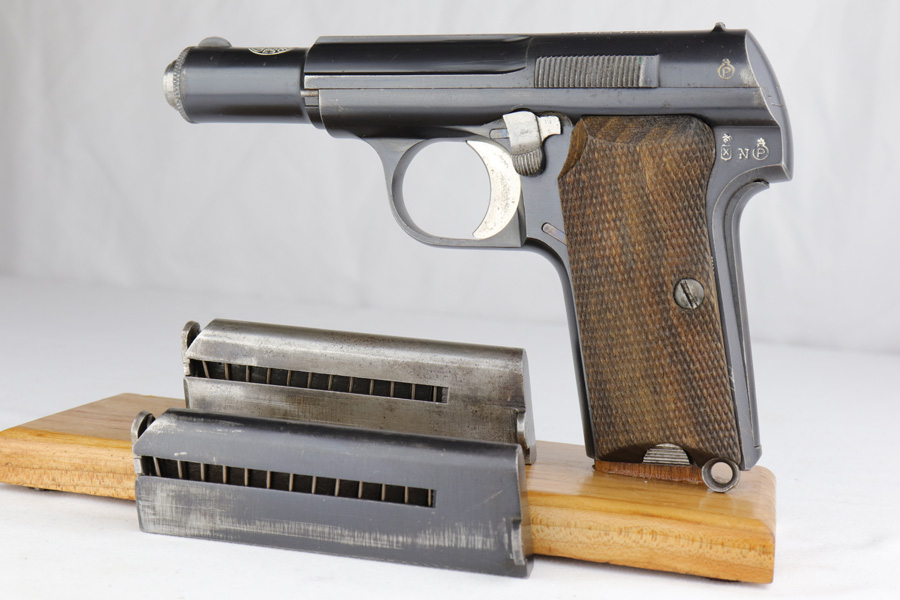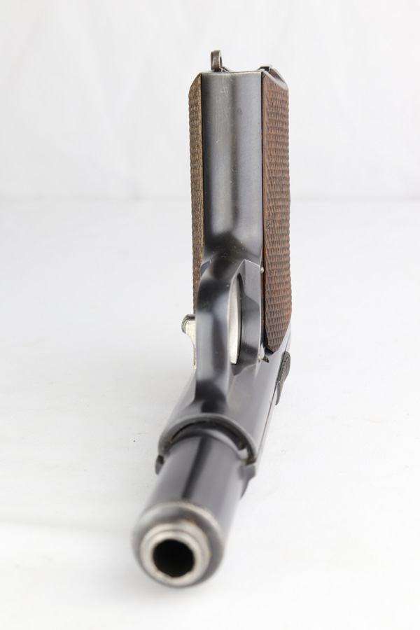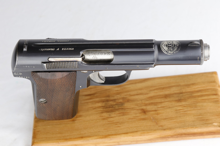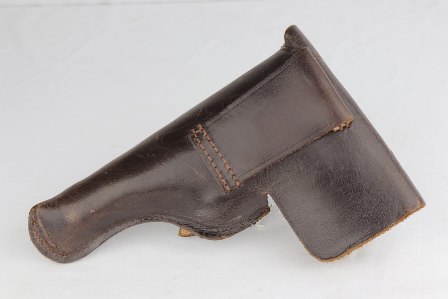 12/10/20 – This is a beautiful Nazi Astra 300 rig, all complete and original. It is all correct with minor finish loss on the straps but a beautiful profile. This particular pistol was shipped on January 16th of 1943, one of the first few hundred produced that year. It comes with two correct magazines and an original holster. The holster is in excellent condition with clear internal inkstamp and 1943 date. Pistol grips are fantastic and bore is shiny with strong rifling.