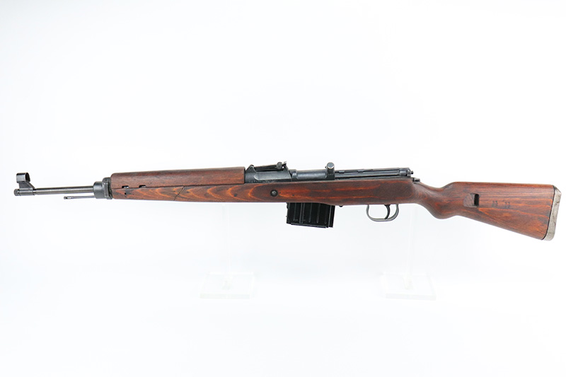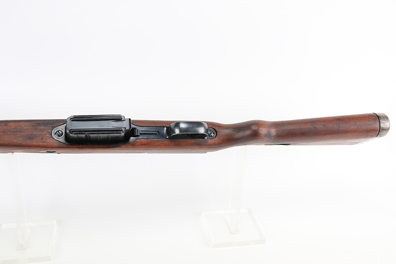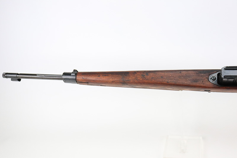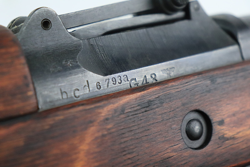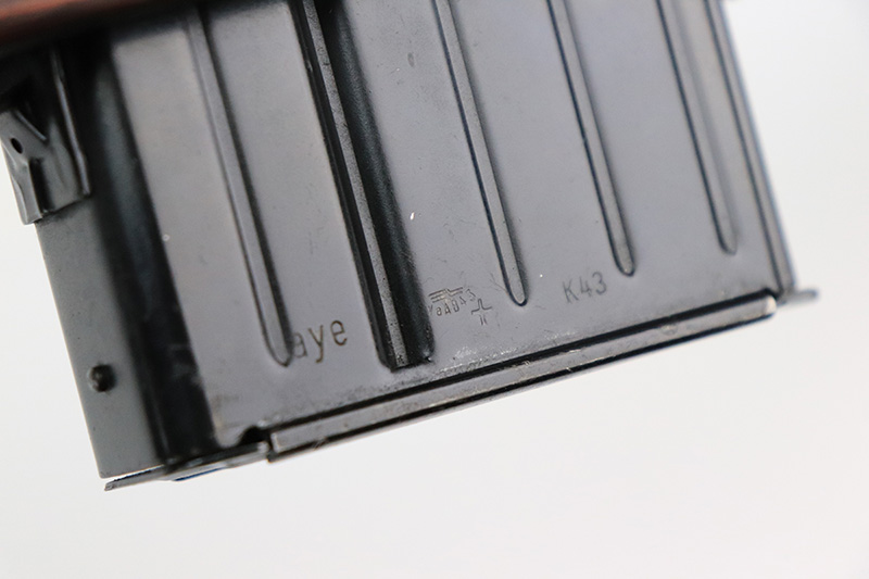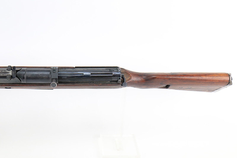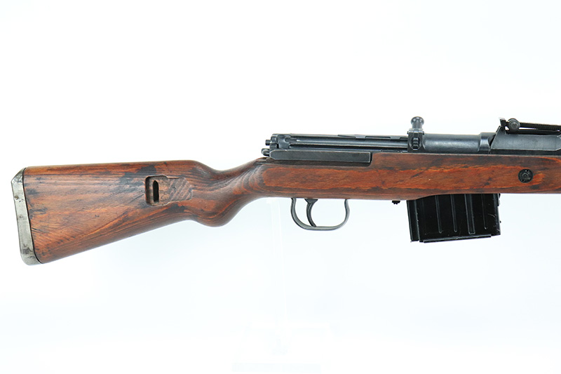 8/25/22 – This is a terrific example of an all matching Nazi G.43 rifle with bcd manufacturer’s code. These rifles were the first true production G43 rifles. They are characterized by the type 1 milled receiver and milled components. It is estimated that approximately only 40,000 of this type were produced with the probability that this model was assembled at the Buchenwald concentration camp under the SS, as noted in “Hitler’s Garands”. The left side of the receiver is marked “bcd 6973a G.43” along the bottom with an asterisk/sunburst proof mark above it. The matching bolt carrier is also the early type 2 rough cast version similar to the G41 series of rifles that retains the solid cocking knob on the left side and the bolt hold open latch on the right side without the reinforcing web on top. The rifle is in fantastic condition with one major caveat, which is the duffel cut in the stock. The original finish on the metal parts is otherwise excellent, as is the condition of the wood parts. It has several sharp waffenamts and the matching serial number is clearly marked. Comes with original cleaning rod and sight hood, and has an ‘aye’ marked magazine. Bore is shiny with strong rifling but has minor frost at some points.
