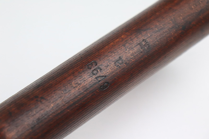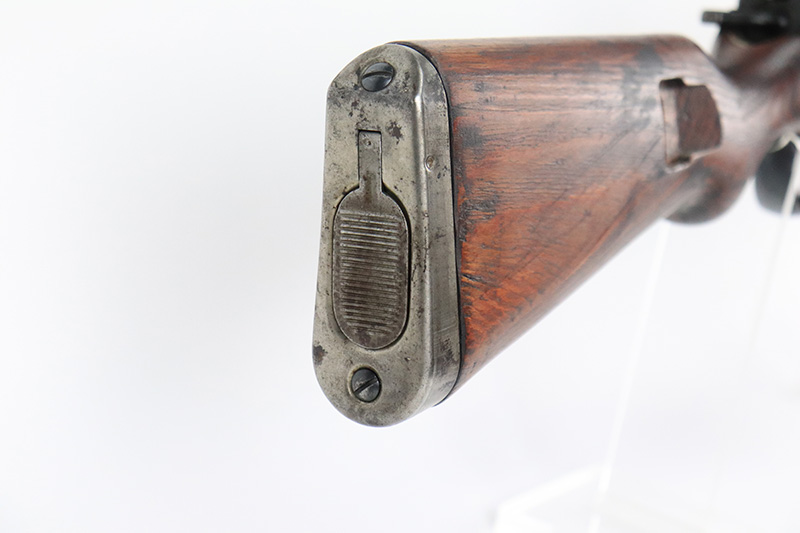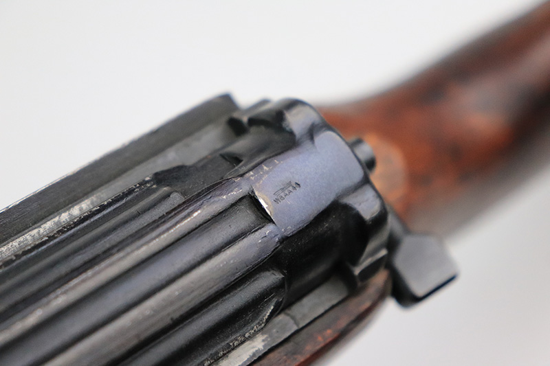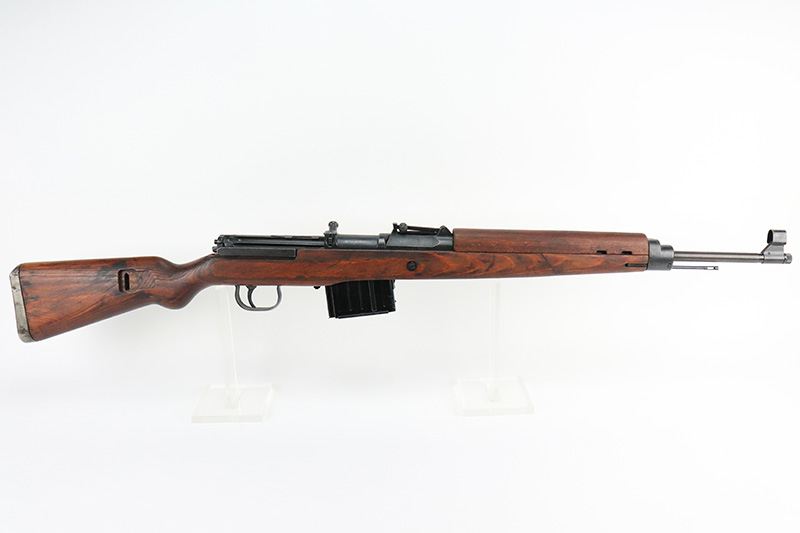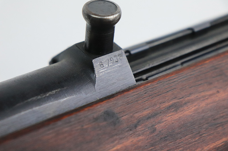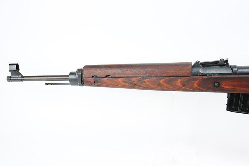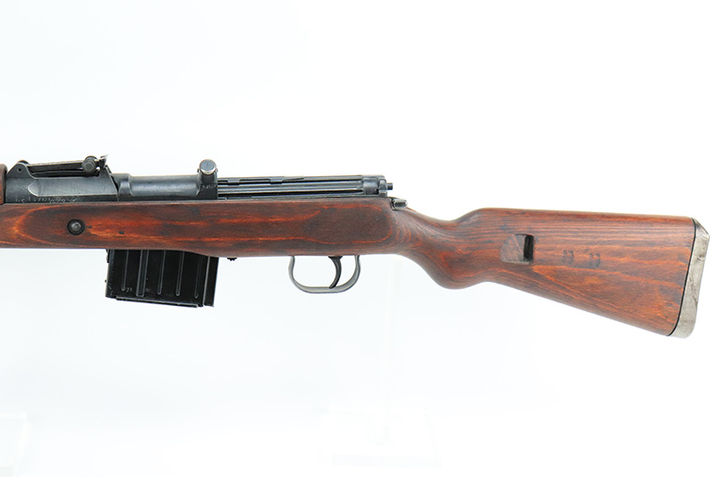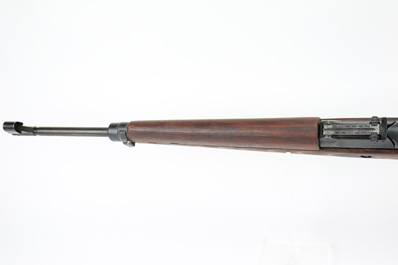 8/25/22 – This is a terrific example of an all matching Nazi G.43 rifle with bcd manufacturer’s code. These rifles were the first true production G43 rifles. They are characterized by the type 1 milled receiver and milled components. It is estimated that approximately only 40,000 of this type were produced with the probability that this model was assembled at the Buchenwald concentration camp under the SS, as noted in “Hitler’s Garands”. The left side of the receiver is marked “bcd 6973a G.43” along the bottom with an asterisk/sunburst proof mark above it. The matching bolt carrier is also the early type 2 rough cast version similar to the G41 series of rifles that retains the solid cocking knob on the left side and the bolt hold open latch on the right side without the reinforcing web on top. The rifle is in fantastic condition with one major caveat, which is the duffel cut in the stock. The original finish on the metal parts is otherwise excellent, as is the condition of the wood parts. It has several sharp waffenamts and the matching serial number is clearly marked. Comes with original cleaning rod and sight hood, and has an ‘aye’ marked magazine. Bore is shiny with strong rifling but has minor frost at some points.