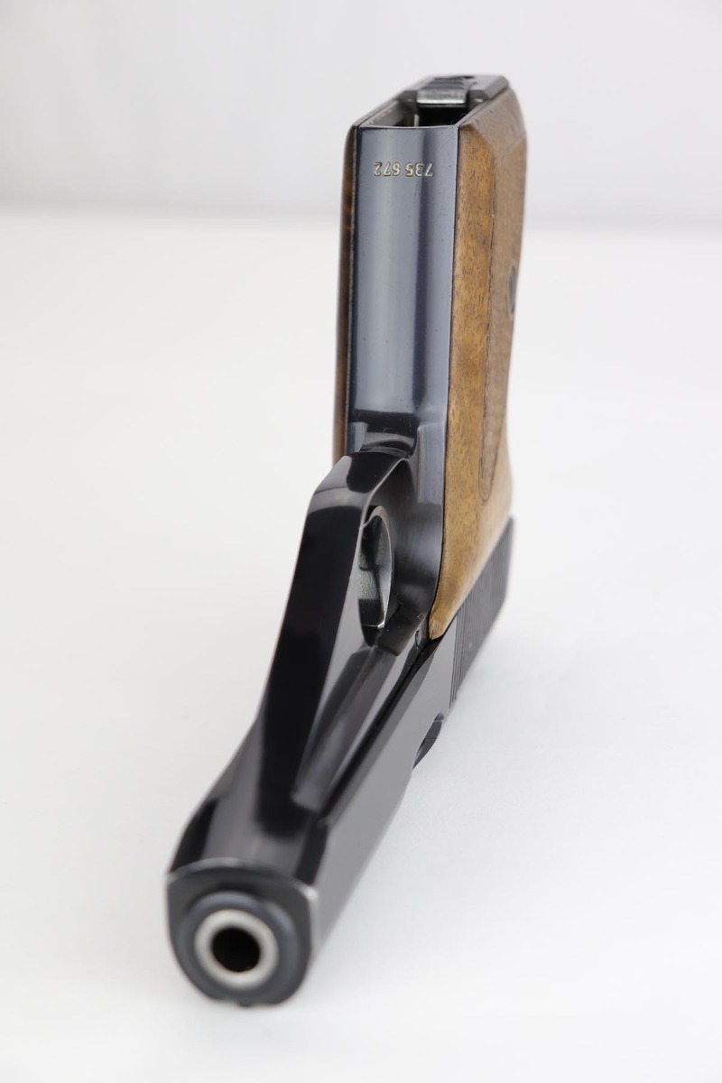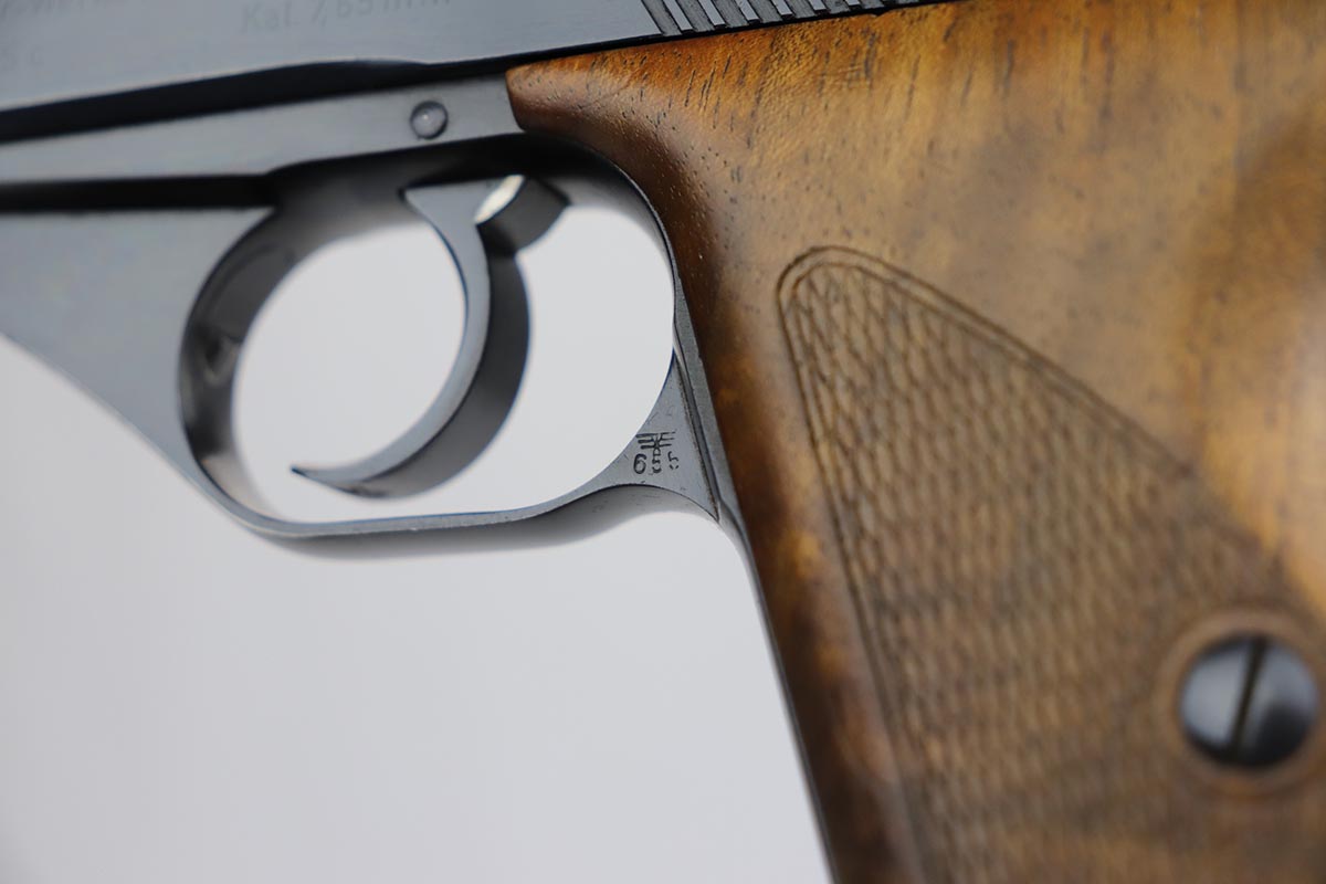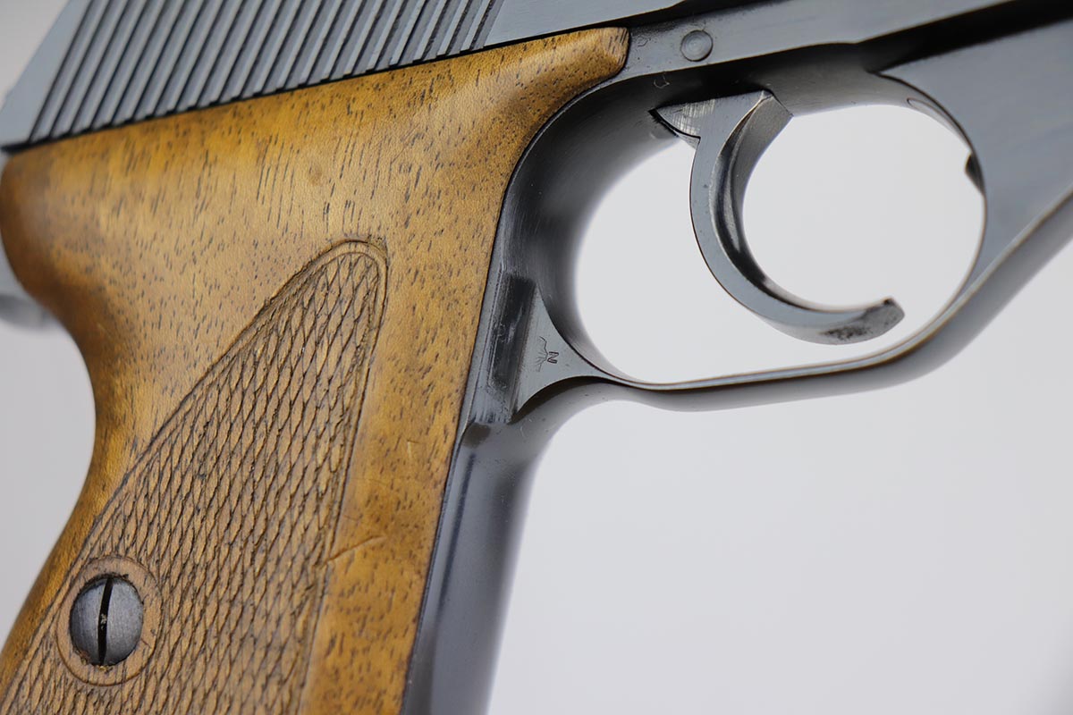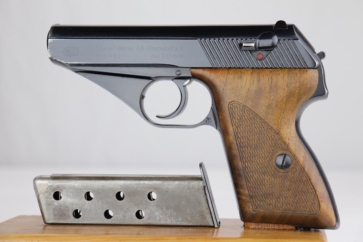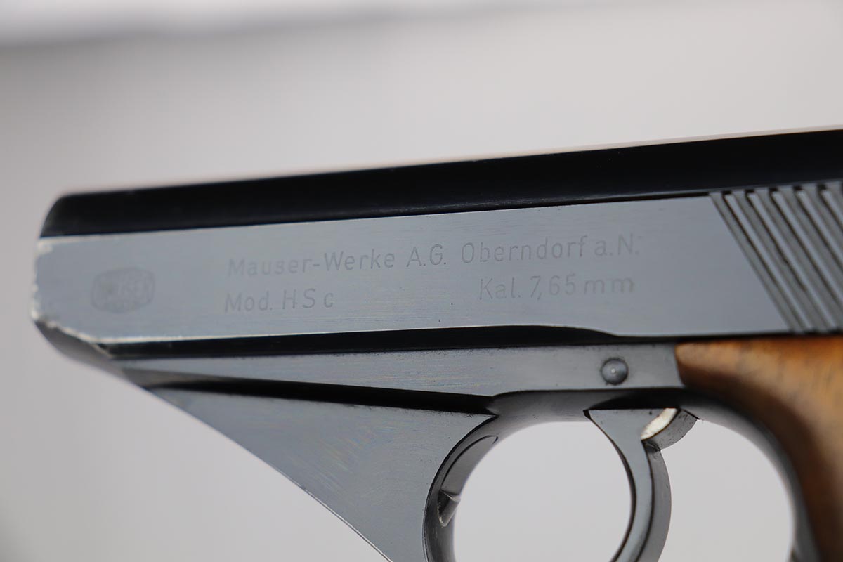 10/15/19 – This is a terrific, early Mauser HSc that was manufactured in 1941 for the German Army. It has 97-98% of the original high-polish blue, with most of the wear on the high edges of the slide, near the muzzle. There’s also minor finish loss on the bottom of the back strap. Terrific bore and grips. Mauser banner magazine. Eagle over 655 proof on frame.