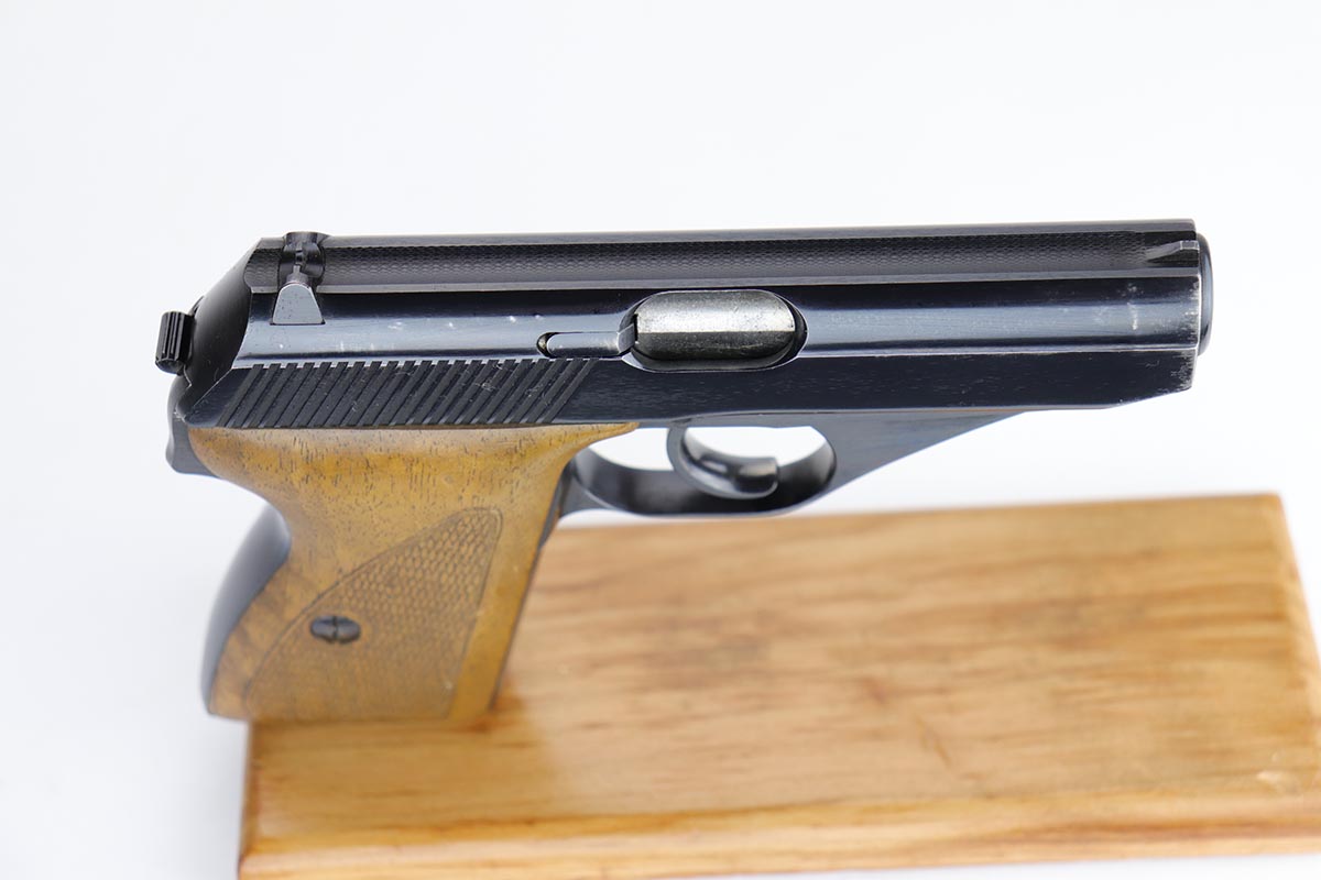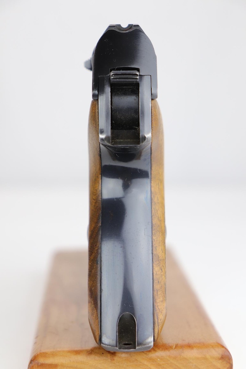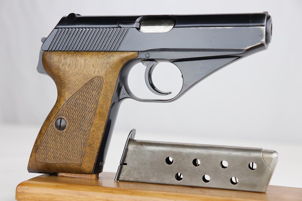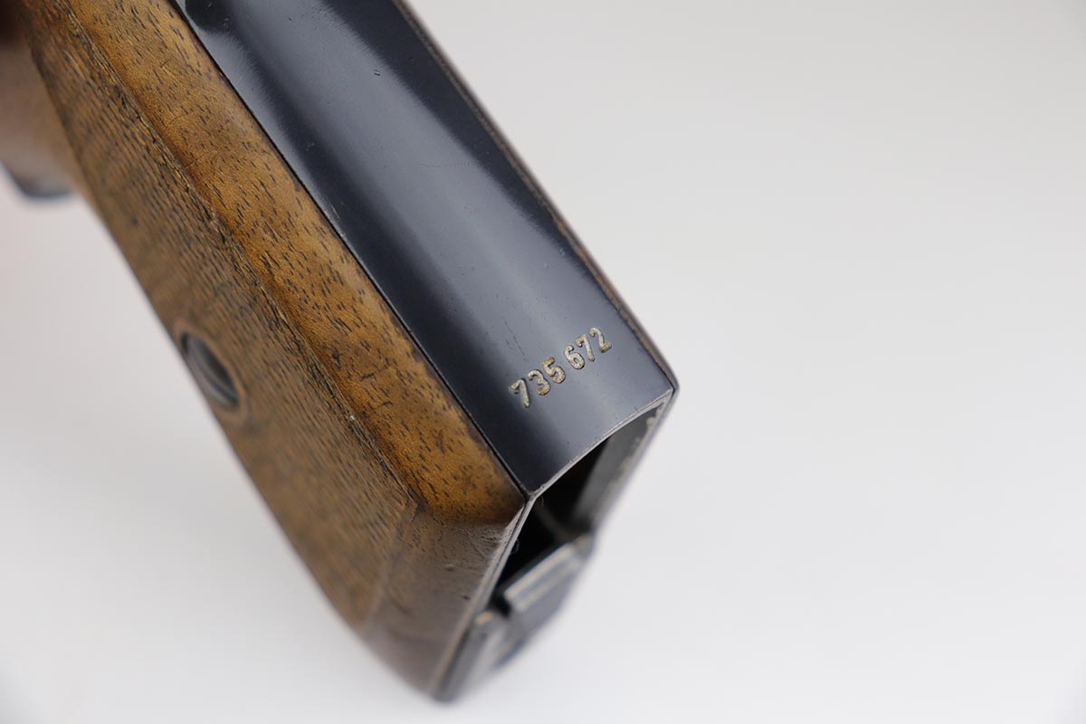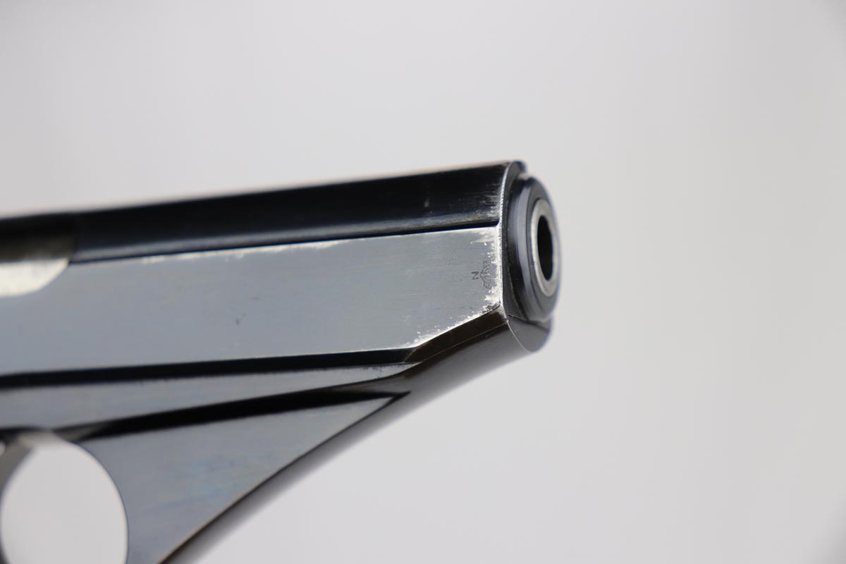 10/15/19 – This is a terrific, early Mauser HSc that was manufactured in 1941 for the German Army. It has 97-98% of the original high-polish blue, with most of the wear on the high edges of the slide, near the muzzle. There’s also minor finish loss on the bottom of the back strap. Terrific bore and grips. Mauser banner magazine. Eagle over 655 proof on frame.