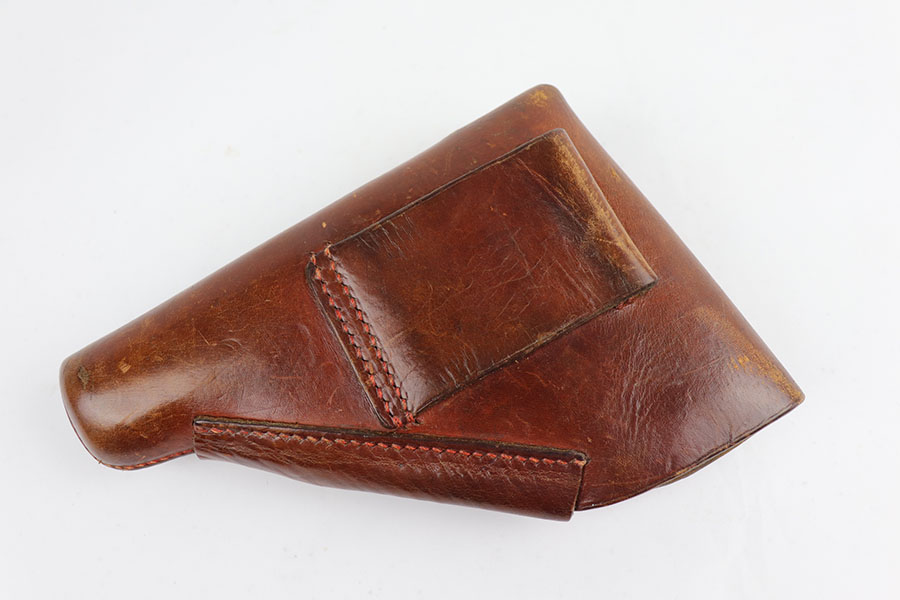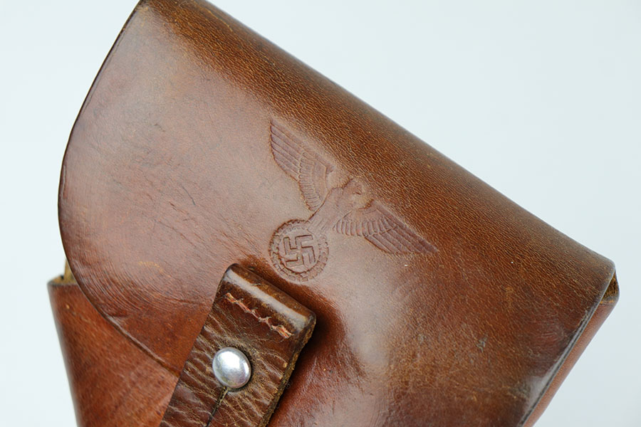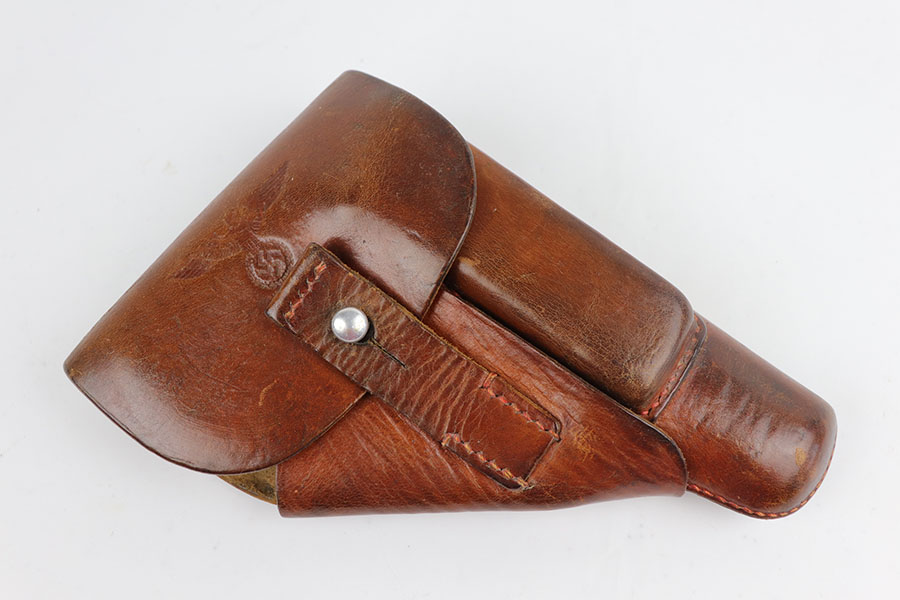 3/10/21 – This is an excellent and rare Party Leader Walther PPK rig. The gun is all original finish and rates at 95+% with muzzle wear on each side and an area of finish loss to the right of the ejection port. The serial dates it to 1939 and is in the correct range for the issuance of the Party Leader “Honor” Grip. The grip is excellent as well, with no cracks or chips, just a couple minor scratches on the right side. Nearly all PPK grips from that era will have tiny stress fractures and are to be expected if the grip is real. Minty bore and finger extension magazine. Rig includes an original Party Leader holster in excellent condition. The holster is in excellent condition and without defect.