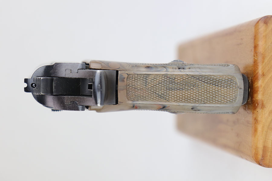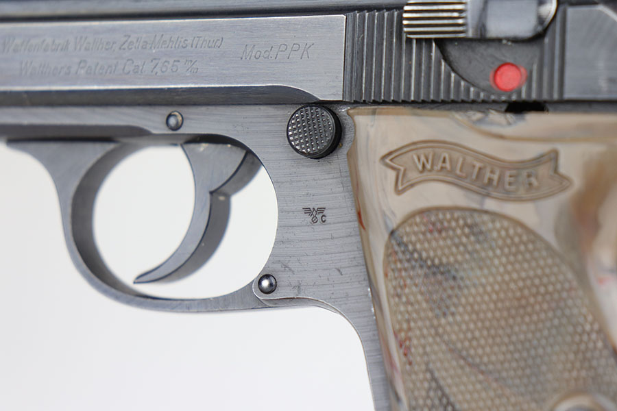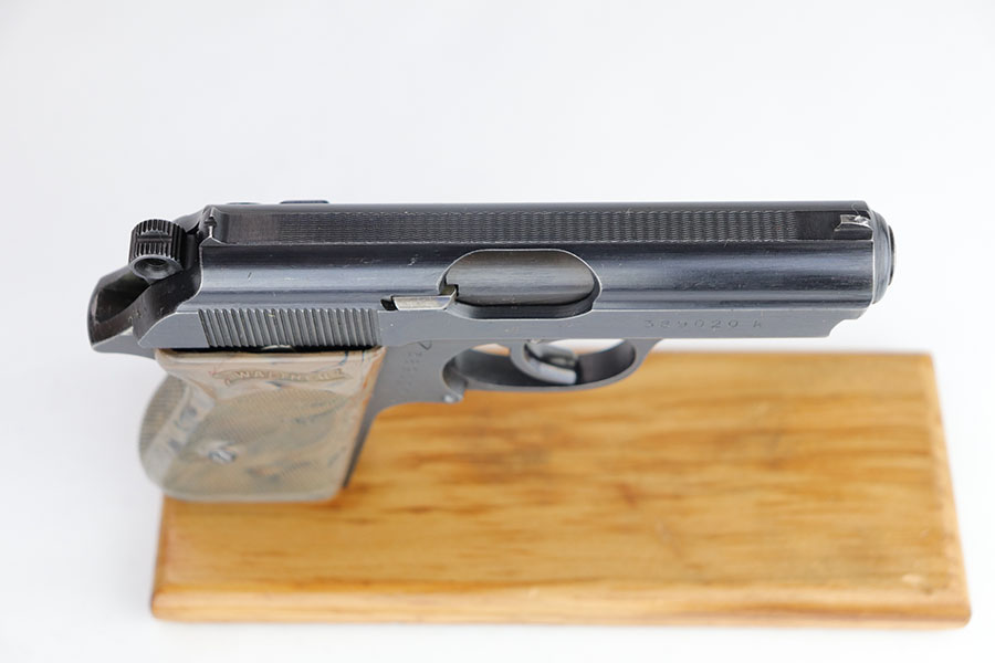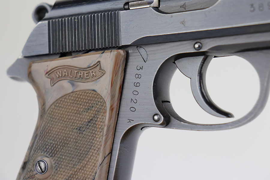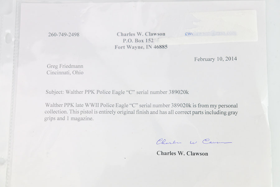 3/10/20 – This is a near-mint Walther PPK that was issued to the German Police during the Nazi era, and comes from the collection of Charles Clawson, best known for writing the book on the Colt 1911. It has 98+% of the military style blue remaining, with just some standard muzzle wear on the slide that is more pronounced on the left side. It has a beautiful gray grip with no cracks or chips. Excellent bore and banner magazine. Comes with signed document from Clawson.