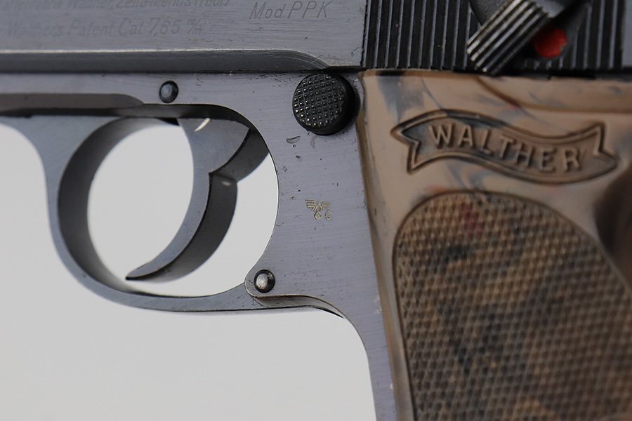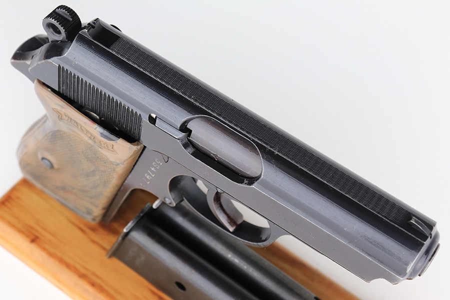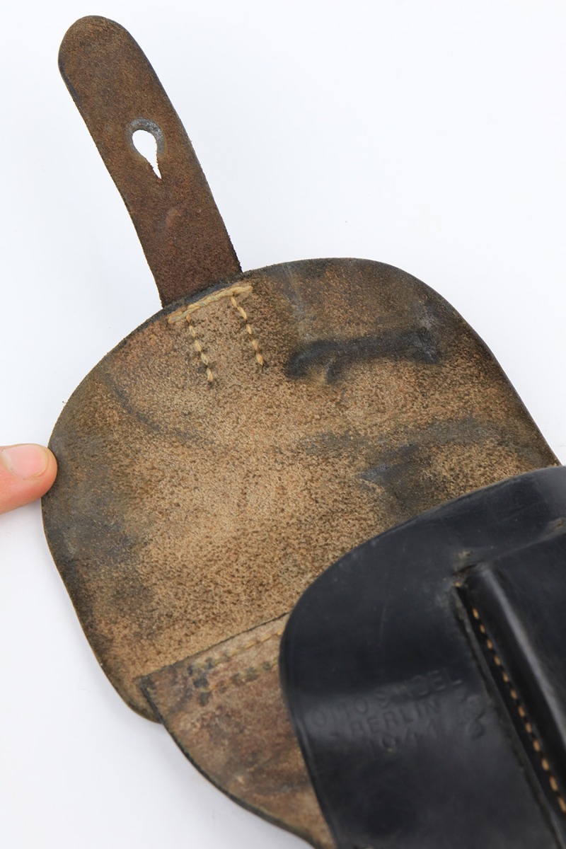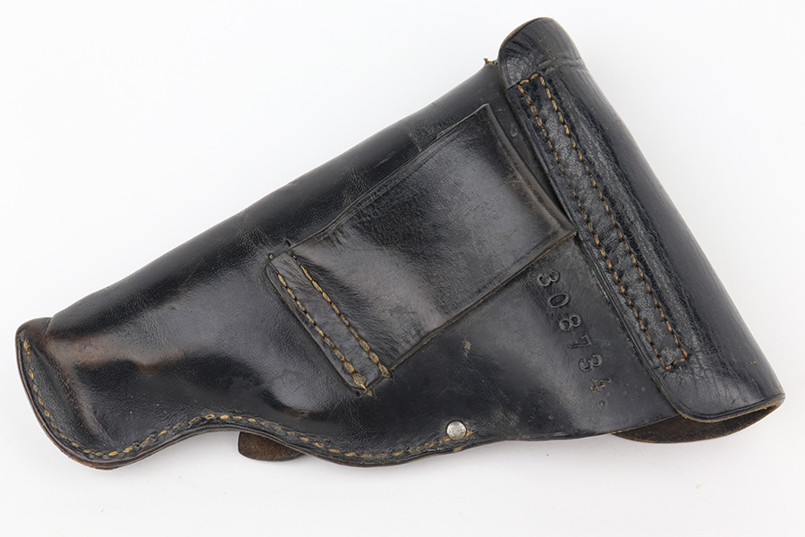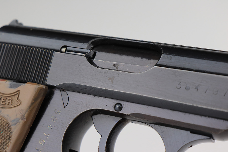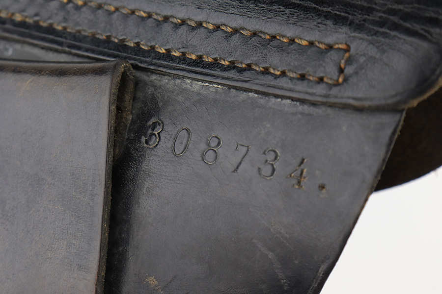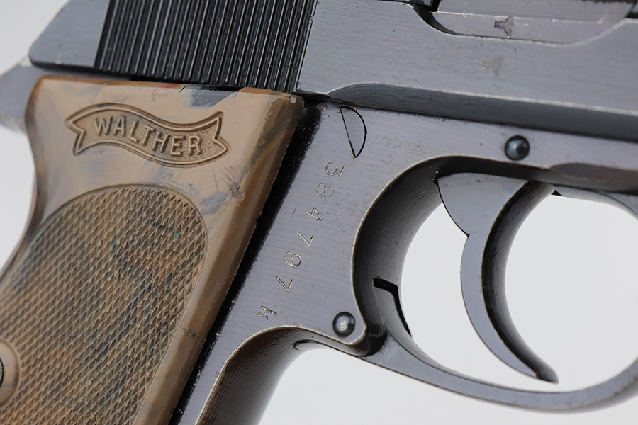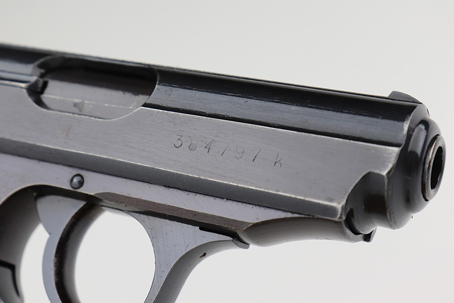 2/15/23 – This is a near-mint Walther PPK that was issued to the German Police in 1943. Eagle/C acceptance mark on frame. It has 97-98% of the military blue remaining with minor muzzle wear on both sides of the slide and a little thinning on the front strap. Mint bore. Very cool looking gray grip with nice color swirls. It’s in great condition with just a small stress crack at the top of the spine. Comes with a total of two wartime magazines. The rig is complete with an original police-style holster that is serialized on the back but mismatched to this gun. It was made by Otto Sindel in 1941.