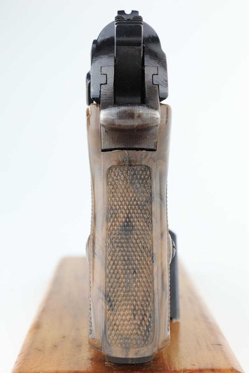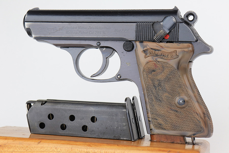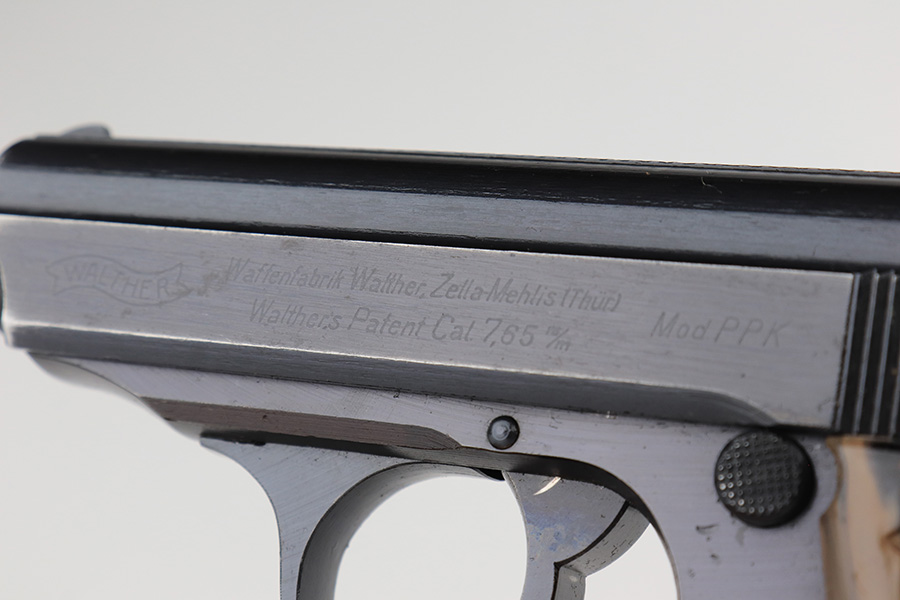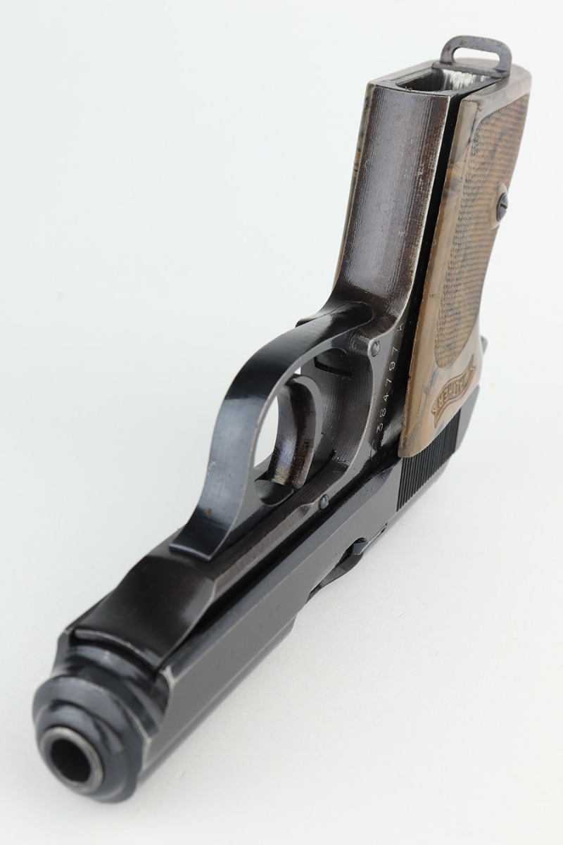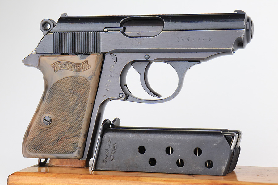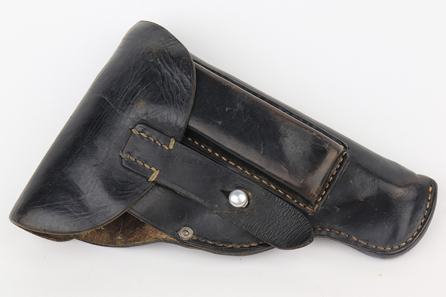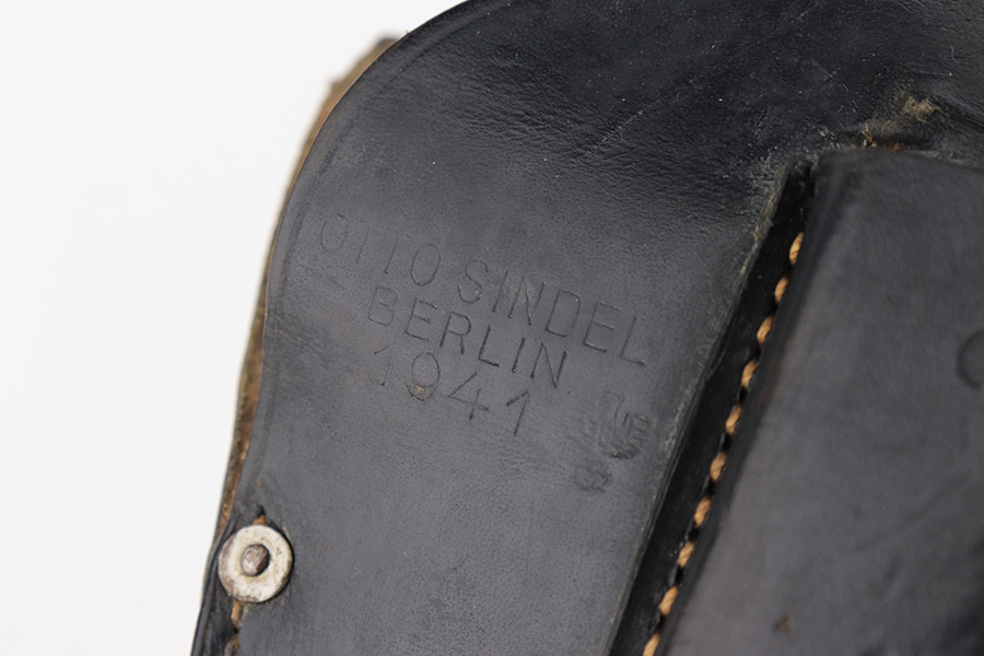 2/15/23 – This is a near-mint Walther PPK that was issued to the German Police in 1943. Eagle/C acceptance mark on frame. It has 97-98% of the military blue remaining with minor muzzle wear on both sides of the slide and a little thinning on the front strap. Mint bore. Very cool looking gray grip with nice color swirls. It’s in great condition with just a small stress crack at the top of the spine. Comes with a total of two wartime magazines. The rig is complete with an original police-style holster that is serialized on the back but mismatched to this gun. It was made by Otto Sindel in 1941.