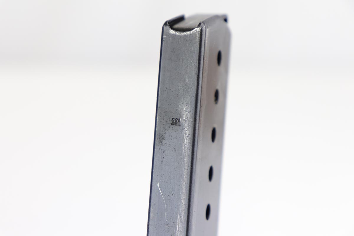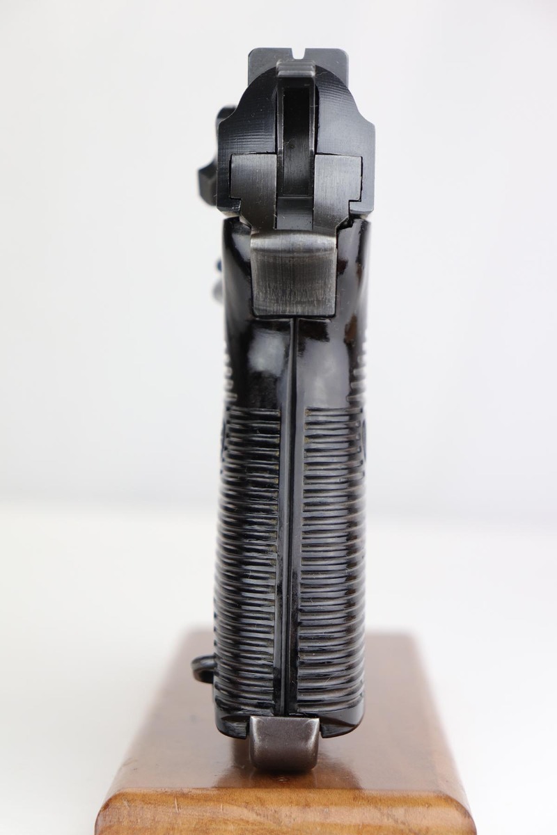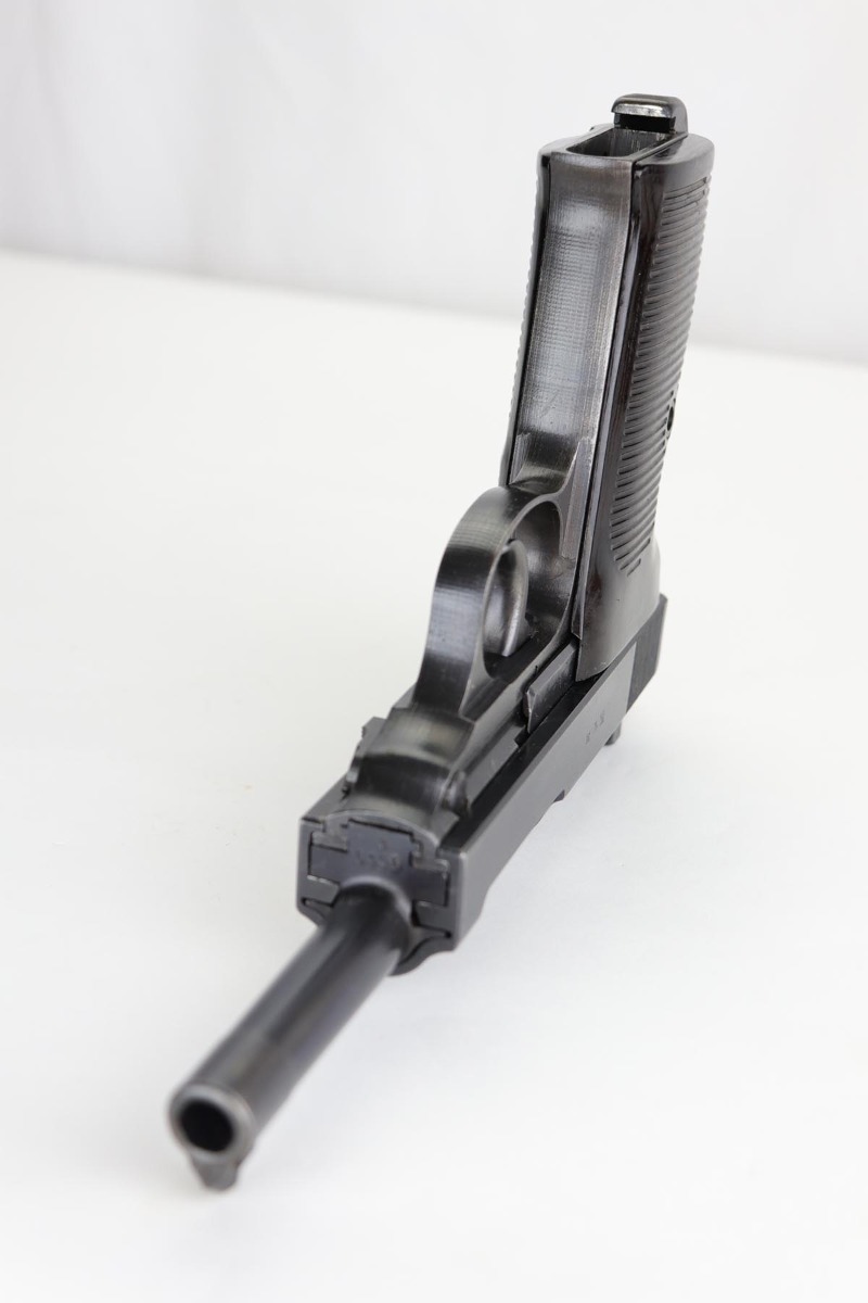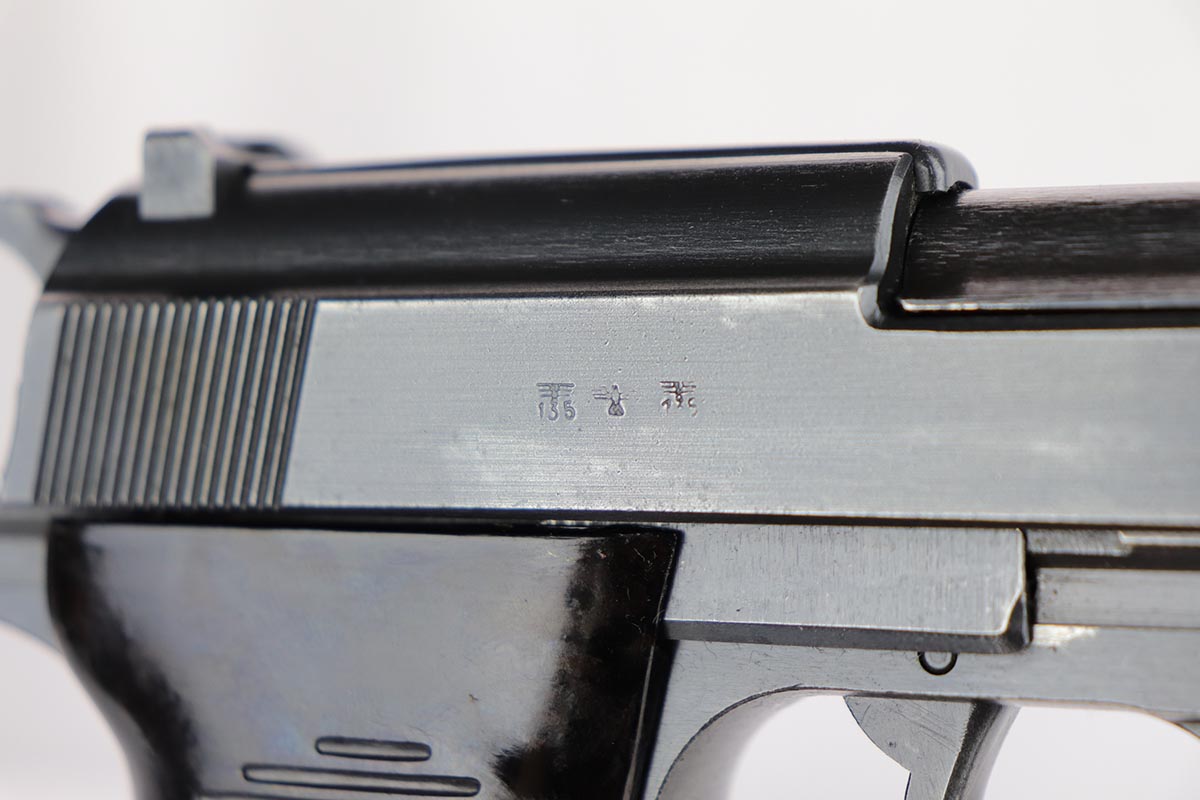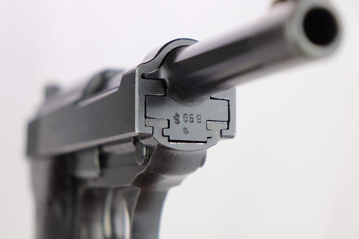 2/6/20 – This is a terrific example of a rare Mauser P.38, made in 1942, the first year of production. There were fewer than 20,000 of this variation produced, which is a very low production total for any wartime P.38 variation. This particular gun is all matching with 95-97% of the original, dust blue finish remaining. There is minor finish loss on the left side of the barrel, and a little more on the right side of the slide. Mint bore and good mechanics. Excellent grips and a Mauser made magazine.