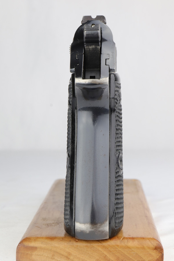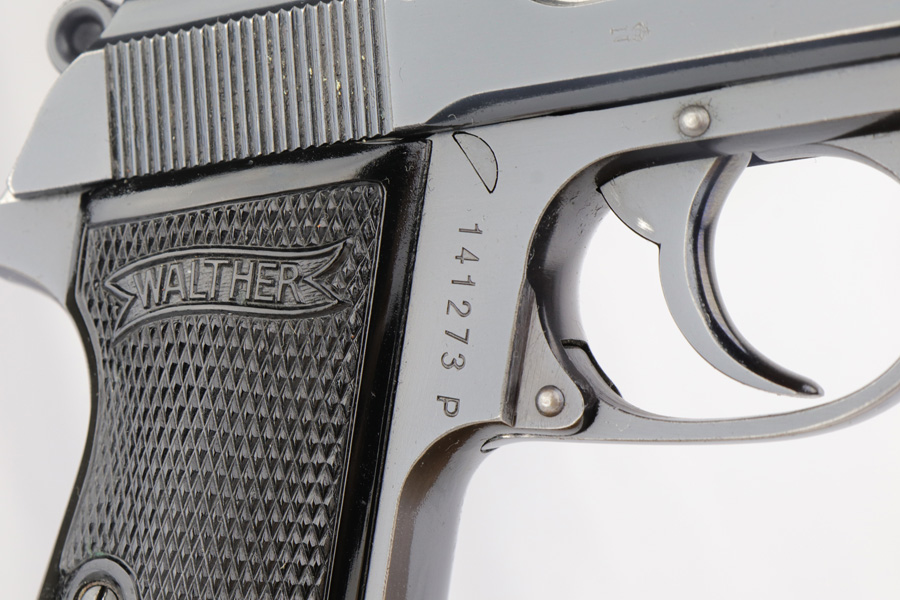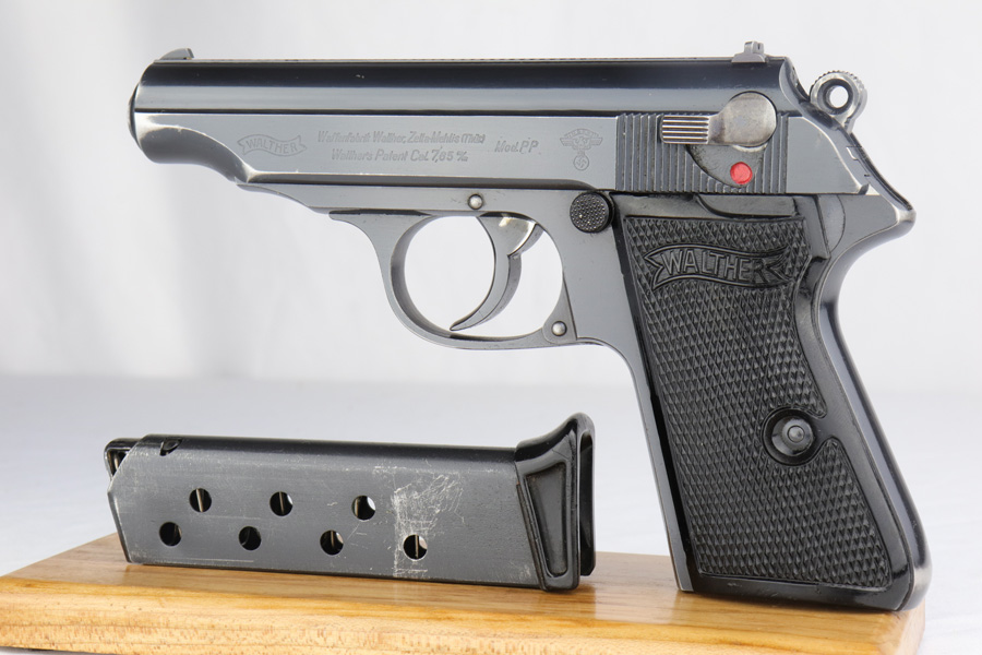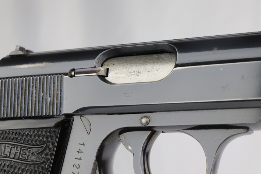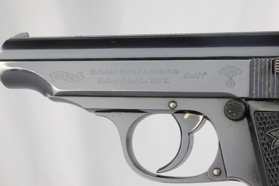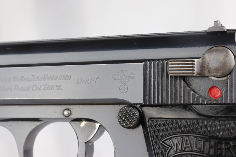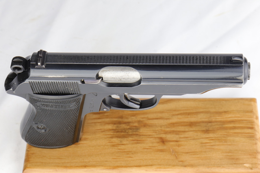 3/1/19 – This is an excellent, rare Walther PP from the WW2 era.  It is NSKK marked and issued, which was the designated official transportation branch of the NSDAP.  There were about 3,500 such pistols issued, and ~100 reported serials. This pistol is all original and correct with about 95% blue remaining.  The majority of the finish loss is found on either of the straps, with minor muzzle and high edge wear on the slide.  Excellent grips and magazine.  Crown/N proofs on slide and frame.  Excellent bore.