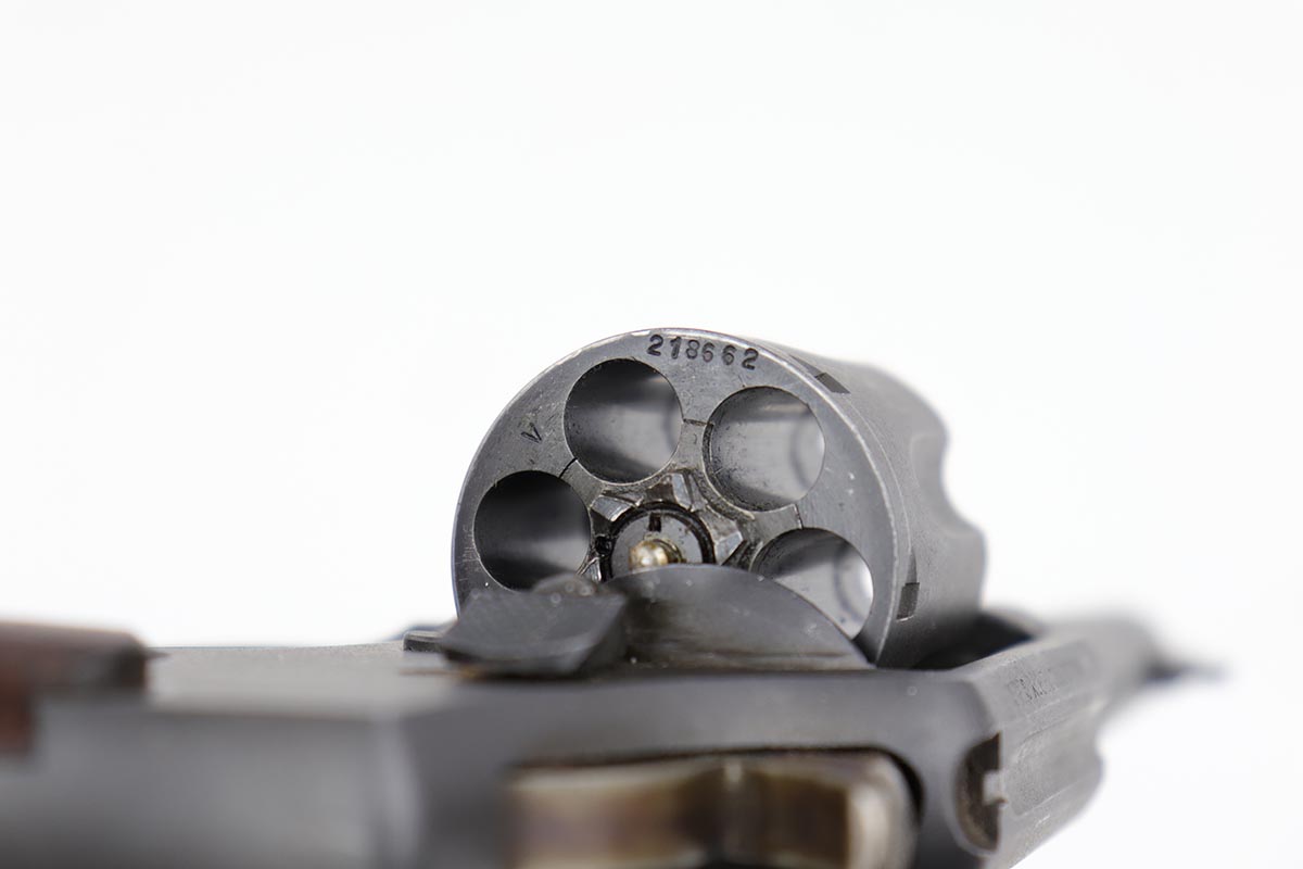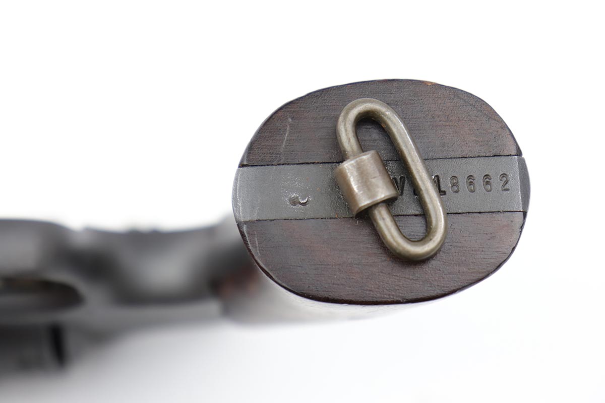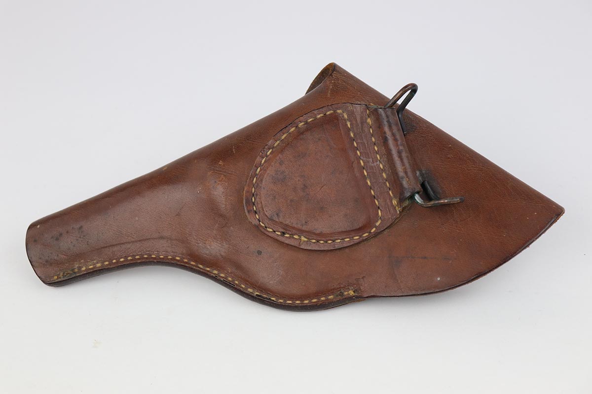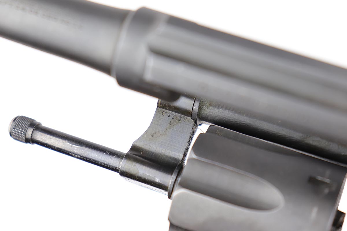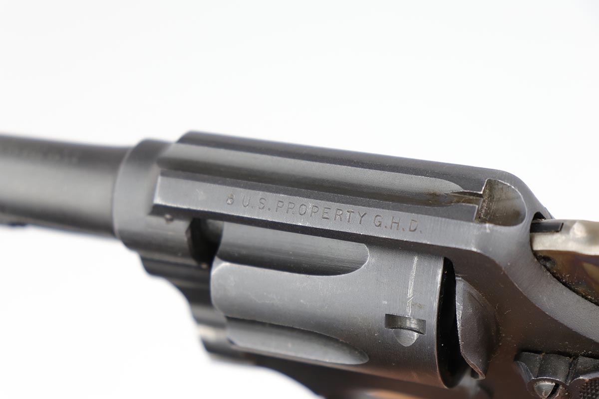 5/9/19 – This is an excellent Smith & Wesson Victory Model from World War II. It is U.S. Property marked and G.H.D (Guy H. Drewry) inspector marked. The original finish is about 97% with minor thinning from the holster and various scuff marks. Minty bore. Made from 1942 to 1944, with a production run of ~500,000. They were standard issued side arms for US Navy and Marine air crews due to their size and ease of operation. It is .38 S&W special. Super smooth action. Comes with excellent, period original holster.