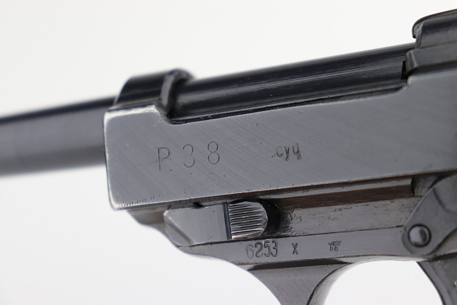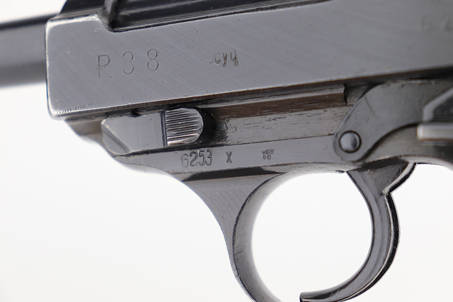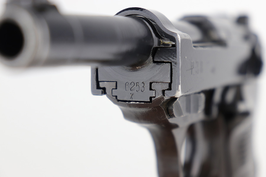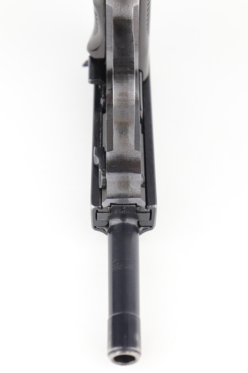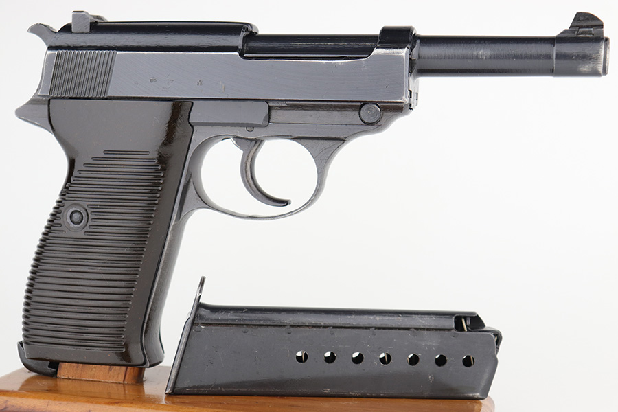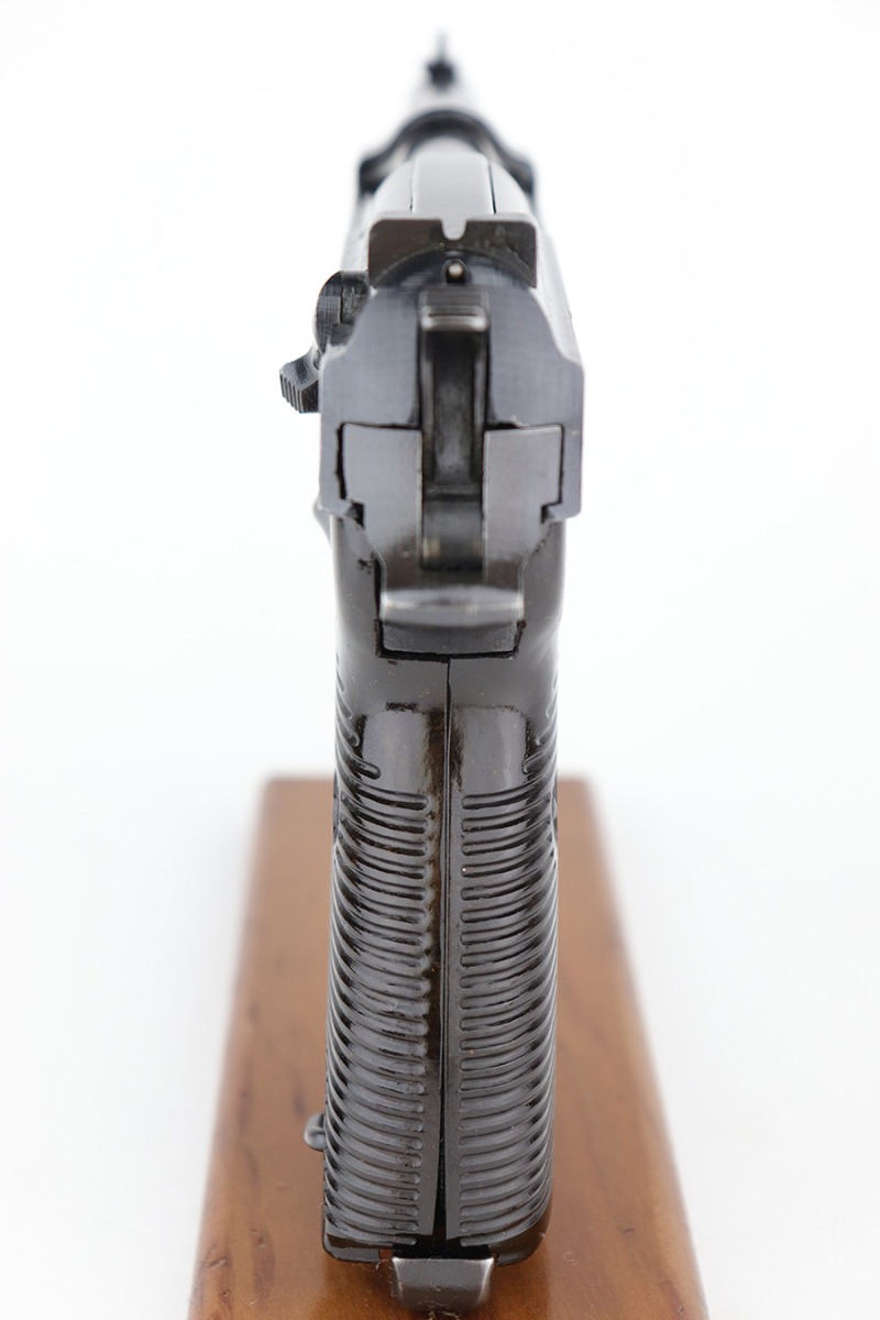 1/5/23 – This is a near-mint Spreewerk P.38 from December of 1944. All matching and original with 98% of the blue remaining. Minor edge wear around the muzzle and on the front edges of the slide. Strong, shiny bore. Good mechanics, including the de-cocker. Magazine marked P.38v on the body. Minty brown grips.