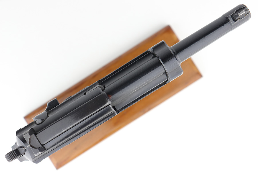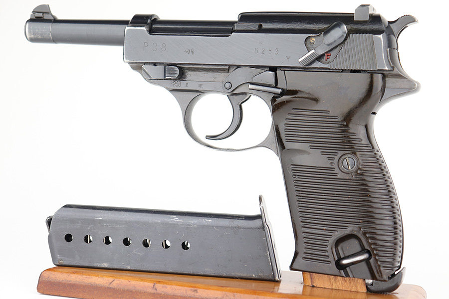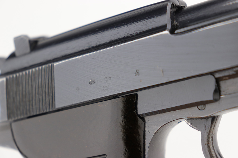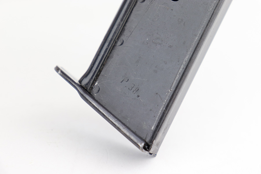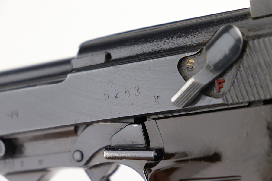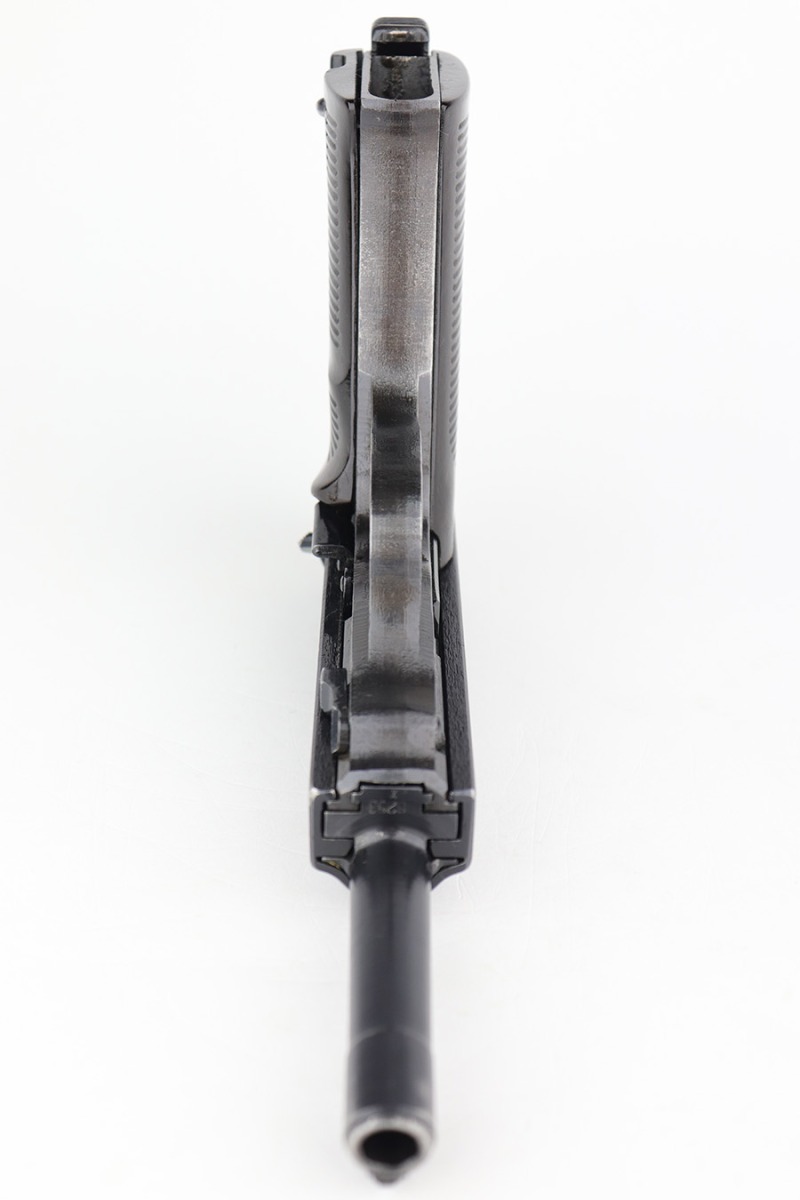 1/5/23 – This is a near-mint Spreewerk P.38 from December of 1944. All matching and original with 98% of the blue remaining. Minor edge wear around the muzzle and on the front edges of the slide. Strong, shiny bore. Good mechanics, including the de-cocker. Magazine marked P.38v on the body. Minty brown grips.