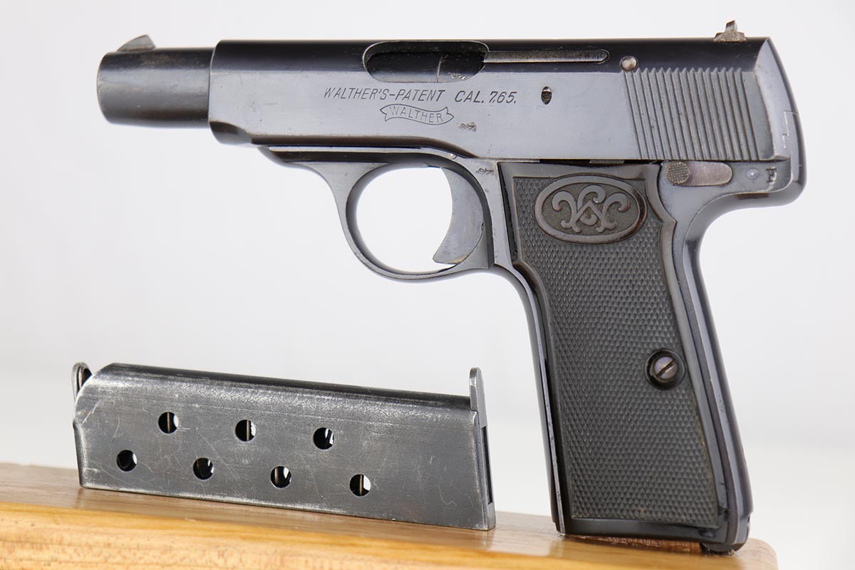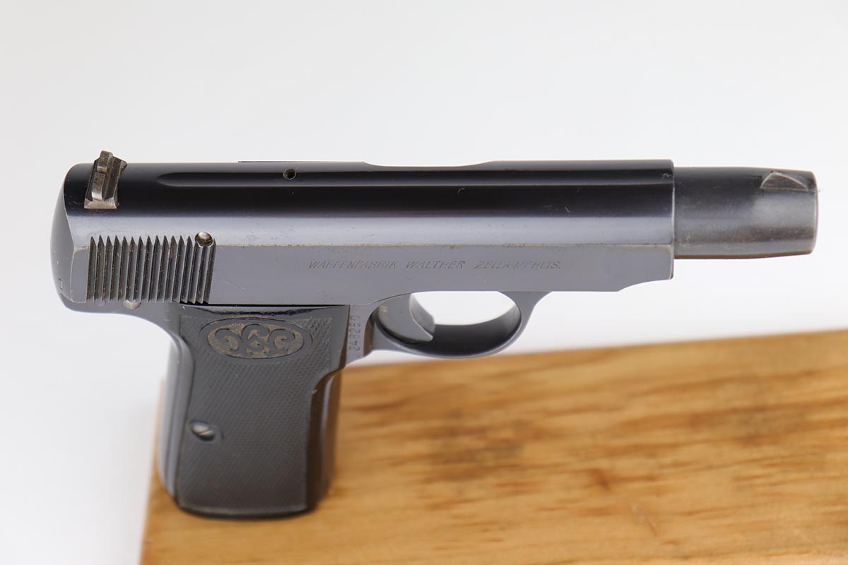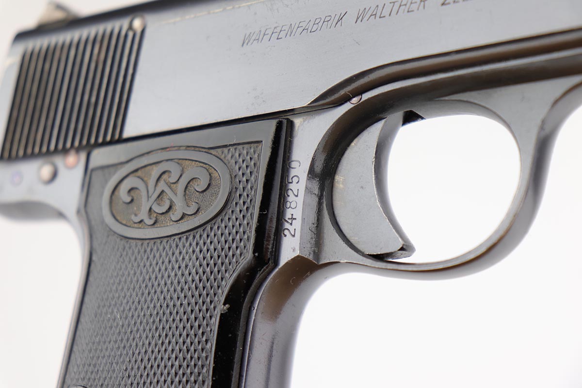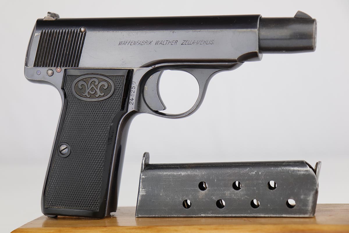 5/8/19 – This is a fantastic example of a Walther Model 4 in all matching and original configuration. Made around 1922, this pistol retains 98% original blue, with minor edge thinning and some patina around the muzzle. Correct Walther banner magazine. Excellent grips and minty bore. Tough one to upgrade.
