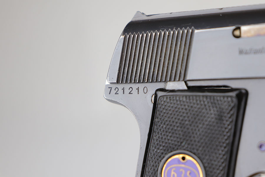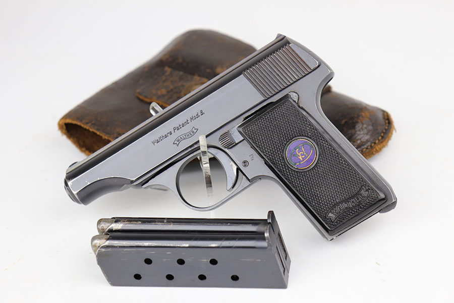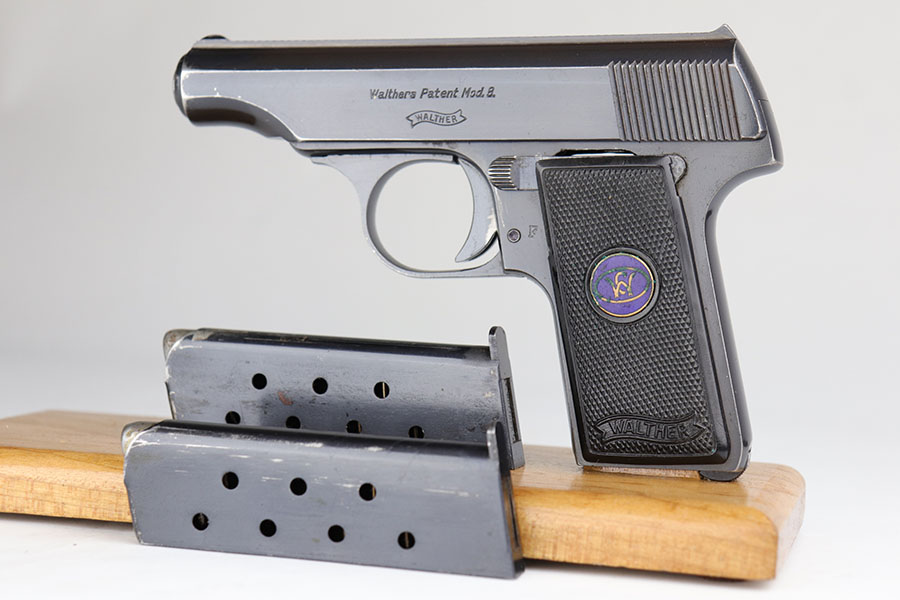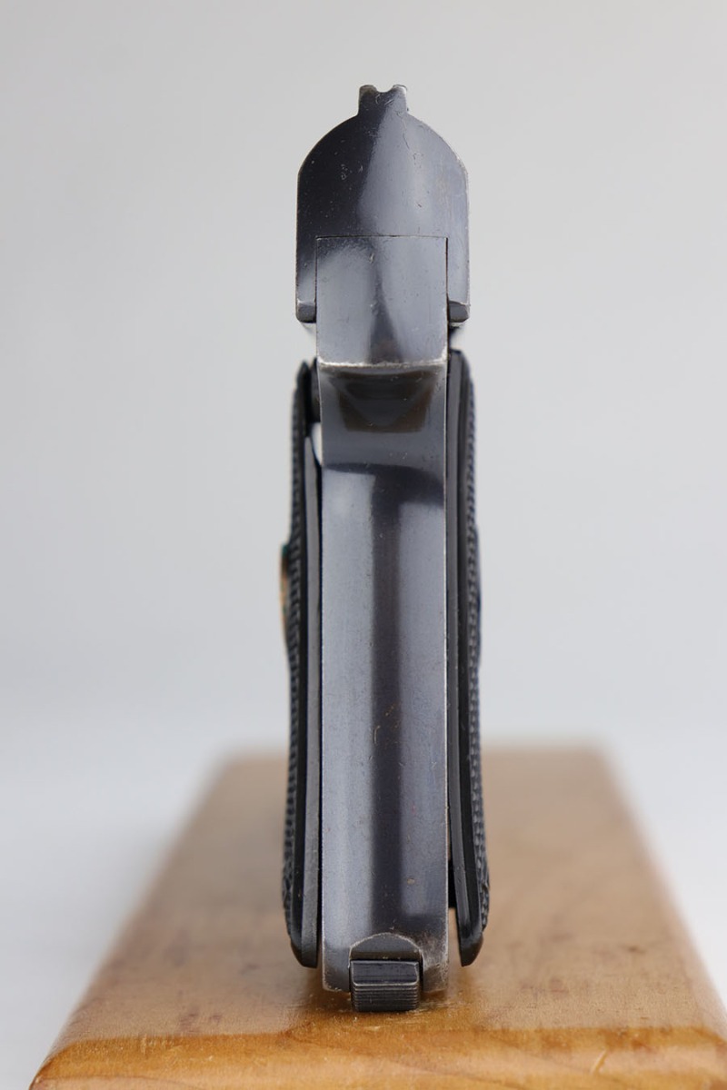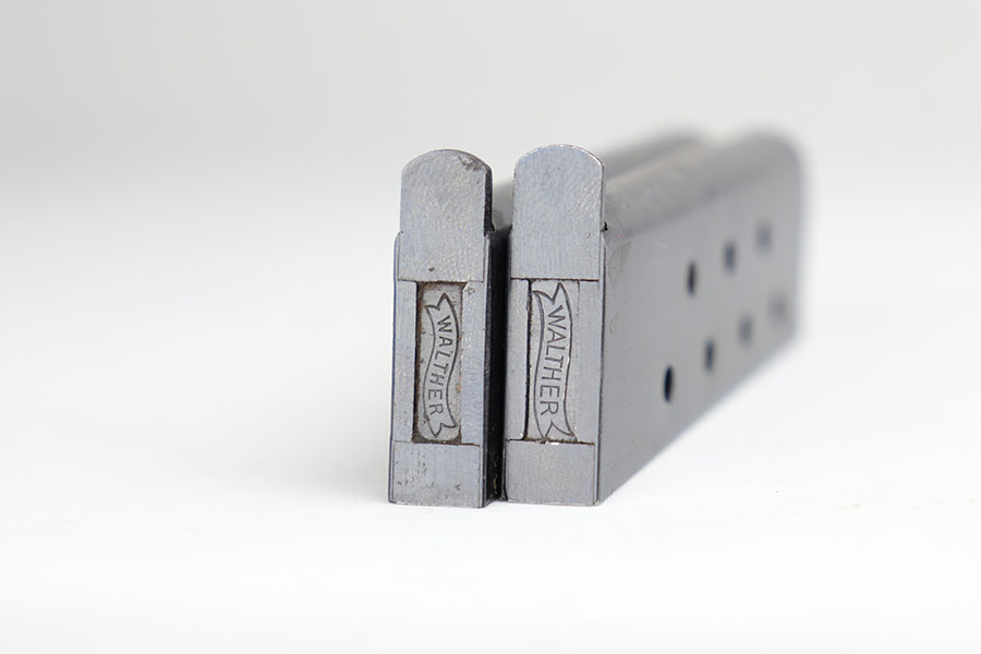 4/29/20 – This is a terrific example of a Walther Model 8 rig with spare magazine and holster. It’s a third variation, first run example, one of only about 8,000 of this variation. The pistol has 97% of the original blue with standard high edge wear from being in the holster. Excellent grips and bore. Scarce, original holster with Akah marking. Both magazines have Walther banner on base.