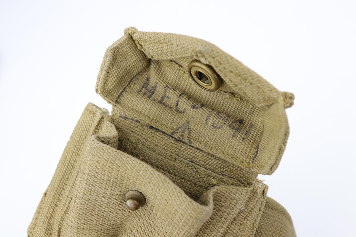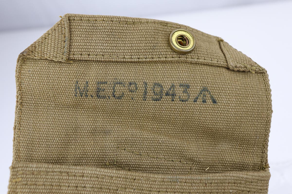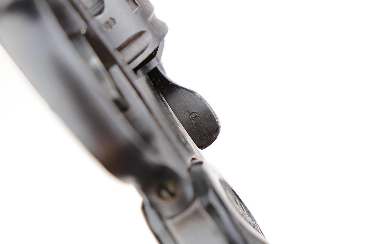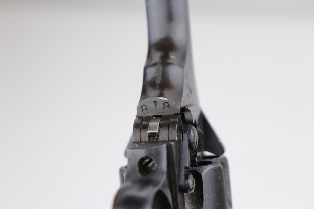 9/27/19 – This is a near-mint Webley Mark IV revolver rig from 1943, with original holster, cleaning rod, belt and ammo pouch. The gun is all matching (frame, barrel, cylinder) and retains 98-99% of the original blue, with tiny hints of high point wear. Minty bore and excellent grips. The ammo pouch is 1941 dated inside. Holster is 1943 dated. An all-around excellent example.