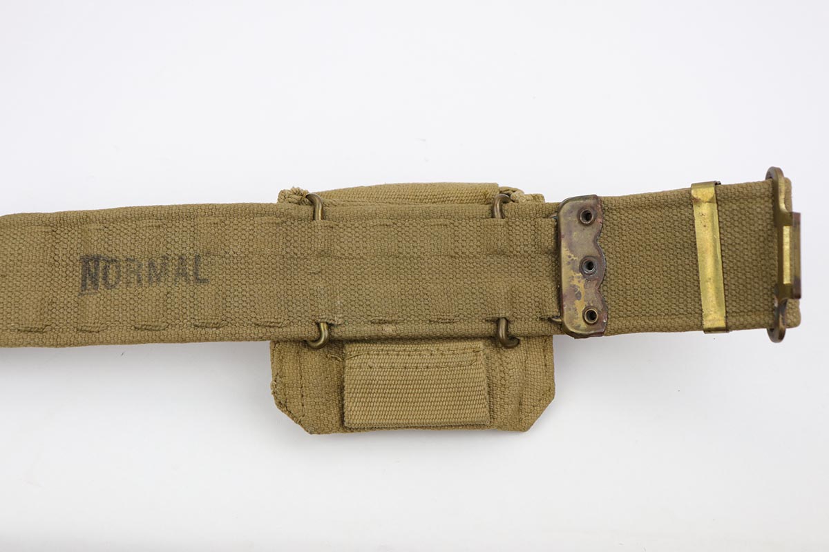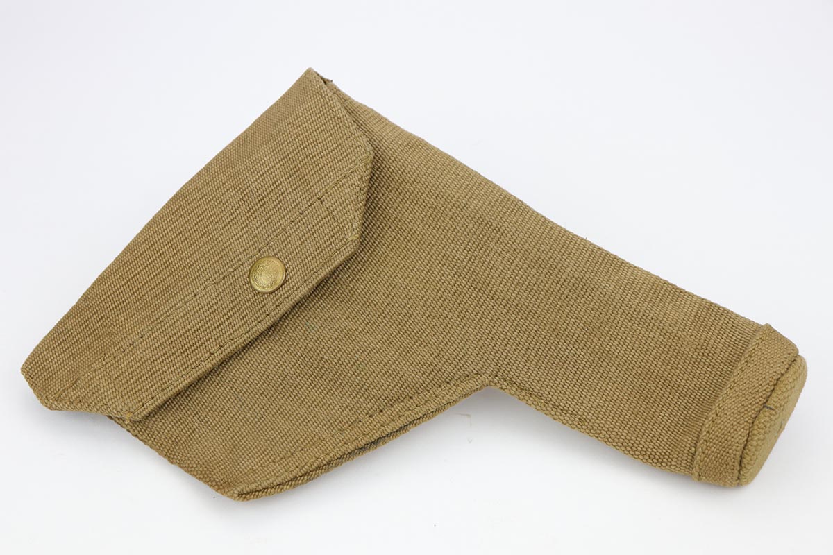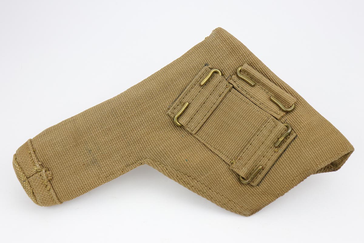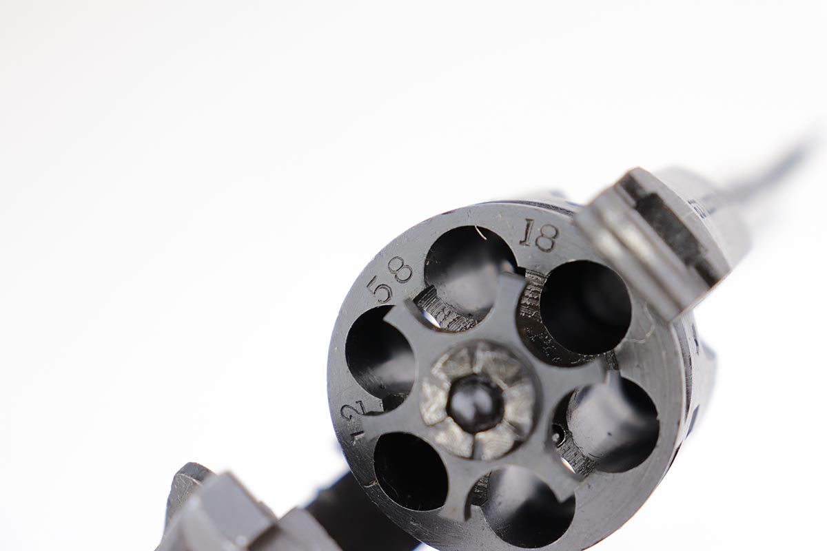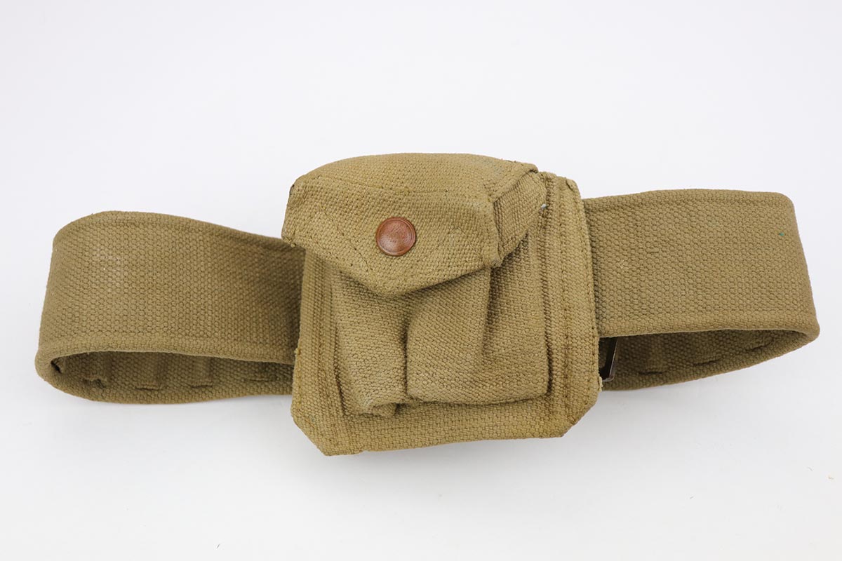 9/27/19 – This is a near-mint Webley Mark IV revolver rig from 1943, with original holster, cleaning rod, belt and ammo pouch. The gun is all matching (frame, barrel, cylinder) and retains 98-99% of the original blue, with tiny hints of high point wear. Minty bore and excellent grips. The ammo pouch is 1941 dated inside. Holster is 1943 dated. An all-around excellent example.