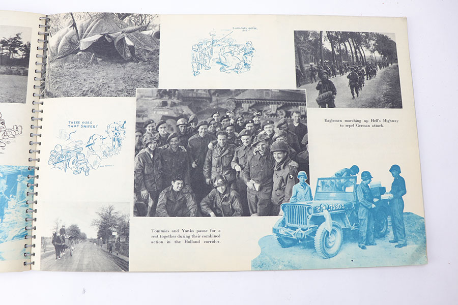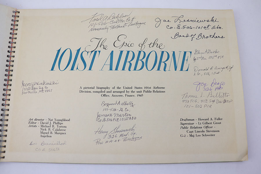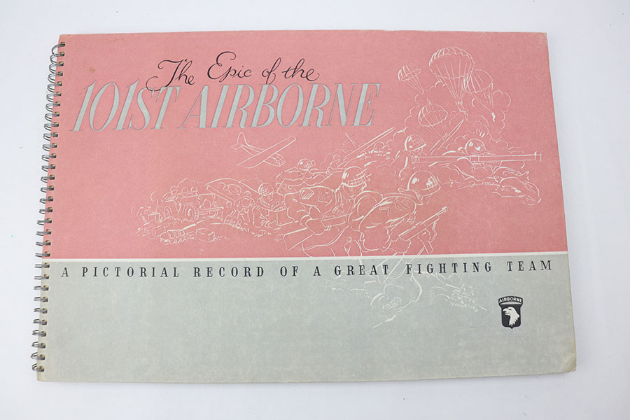 8/26/20 – This is an original copy of the large format spiral bound book entitled: The Epic of the 101st Airborne. Printed by the Public Relations Office in France. This is an incredible piece of US history, and a pictorial biography of the US 101st Airborne. The pages are all in tact and in excellent condition. The content is primarily pictorial and depicts the chronicles of the 101st Airborne during WW2. 144 pages total. Inside the front cover are several signatures of WW2 vets, including a variety of 506th Airborne soldiers who also participated in the Normandy invasion.