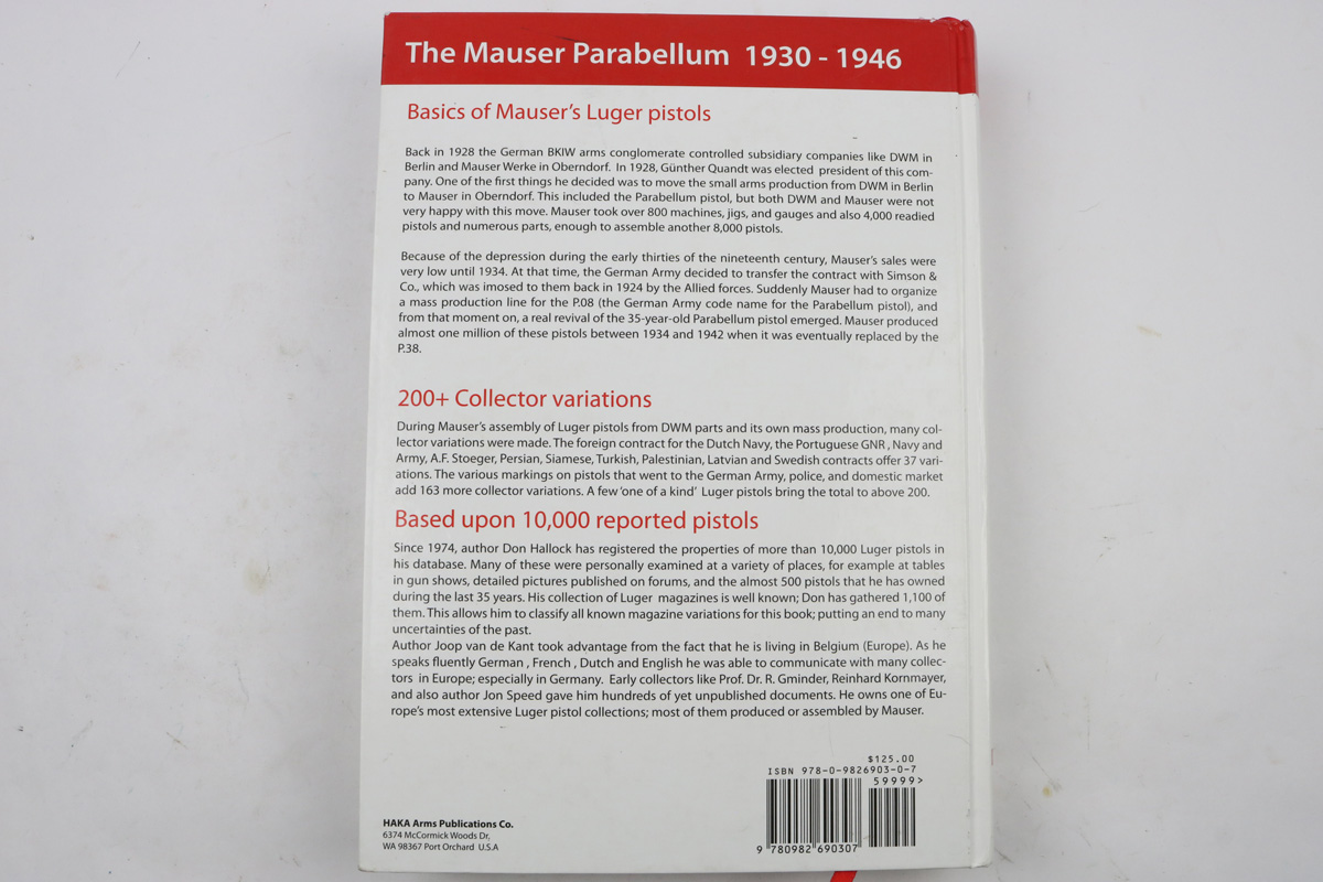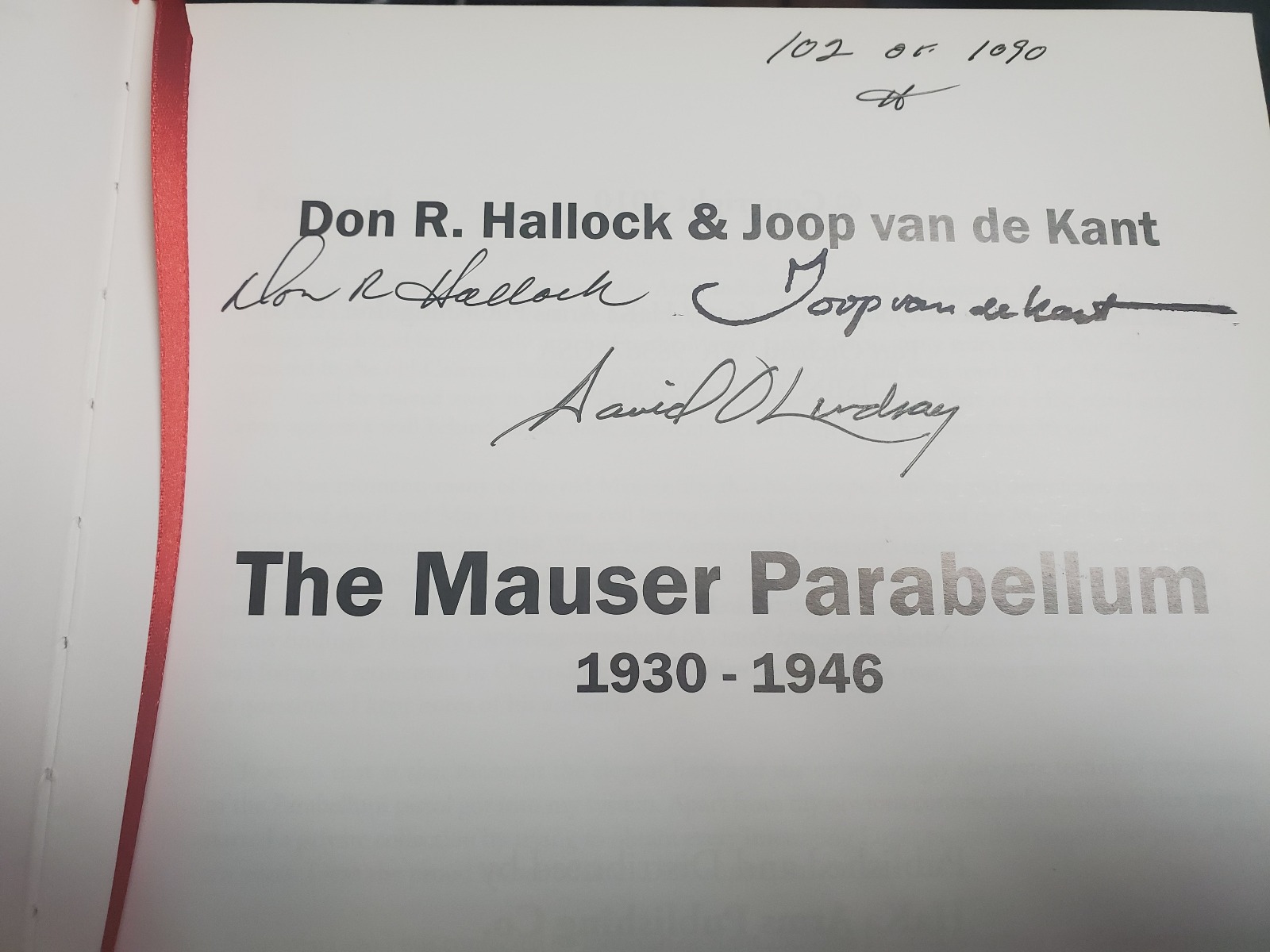 1/15/21 – The Mauser Parabellum is a hardback book written by Don R. Hallock and Joop van de Kant. Printed in 2010 and is in excellent condition. Book contains over 700 pages with black and white and colored photos within. All pages are in excellent condition. The interior cover is signed by both authors as well as David Lindsay (a respected and very knowledgeable collector, who is the leading source of information on Luger tools) and hand numbered 981 out of 1090.