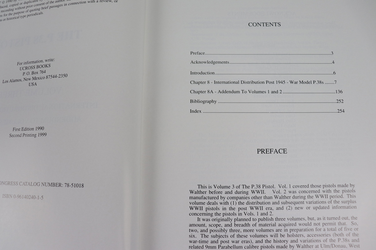 10/3/18 – This is Buxton’s complete P.38 book set. Each volume has an embossed gold colored P.38 Pistol on the front cover. There are hundreds of black & white photographs that clearly show the markings on the guns. Volume One, The Walther Pistols 1930-1945 has 328 pages. Volume Two, The Contract Pistols 1940-1945 has 247 pages. Volume two, for whatever reason, is the scarcest of the 3 volume set. Volume Three, International Distribution 1945-1990 and Addendum to Volumes One & Two has 270 pages. The author recently passed away and there will be no more of these printed.