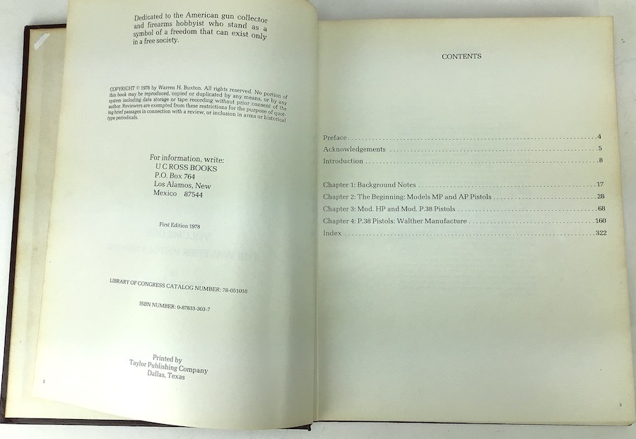 11/2/23 – This is a First Edition copy of “The P.38 Pistol” Volume 1 by Warren Buxton. The book is in great overall condition and has some minor use wear on exterior covers. The interior pages are slightly yellowed around the edges.