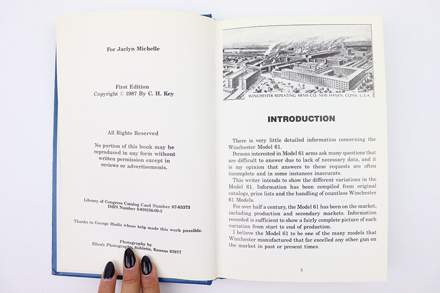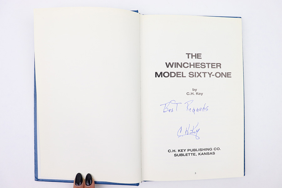 10/27/22 – This is an original first edition copy of C.H. Key’s book, “The Winchester Model Sixty One”. Signed on the interior cover by the author as shown. Excellent condition.
