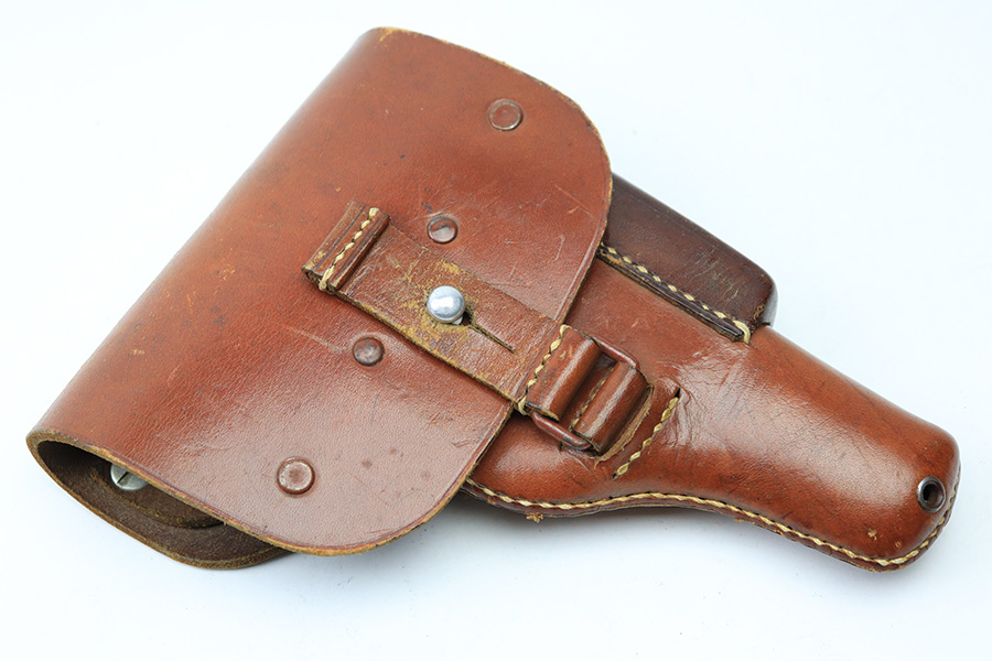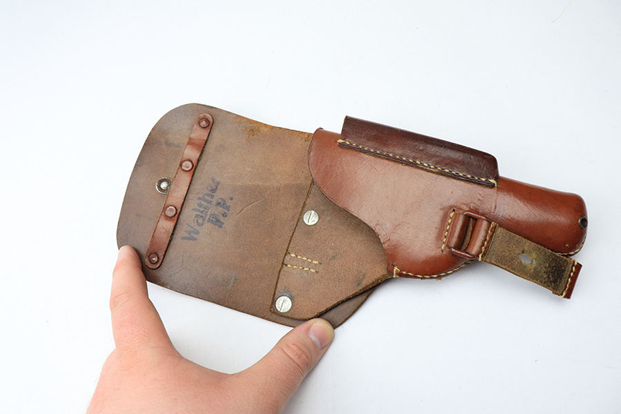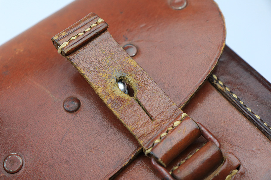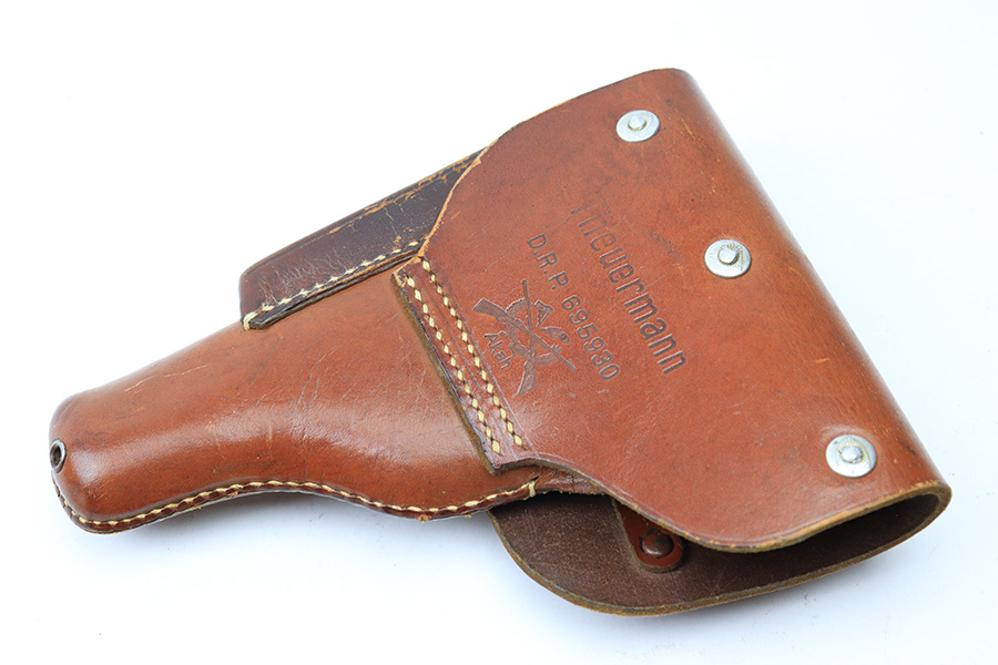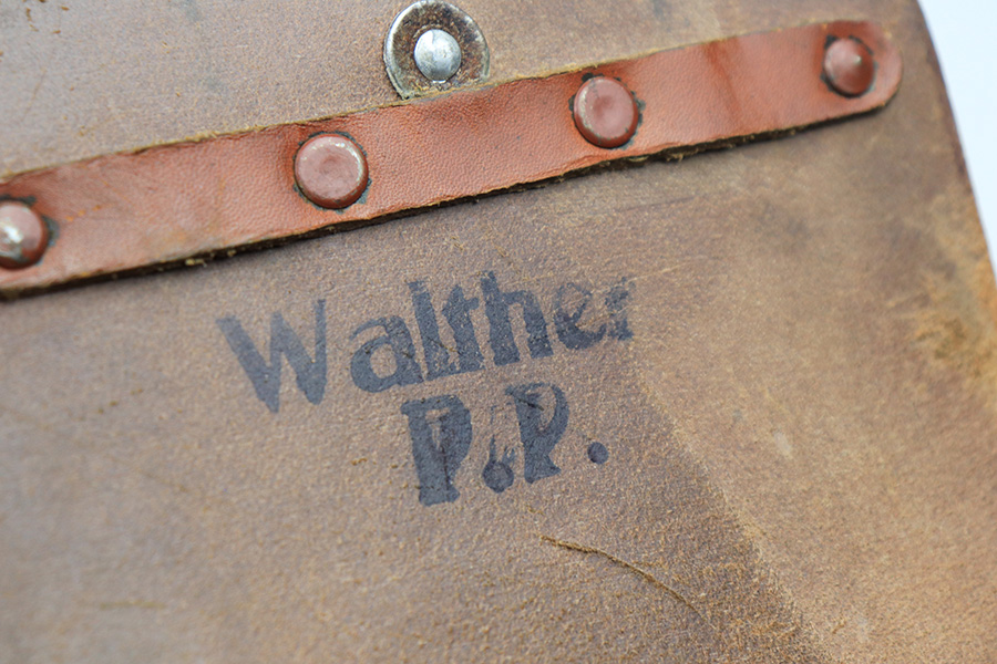 6/2/22 – This is a rare variation brown Theuermann AKAH Walther PP holster. These holsters were often paired with Luftwaffe issued pistols, however this Theuermann holster is unique compared to other examples we’ve encountered. What makes this holster unique is the lack of interior lift straps and stitching. Instead, the holster is attached with aluminum rivets. This may be a wartime “ersatz” type effort to expedite production or an experimental example. There’s no evidence of previous stitching holes where the rivets are, which tells us this must be factory. The holster leather is in great condition throughout with no major issues and clean interior. The interior ink stamp is still visible. Maker stamped and Theuermann stamped on the back leather as shown. No stitching issues.