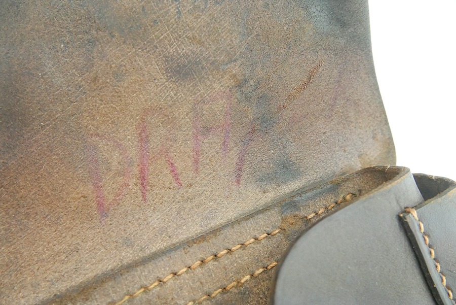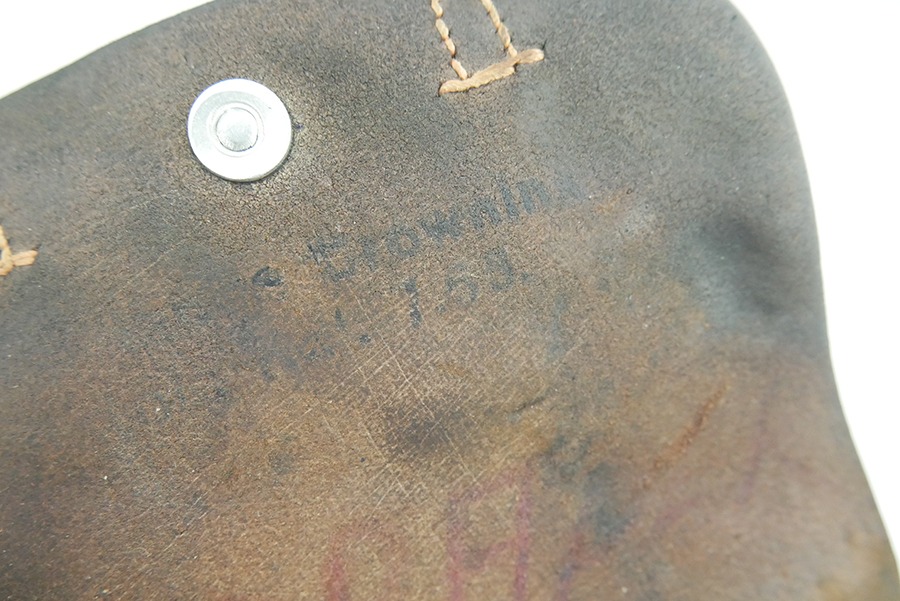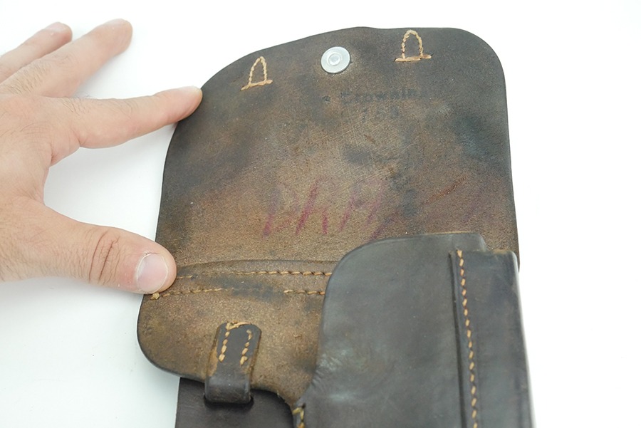 10/29/24 – Original and great condition dropping style holster for the FN Browning M1922. Stamped on the sliding belt loop “THEUERMANN D.R.P. 695930”. Faint ink stamped under the closure flap “BROWNING 7.65MM” Red ink “DRP” hand written on the interior flap. Minor wear to the top stitches just under one loop, but it is secure.