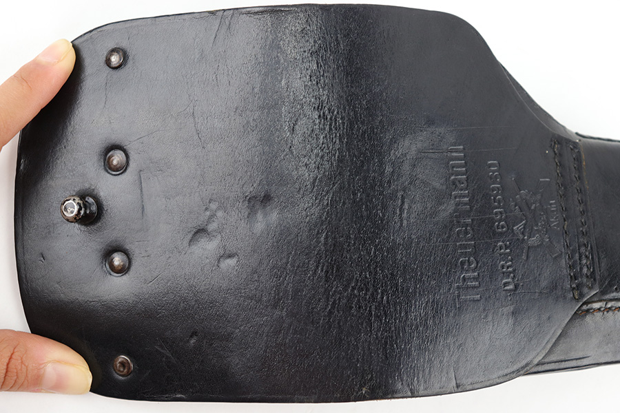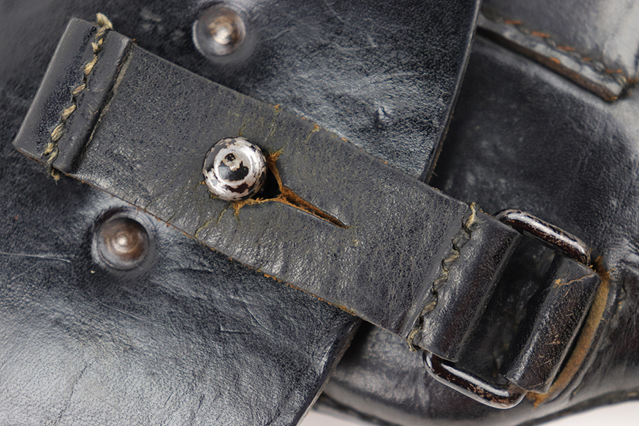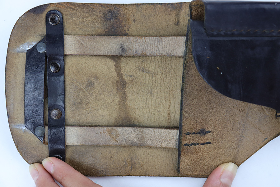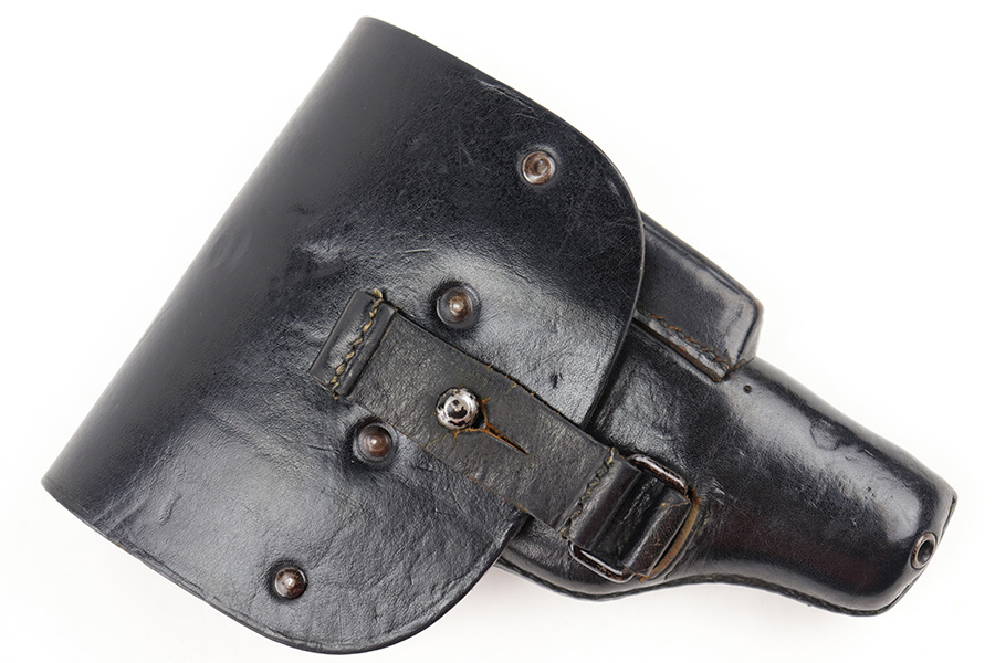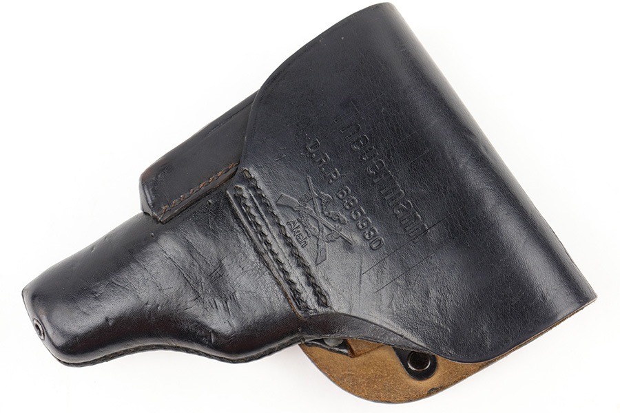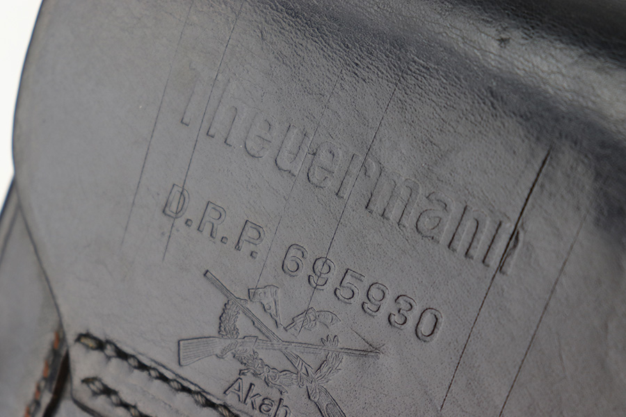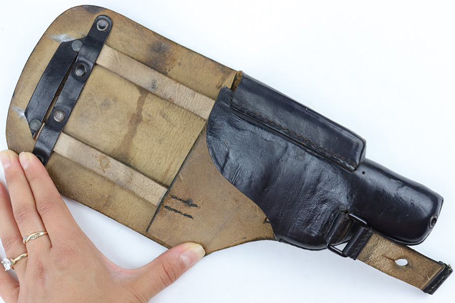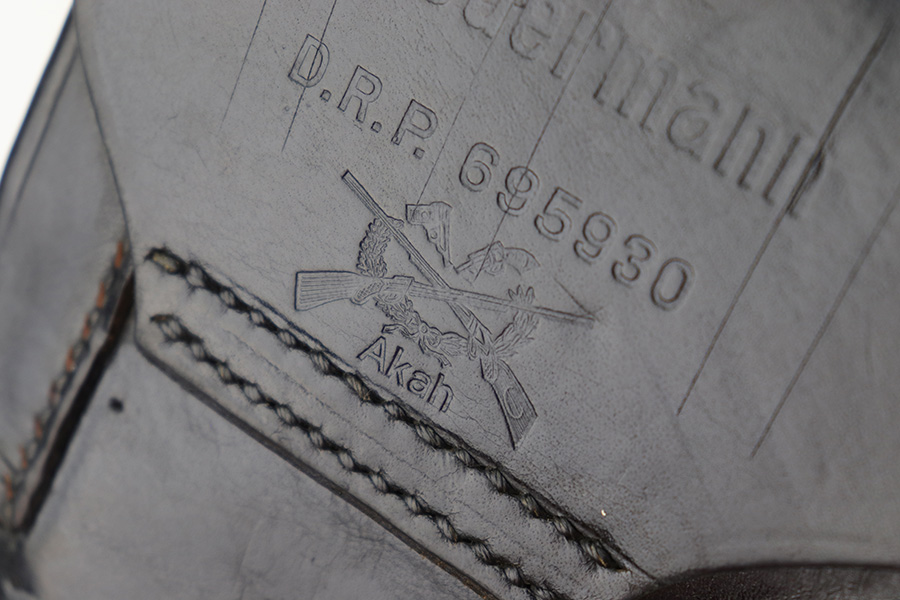 7/24/23 – This is an original, excellent condition and rare variation Walther PPK Holster. The holster is “dropping style” type 1, which refers to the internal leather pull tabs which were designed to give greater accessibility to the pistol within the holster when in awkward positions. The leather and stitching on this example is all black, which is why these are often referred to as “SS” PPK holsters. The back leather is maker stamped by AKAH with “Theuermann D.R.P. 695930”. The leather has mild pliability and light signs of use. No major issues and excellent all original stitching intact throughout.