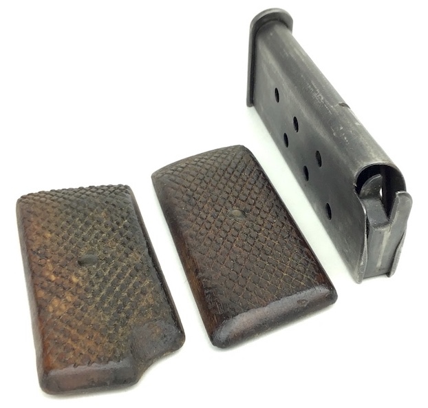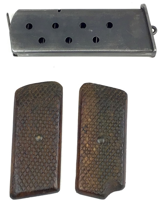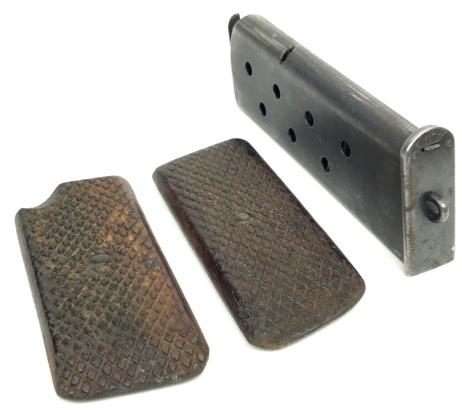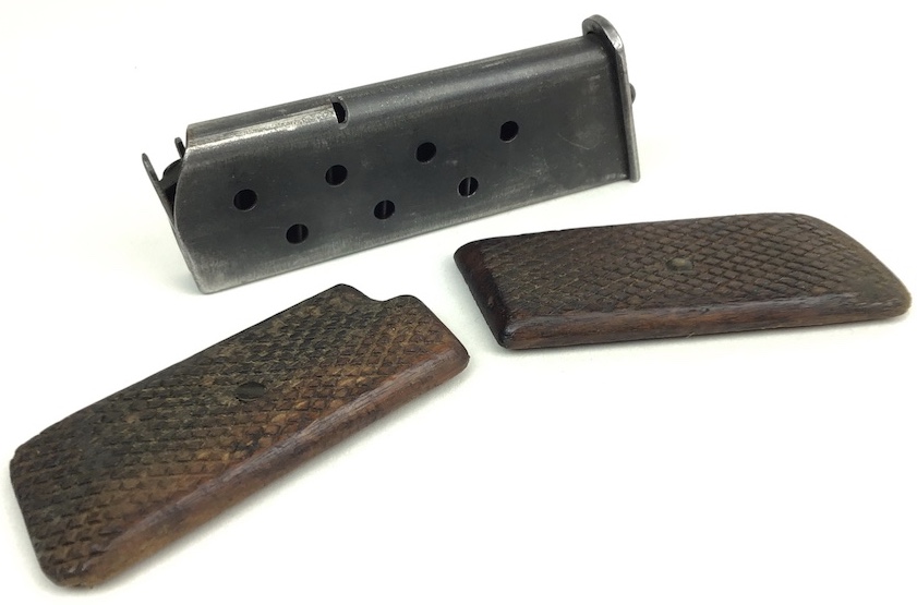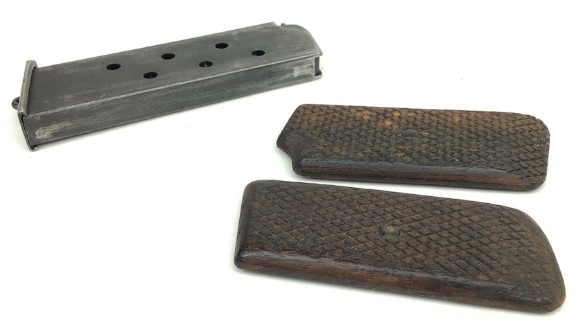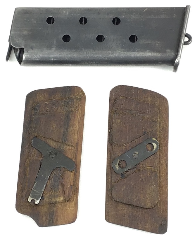 4/7/20 – Great condition magazine and wood grip panels for the Tokarev Model TT 33. Grips are in great shape with good checkering and included attachment hardware. No cracks or chips. Magazine has a strong spring. Minimal bluing wear.