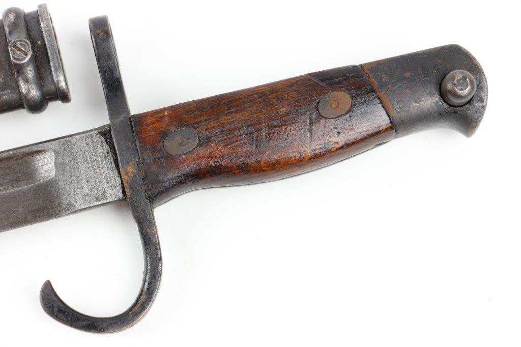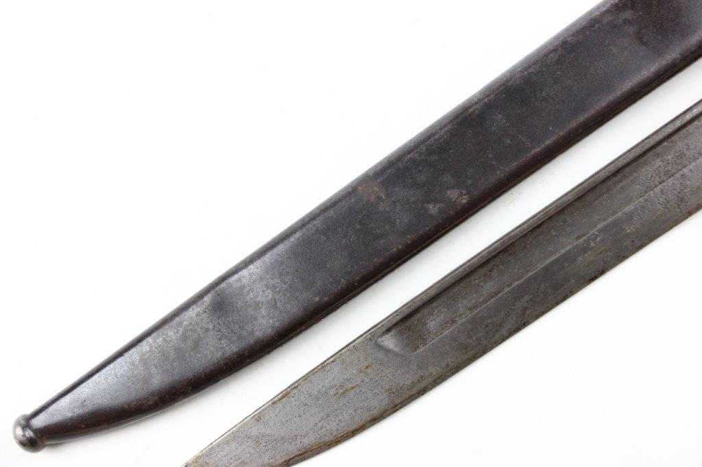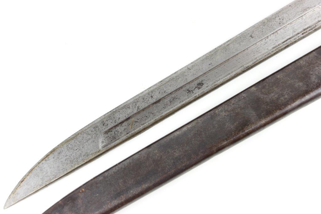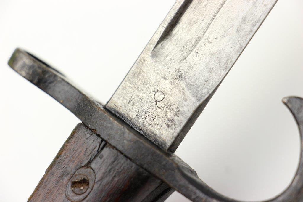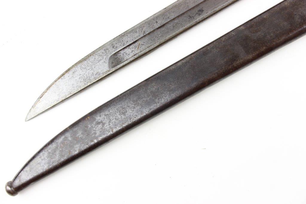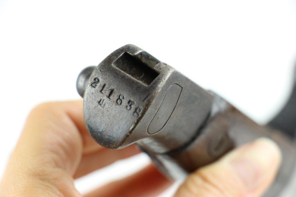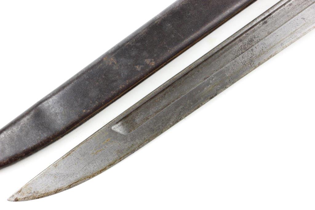 5/28/24 – This is an original, early WW2 style T30 Japanese Rifle bayonet. The bayonet comes with an original ball-tipped metal scabbard. There’s an unusual “W” marking, located just below the Tokyo Arsenal maker stamp on the base of the blade. These markings are faint and somewhat weakly struck stamps. We’re not sure the significance of the “W” marking, but it’s likely a collector oddity or test / training bayonet. This example has early features like a bird’s head pommel, screws with rivets in the grips, hooked quillion, and a bright fullered blade. Some evidence of sharpening near the tip, and the edge is fairly clean. Light pitting and patina throughout the blade, which is in great overall condition. There’s some surface rust on the pommel and natural patina throughout the hand guard / pommel area. The scabbard has natural patina and finish loss throughout but no major issues and fits the blade nicely.