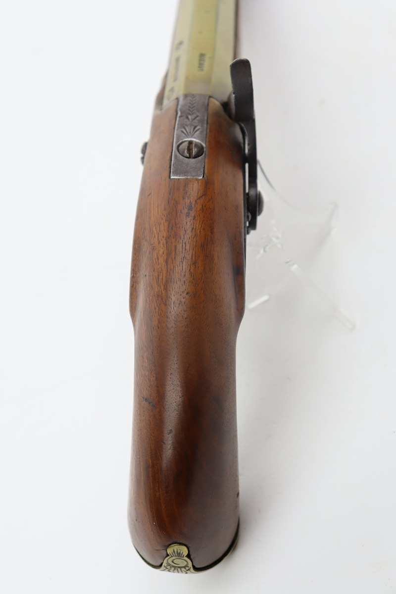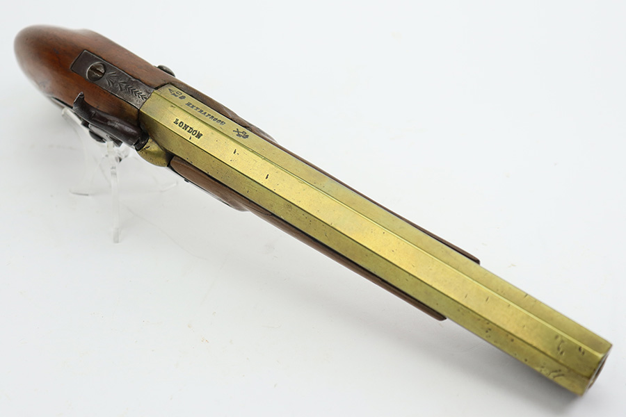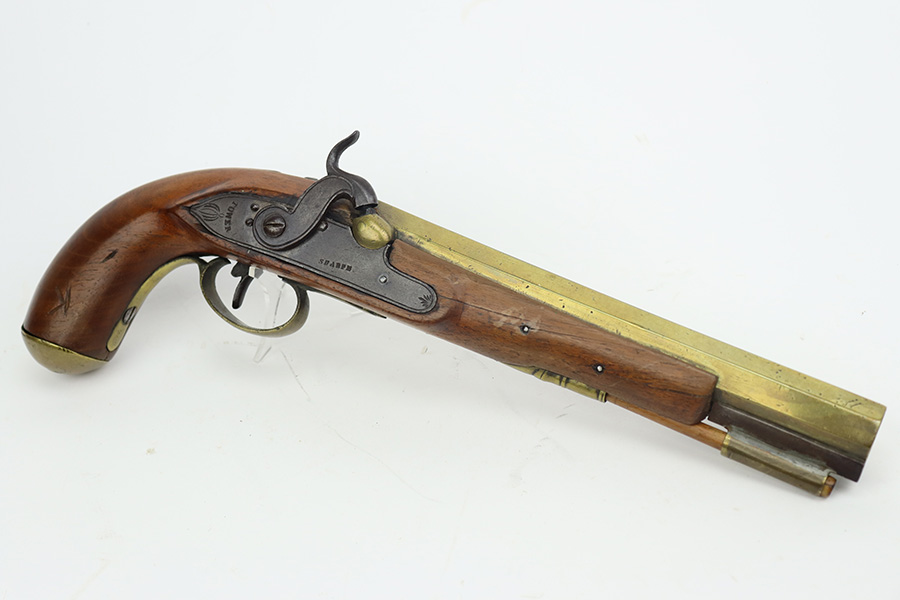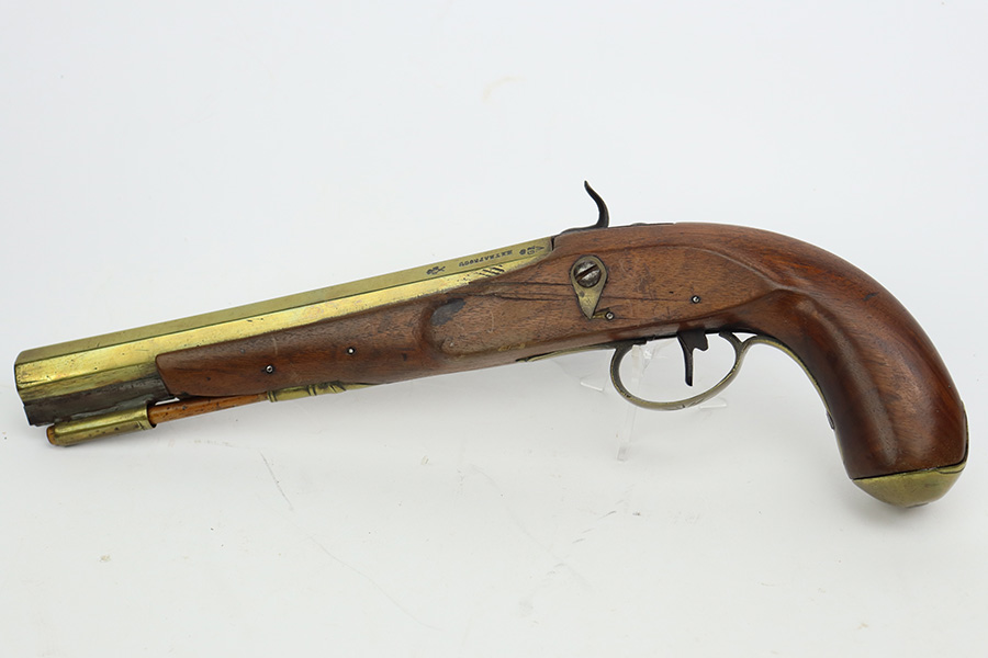 10/27/23 – Here we present an antique British Board of Ordnance Proofed “Extraproof” Flintlock Pistol by John Sharpe, made around 1812 in London England. John Sharpe was a gunmaker working from about 1808 to 1831. This pistol was later converted to Percussion or “cap and ball”, likely in the 1850’s. We are not experts on these weapons but have concluded this was a converted example based on our research.